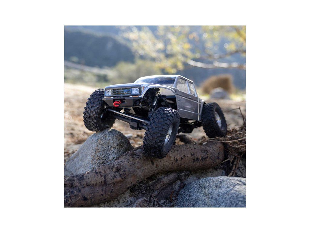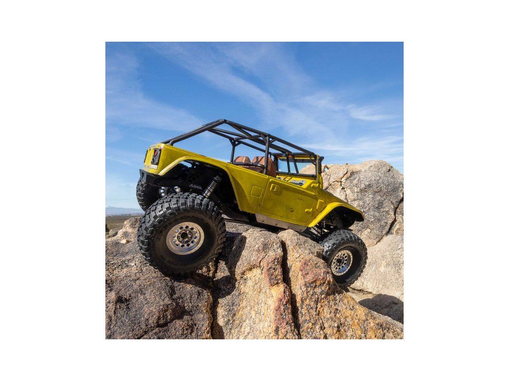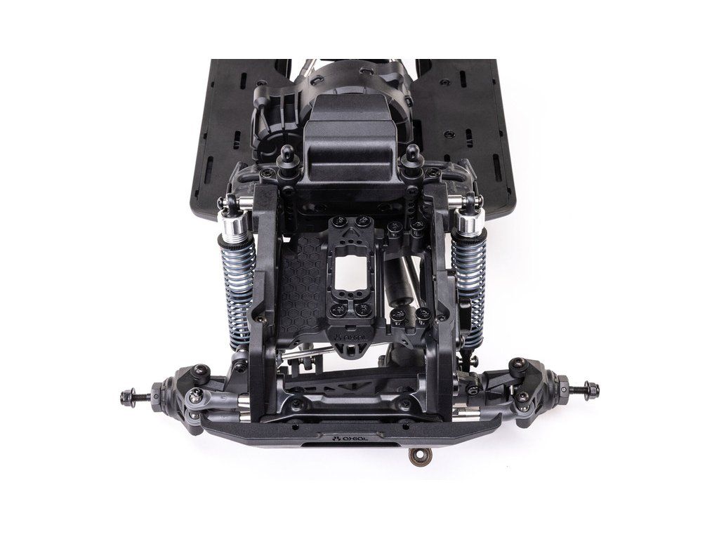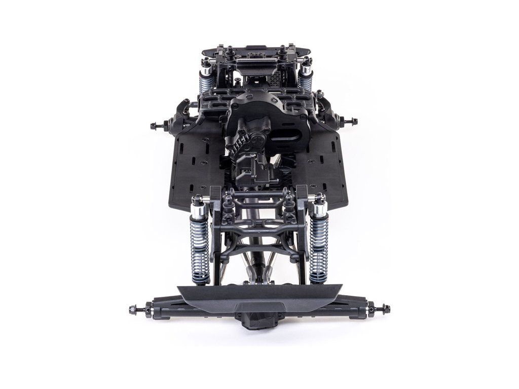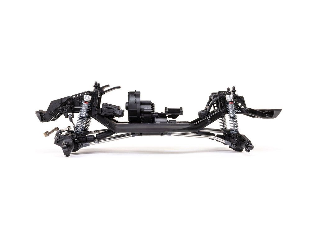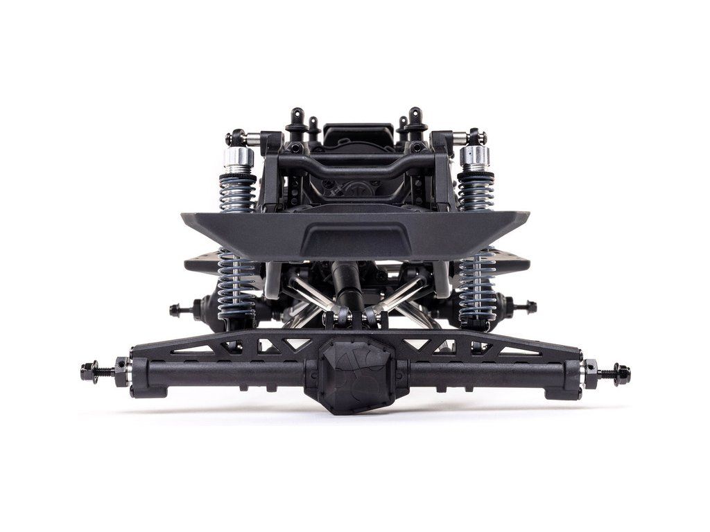 Stavebnice Axial není jen nesestavená verze RTR. Jedná se o vylepšenou verzi! Převodovka LCXU umožňuje volitelně instalovat speciální funkci pro crawlery DIG (zablokování zadní nápravy). Táhla zavěšení jsou 6 mm z nerezové oceli. Nové výkonné věže tlumičů vám nabízejí několik možností montáže pro optimalizaci odpružení. Namontujte tlumiče svisle pro lineární odpružení nebo je nakloňte pro progresivní tlumení a nižší těžiště. Dále jsou použity přímé nápravy AR45 a tři nastavitelné přihrádky pro akumulátory poskytují velkou variabilitu napájení a nastavení těžiště. Úchyty Panhard tyče umožňují i instalaci portálových náprav (prodávají se samostatně). Konstrukce podvozku je tříbodová přední s Panhardskou tyčí a čtyřbodová zadní. Toto zavěšení poskytuje velký výkyv náprav a přesnou geometrii. Instalovány jsou šikmé podvozkové prahy, díky kterým můžeme model hladce sklouznout po překážce.