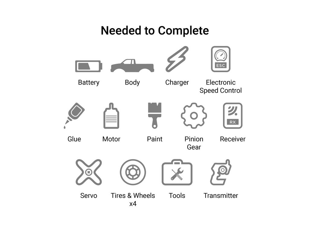 Pokud se rozhodnete pro stavbu speciálu Pro Comp Scaler 1:10 4WD, budete potřebovat k dokončení tyto komponenty: