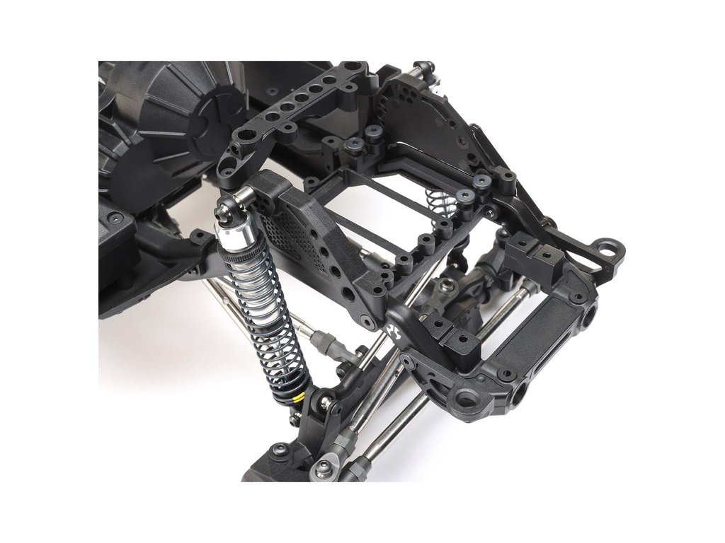 Zavěšení obsahuje 6 mm táhla z nerezové oceli a celokovové kulové čepy pro odolnost v terénu. Nastavitelné tlumiče plněné olejem mají hliníková těla se závitem a maticí pro snadné nastavení předpětí pružin.