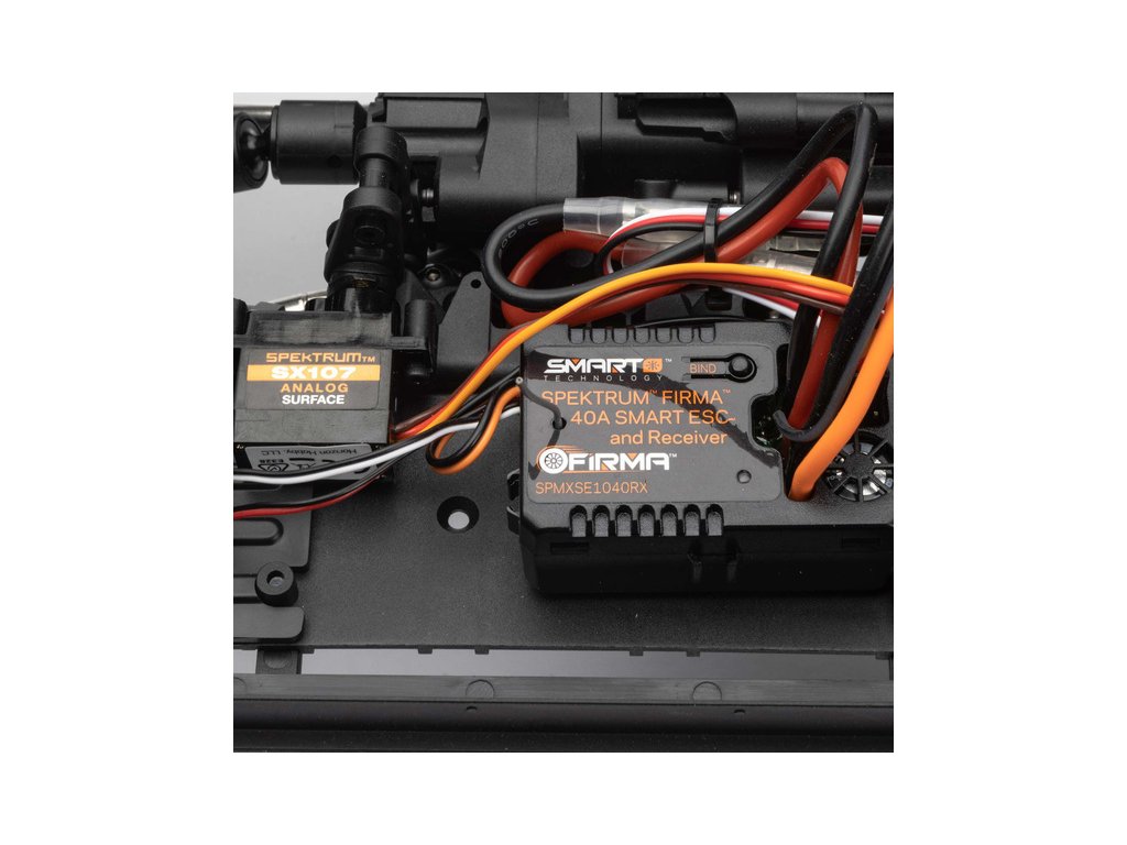 Plně sestavený RC model auta RTR je dodáván s vysílačem Spektrum™ DX3™ s exkluzivní technologií DSMR® pro vynikající dosah, odezvu a odolnost proti rušení. Je také kompatibilní s telemetrií SMART díky nainstalovaným komponentům, regulátoru Spektrum Firma™ Smart 40A a přijímačem. Pomocí sady LiPol baterií Spektrum Smart můžete sledovat kapacitu baterie na monitoru vysílače při jízdě za každého počasí a různých podmínek na trase - elektronika je chráněna voděodolným nástřikem.