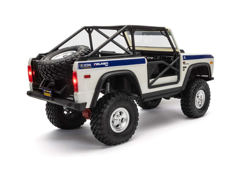 Stejně působivé jsou i detaily interiéru karosérie. V kabině najdete tvarovaná sedadla, palubní desku, řadicí páku, nožní pedály a volant se sloupkem. Pod kapotou se ukrývá replika motoru 5,0 V8, skříň převodovky a silný motor Axial® 35T. 3-dílná kola v retro stylu ve stylu beadlock, doplňují karoserii modelu Early Ford Bronco a umožňují snadnou montáž, demontáž a výměnu pneumatik bez lepení. Licencované repliky pneumatik 1,9 Falken Wildpeak M/T bezpečně překonávají překážky. Ochranný rám má upevňovací jazýčky pro další světla a plně funkční rezervní pneumatiku.