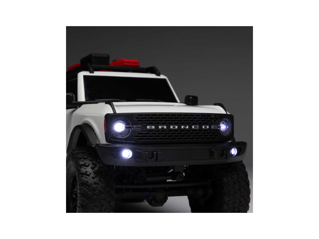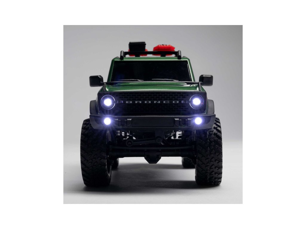 RC model auta na dálkové ovládání v měřítku 1:24 Axial SCX24 s neuvěřitelně detailní karosérií Ford Bronco 2021 a LED osvětlením. Model je vybaven víceprvkovým zavěšením s olejovými tlumiči pro jízdu v terénu. Vše potřebné je v balení. Vysílač 2,4GHz, LiPo akumulátor 350mAh 7.4V a USB nabíječ.