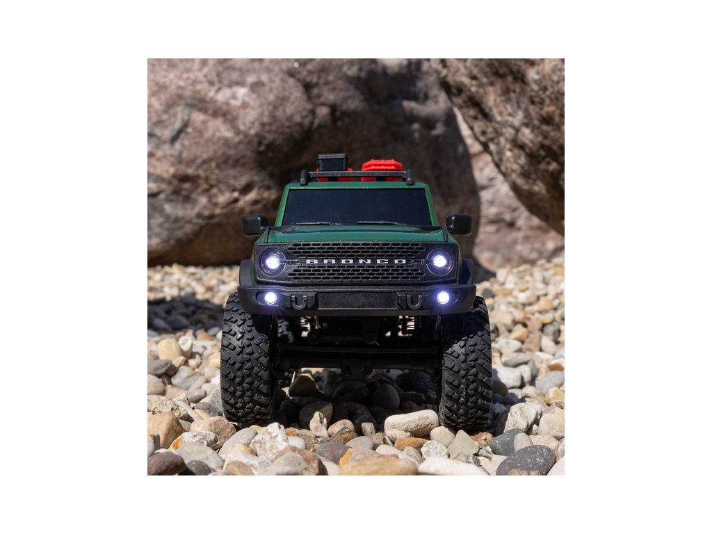 RC model auta na dálkové ovládání v měřítku 1:24 Axial SCX24 s neuvěřitelně detailní karosérií Ford Bronco 2021 a LED osvětlením. Model je vybaven víceprvkovým zavěšením s olejovými tlumiči pro jízdu v terénu. Vše potřebné je v balení. Vysílač 2,4GHz, LiPo akumulátor 350mAh 7.4V a USB nabíječ.