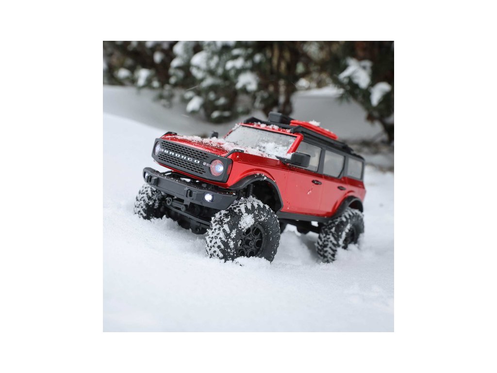 RC model auta na dálkové ovládání v měřítku 1:24 Axial SCX24 s licencovanou karosérií Ford Bronco 2021 a licencovaných pneumatikách Nitto Trail Grappler s disky Factory Ford Wildtrak. Model s pohonem 4x4 je sestaven a připraven k jízdě, vše potřebné je v balení. RC souprava 2,4GHz, motor Dynamite® 88T, LiPol baterie Dynamite 350mAh 7.4V s USB nabíječem. Díky použití moderního LiPo akumulátoru je doba jízdy přes 40 minut!