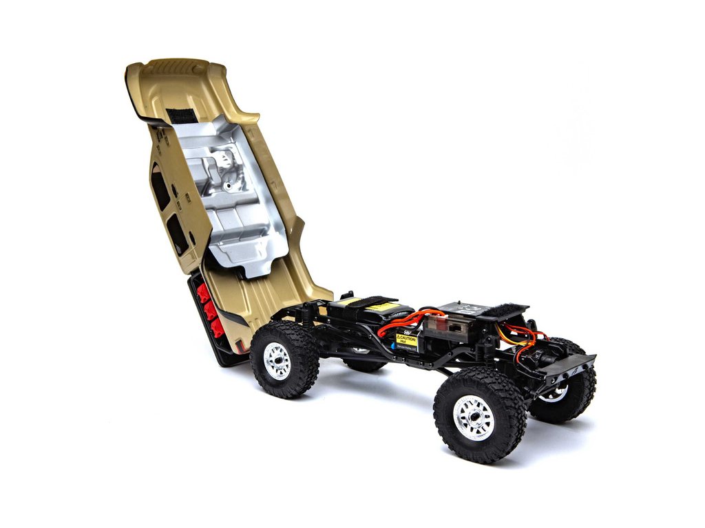Kromě oficiálně licencované atraktivní hotové karosérie, obsahuje SCX24™ Jeep® JT Gladiator detailně propracovaný interiér se sedačkami a řidičem, namontovaným nosičem, střešním stanem a příslušenstvím.