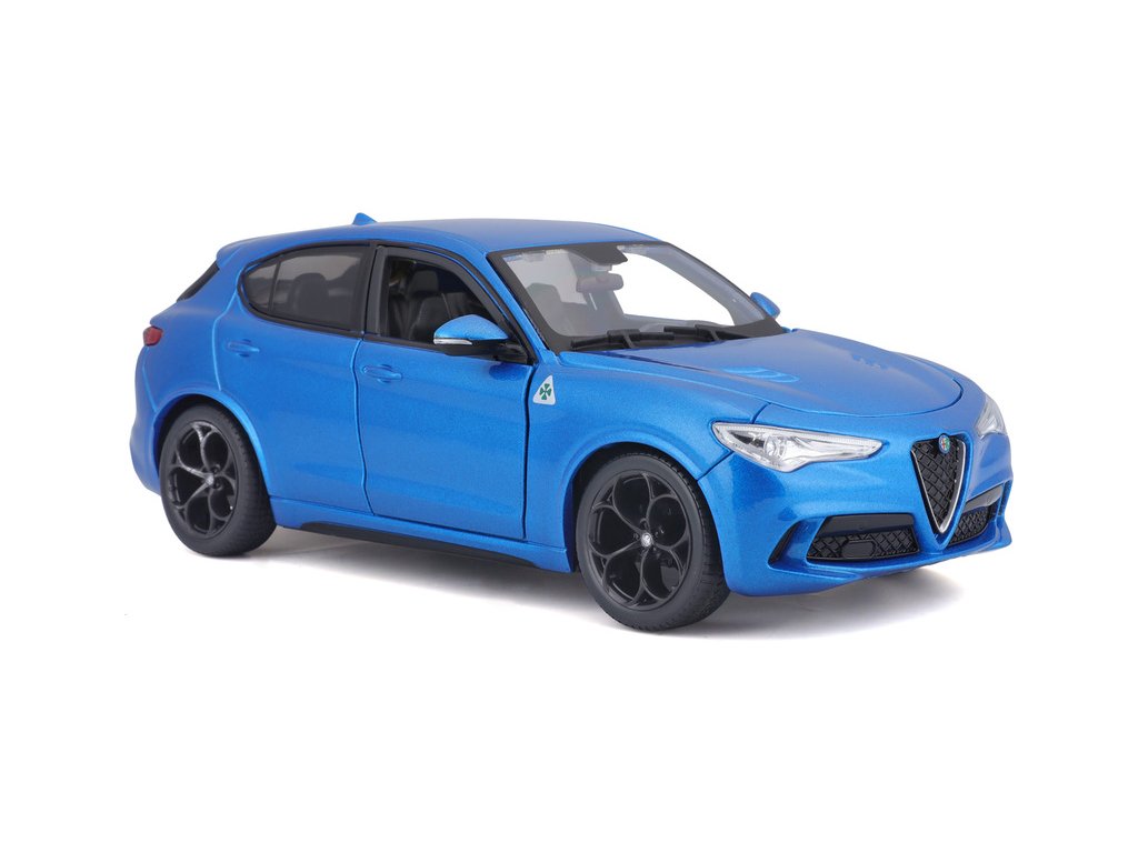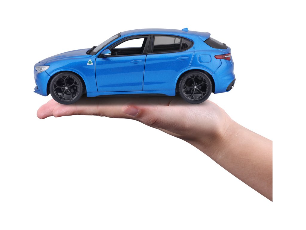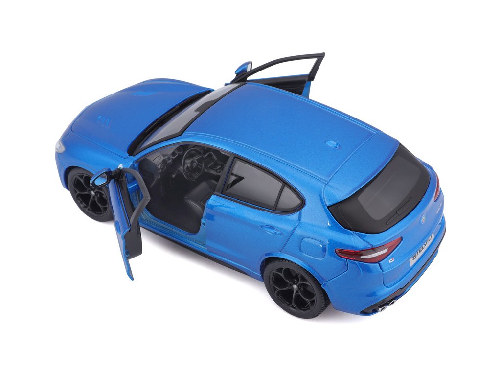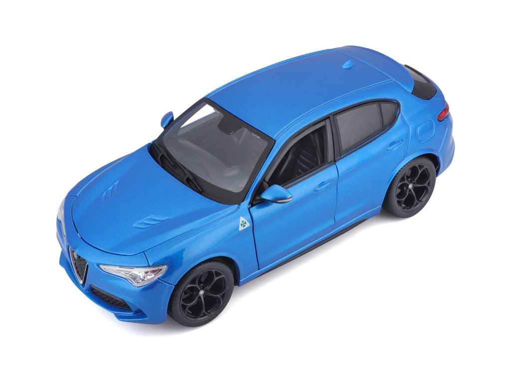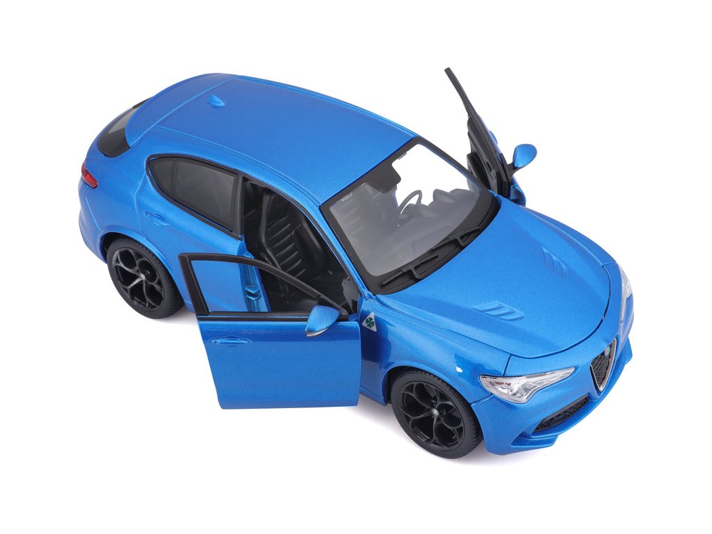 Kovový model auta 1:24 Bburago 18-21086 Alfa Romeo Stelvio modrá, nejen pro sběratele. Má otevírací dveře a je v detailním provedení. Barva modelu je modrá a je přibližně 18 cm velký.