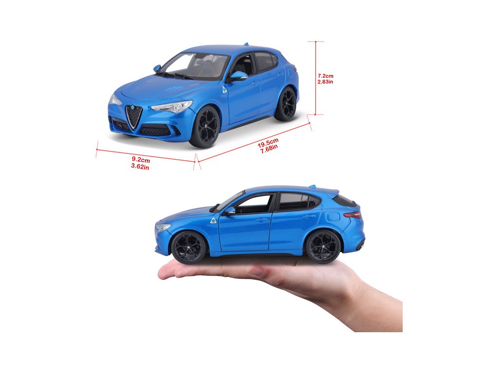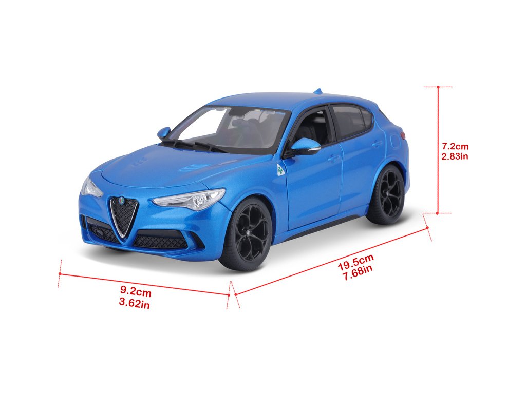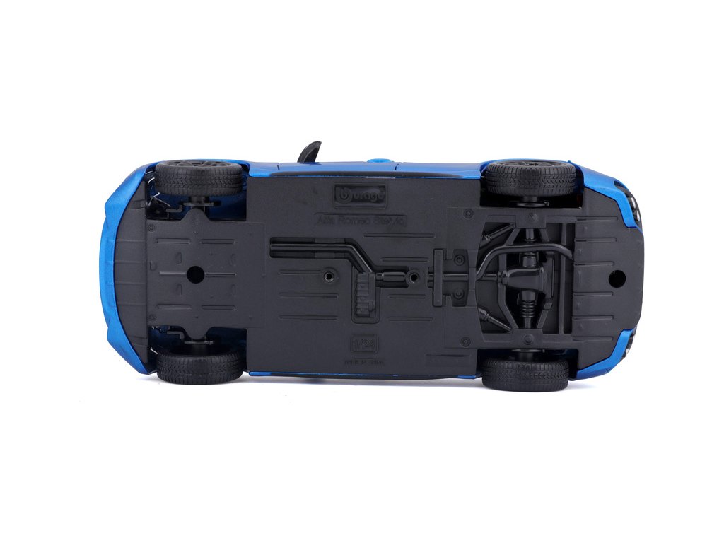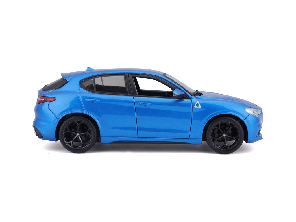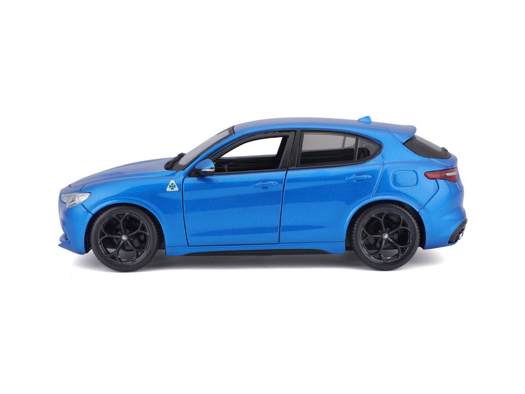 Kovový model auta 1:24 Bburago 18-21086 Alfa Romeo Stelvio modrá, nejen pro sběratele. Má otevírací dveře a je v detailním provedení. Barva modelu je modrá a je přibližně 18 cm velký.