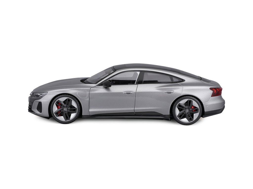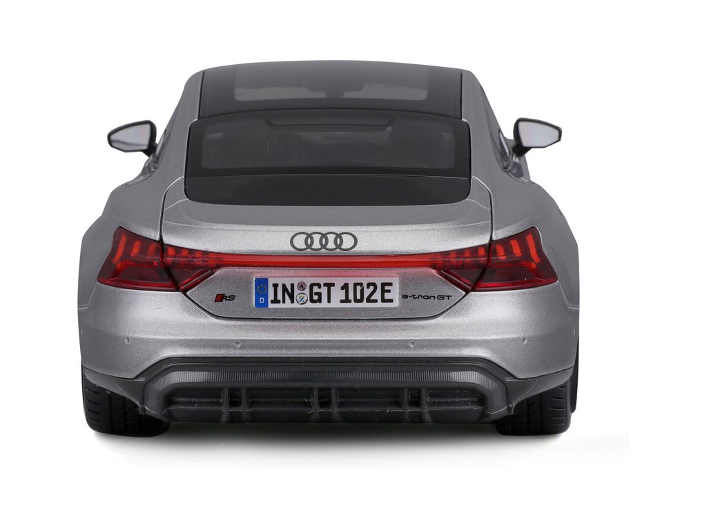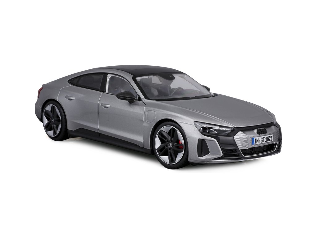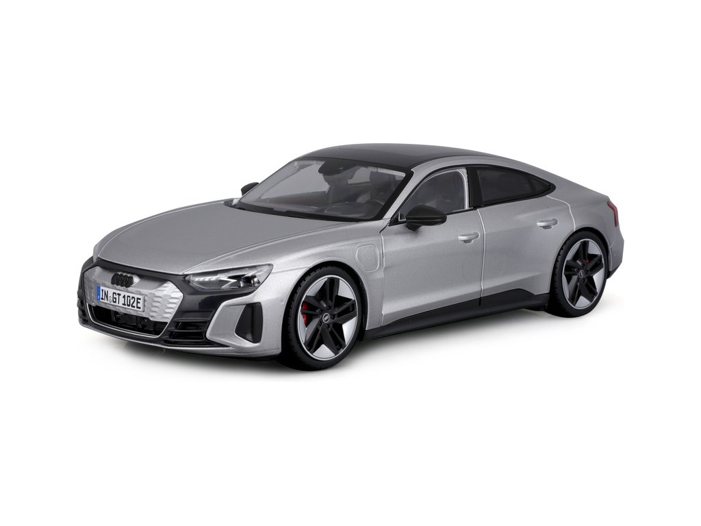 Kovový model auta 1:18 Bburago 18-11050 Audi RS E-tron GT nejen pro sběratele. Barva modelu je stříbrná.