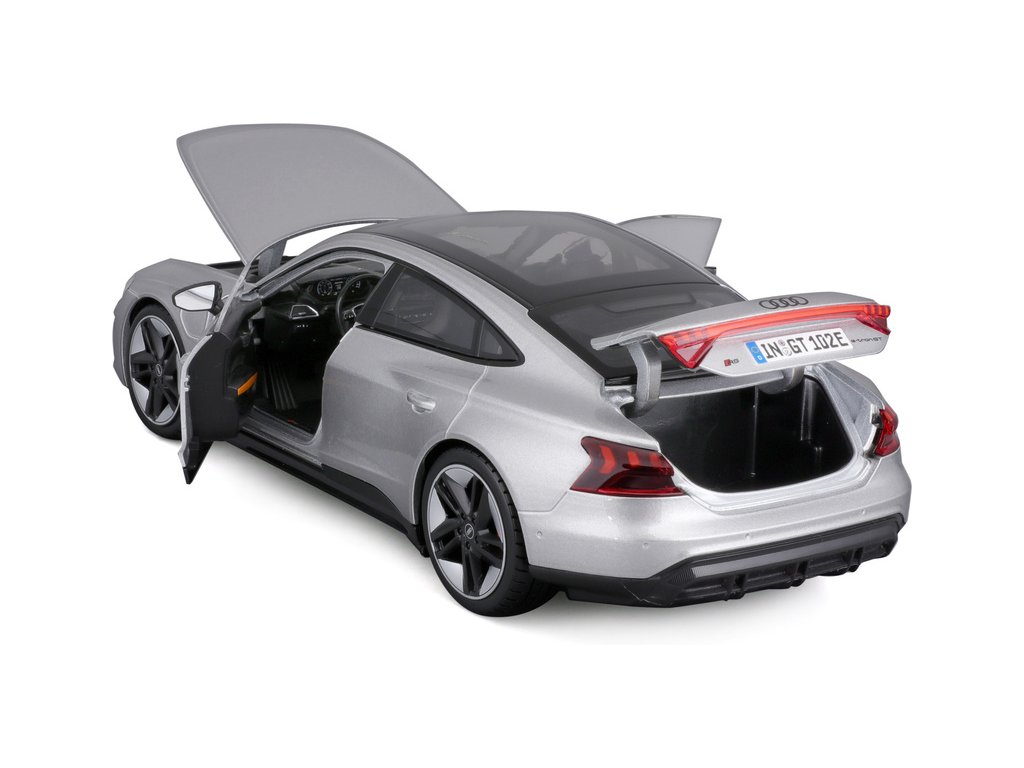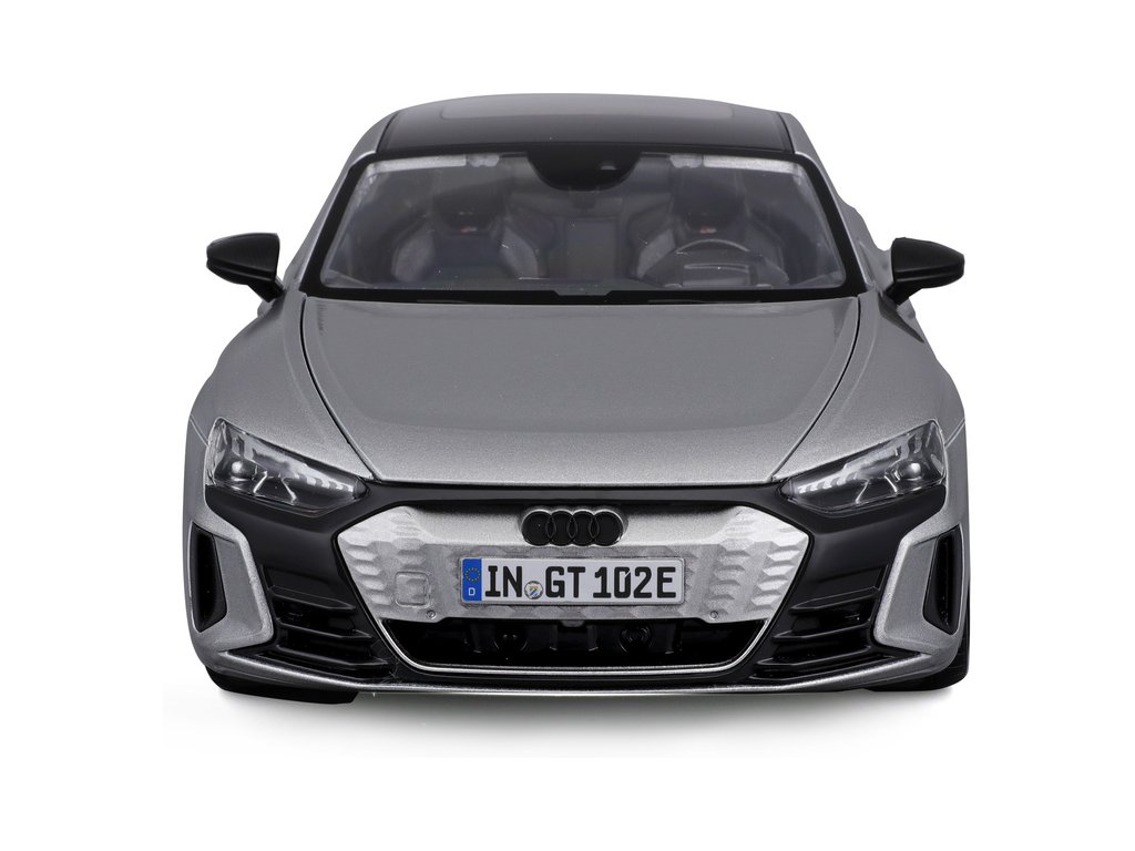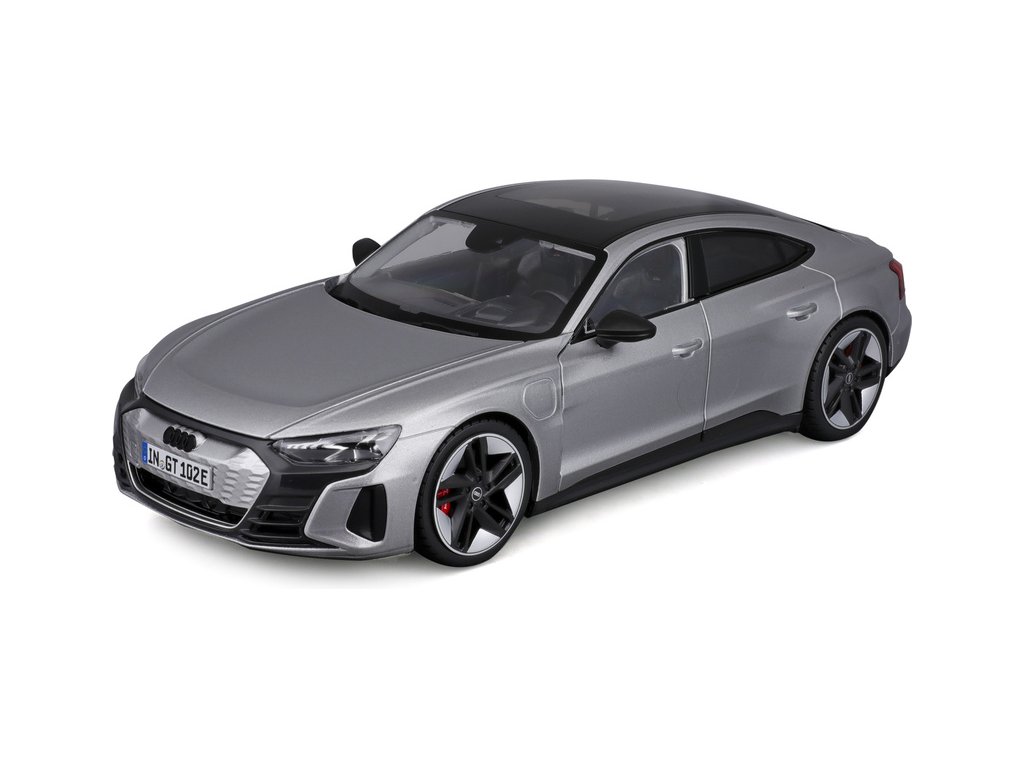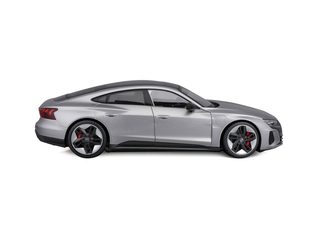 Kovový model auta 1:18 Bburago 18-11050 Audi RS E-tron GT nejen pro sběratele. Barva modelu je stříbrná.