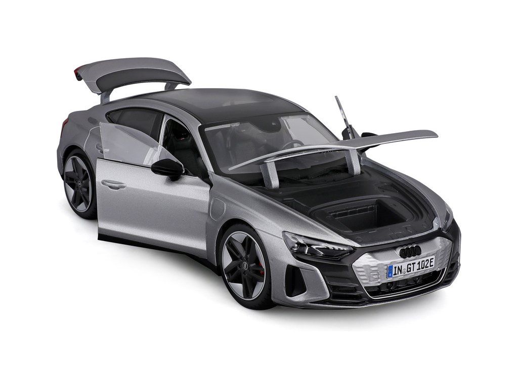 Kovový model auta 1:18 Bburago 18-11050 Audi RS E-tron GT nejen pro sběratele. Model má funkční natáčení kol volantem. Barva modelu je stříbrná a je přibližně 24 cm velký.