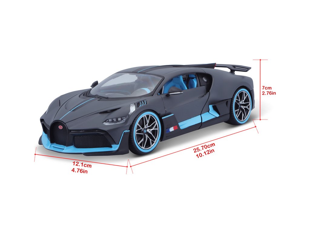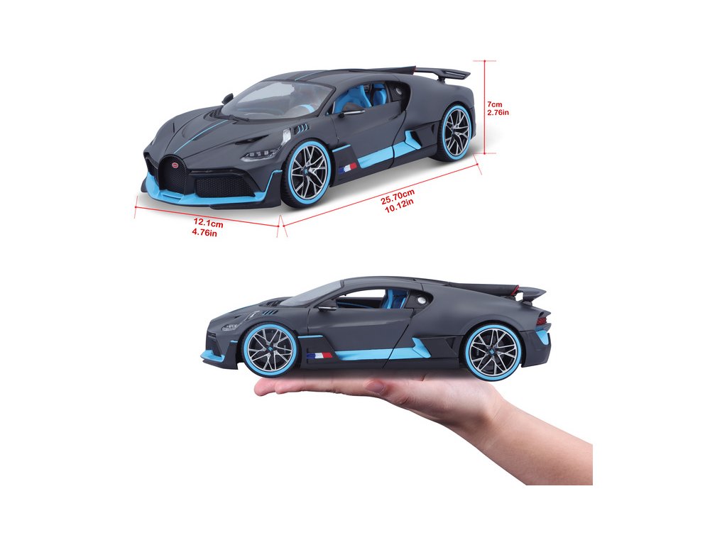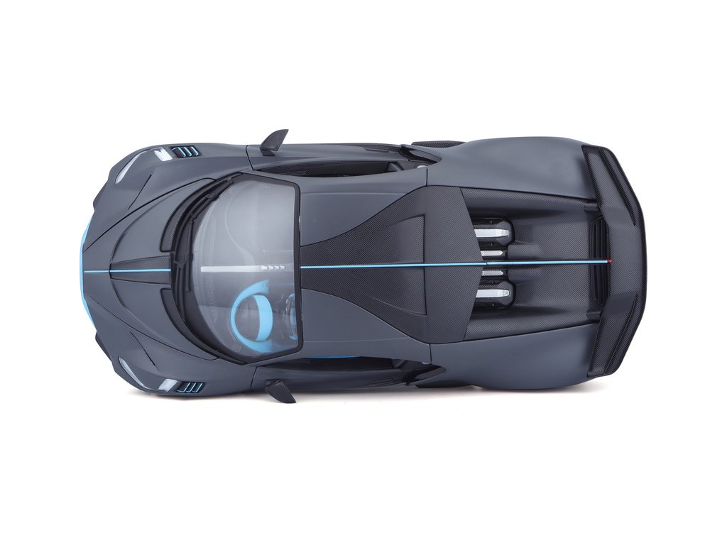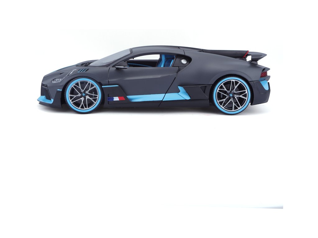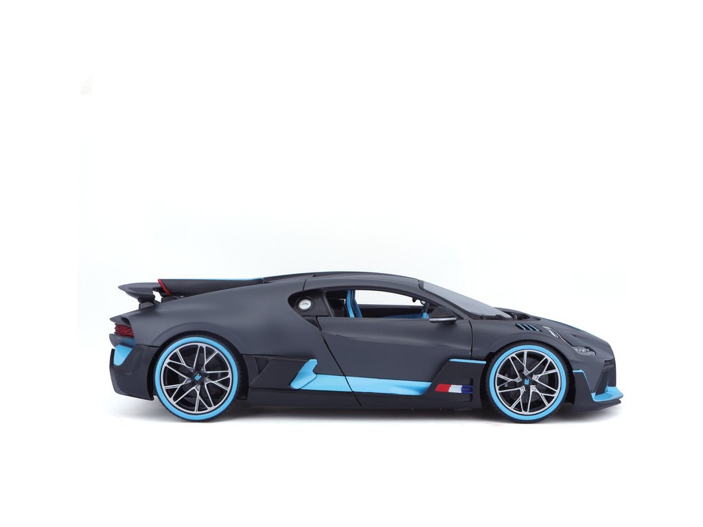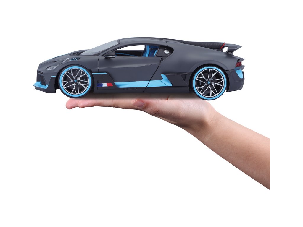 Kovový model auta 1:18 Bburago 18-11045 Bugatti Divo nejen pro sběratele. Má otevírací dveře a kapotu, otočná kola. Barva modelu je stříbrná a je přibližně 24 cm velký.
