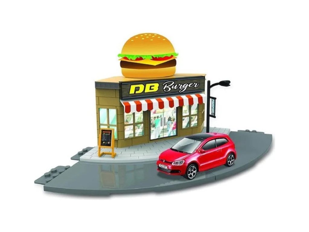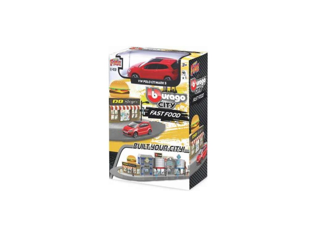 Herní set Bburago 18-31504 City - Fast food s autíčkem VW Polo GTI Mark 5 v měřítku 1:43 ( přibližně 10 cm velké ) pro malé milovníky aut. Set umožní malým řidičům si hrát, že jedou do rychlého občerstvení. Balení obsahuje plastovou maketu rychlého občerstvení, autíčko.