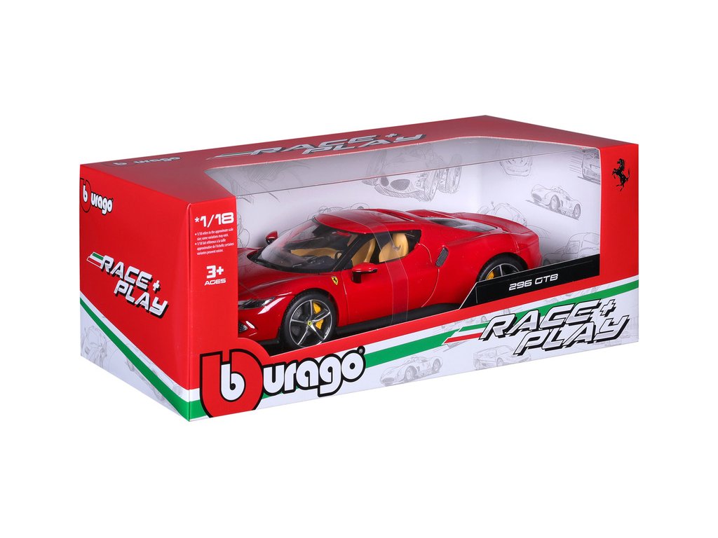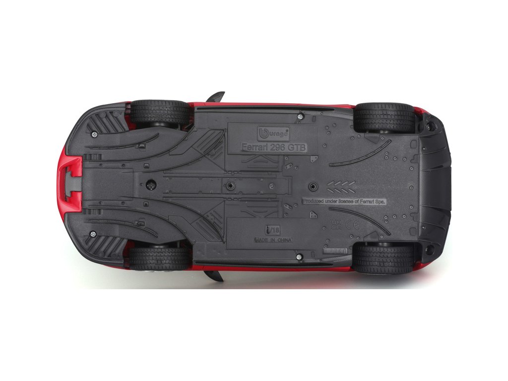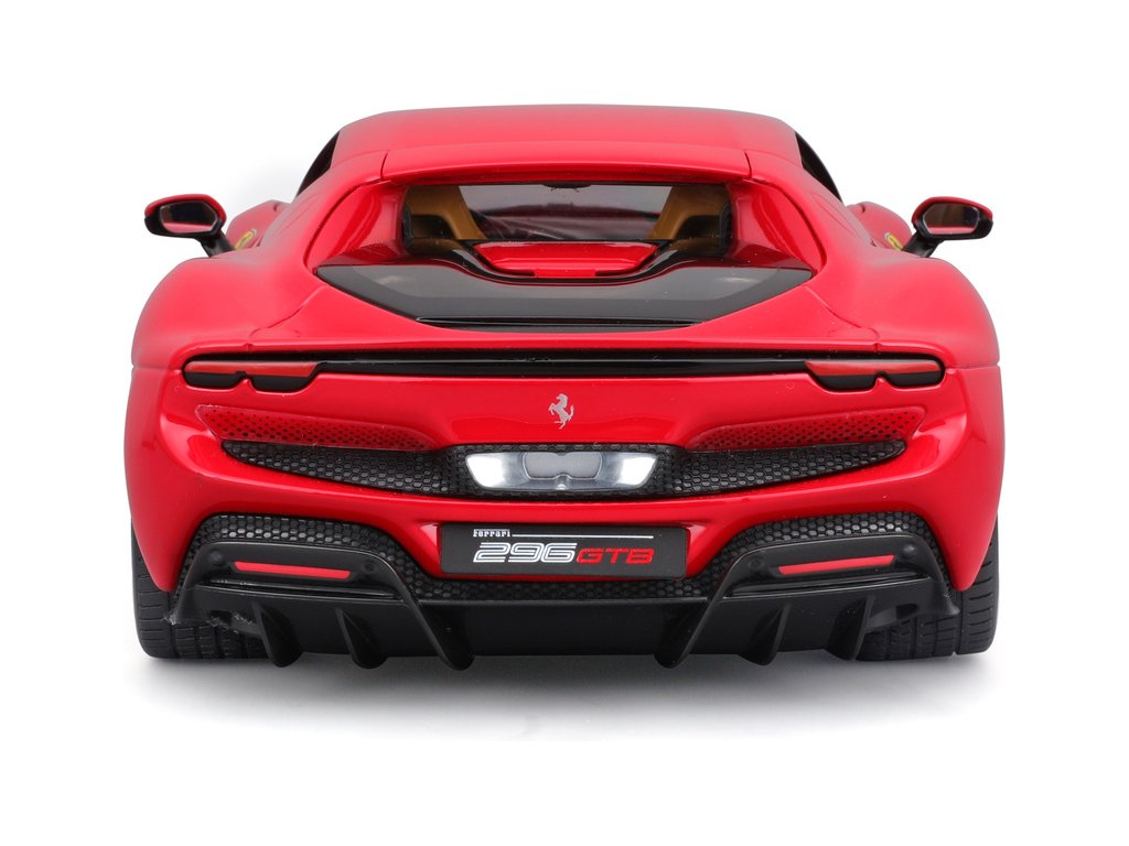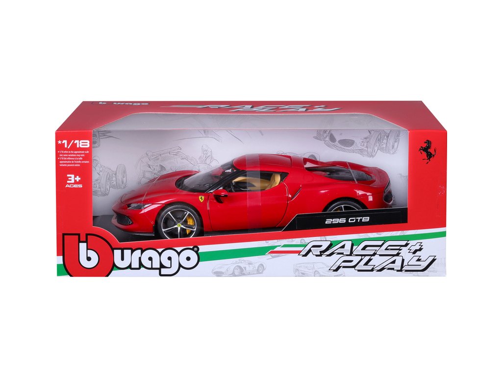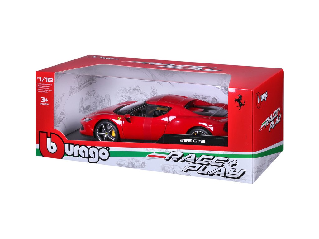 Kovový model auta 1:18 Bburago 18-16018RD Ferrari 296 GTB, nejen pro sběratele. Model je v detailním provedení. Barva modelu je červená a přibližně 24 cm velký.
