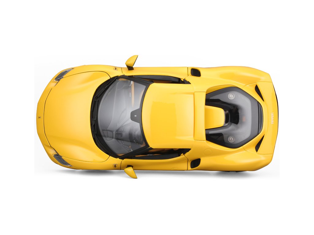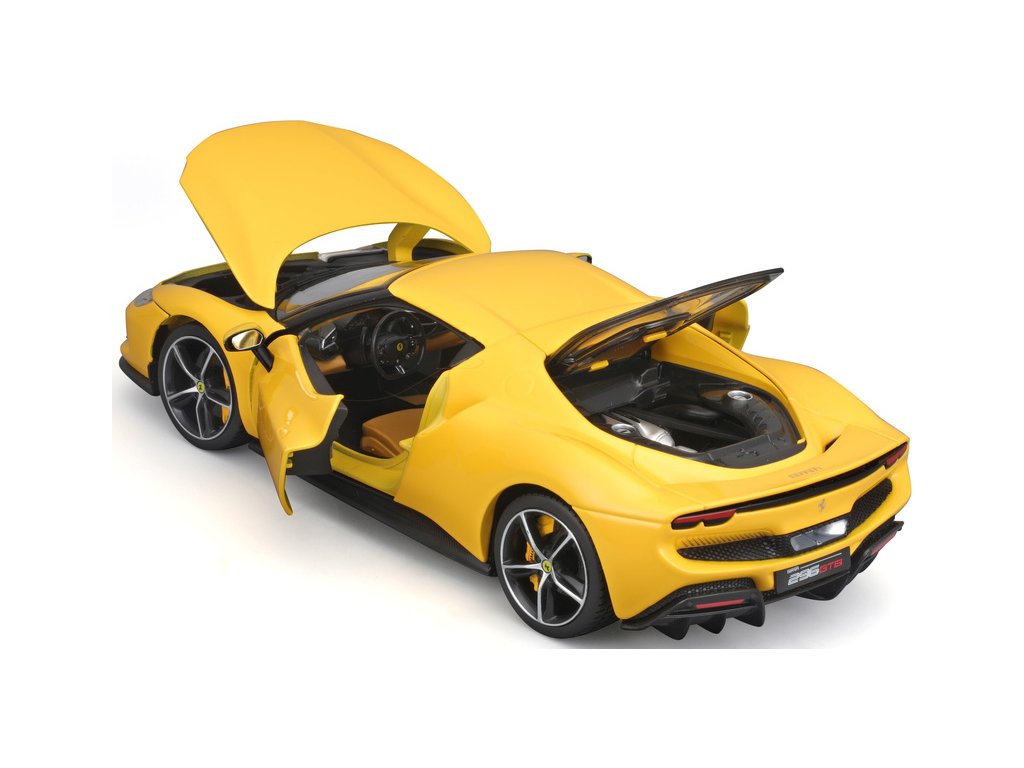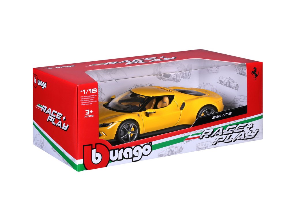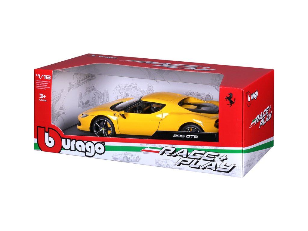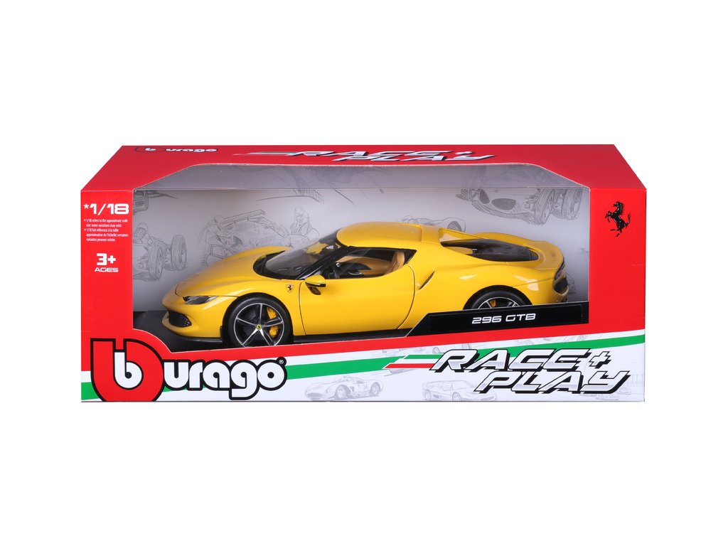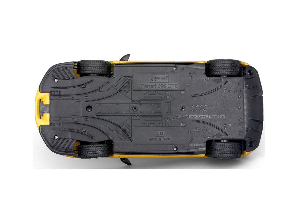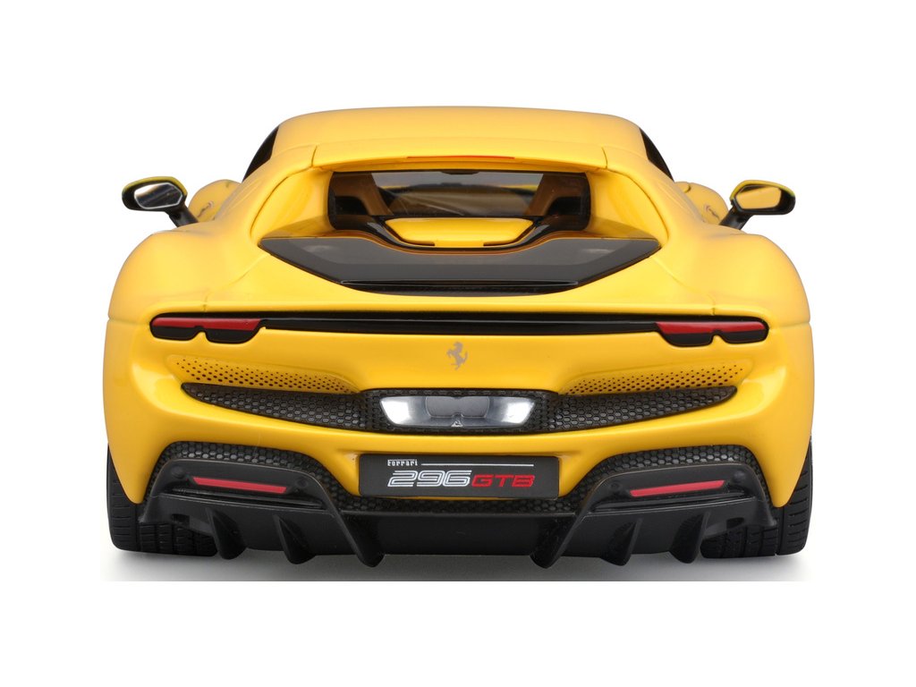 Kovový model auta 1:18 Bburago 18-16018YL Ferrari 296 GTB, nejen pro sběratele. Model je v detailním provedení. Barva modelu je žlutá a přibližně 24 cm velký.
