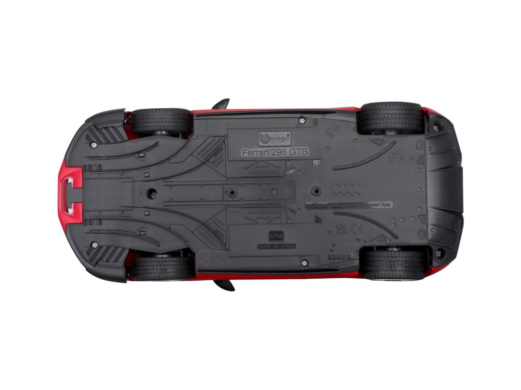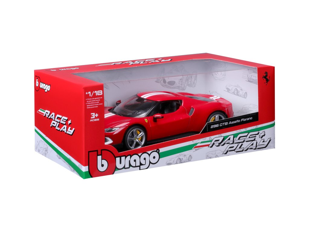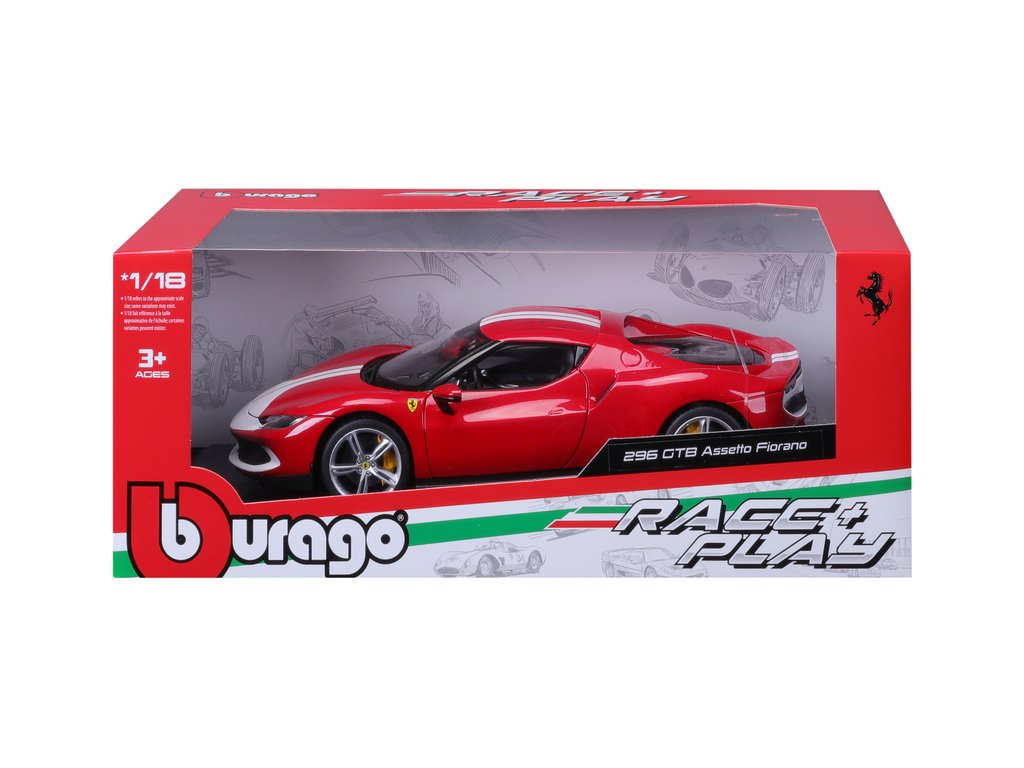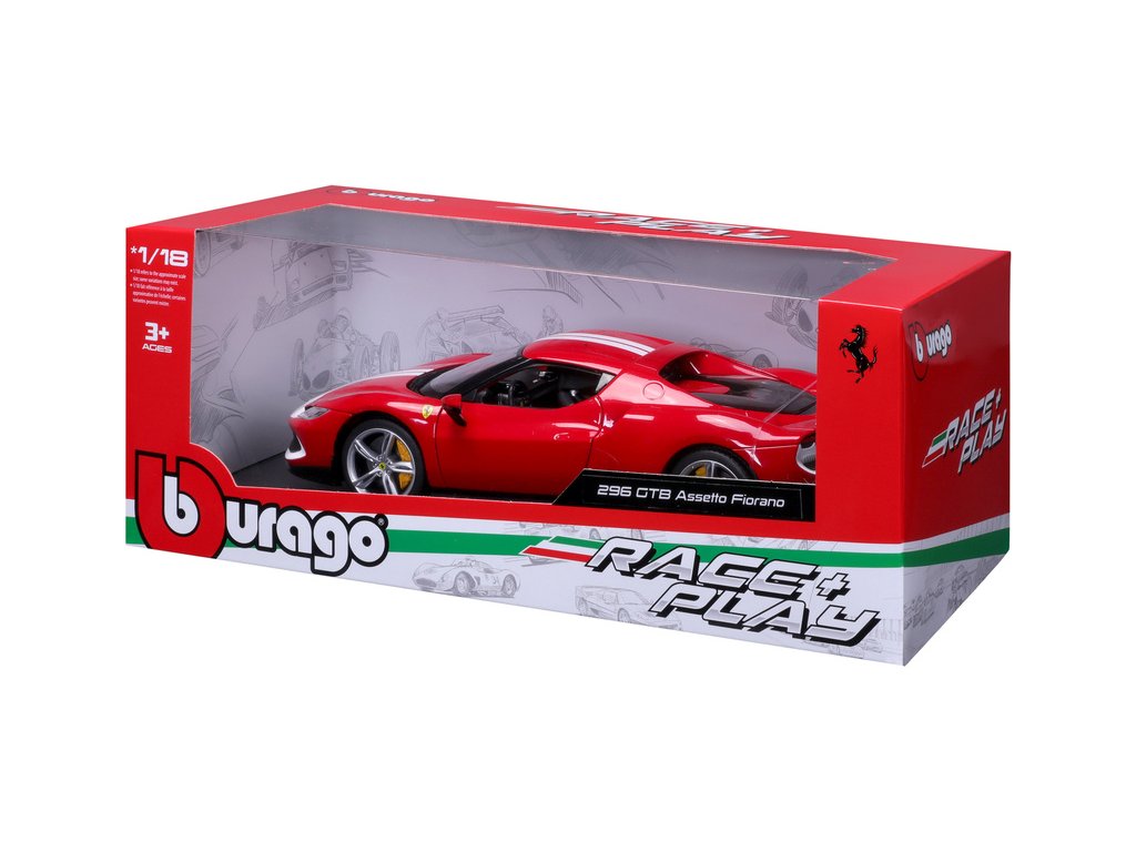 Kovový model auta 1:18 Bburago 18-16017RD Ferrari 296 GTB Assetto Fiorano, nejen pro sběratele. Model je v detailním provedení. Barva modelu je červená a přibližně 24 cm velký.