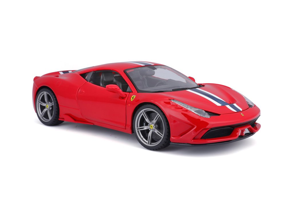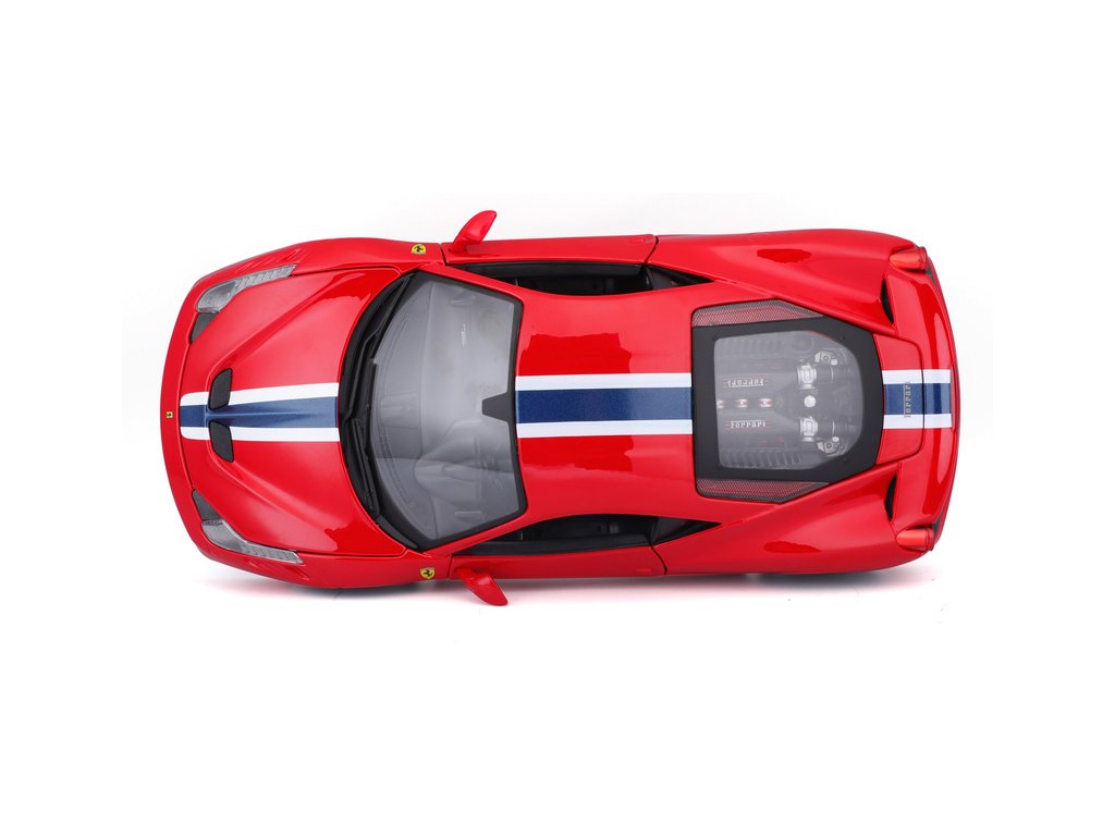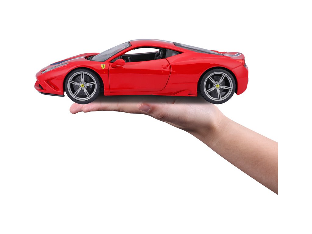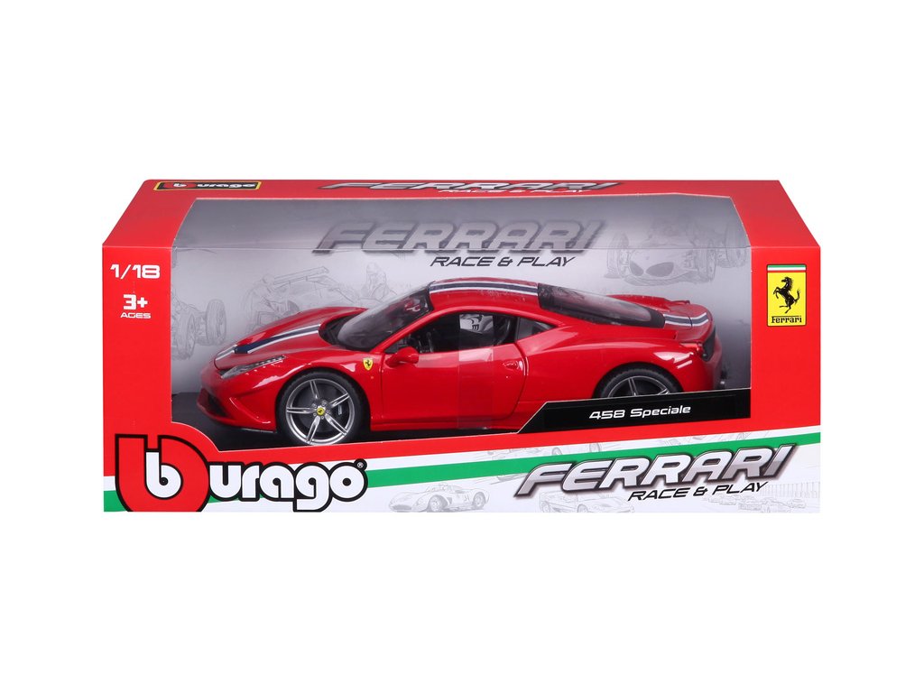 Kovový model auta Bburago 18-16002 Ferrari 458 Speciale 1:18 červená, nejen pro sběratele. Má otevírací dveře a kapotu, odpružené nápravy, natáčení kol volantem je plně funkční. Barva modelu je červená a je přibližně 24 cm velký.