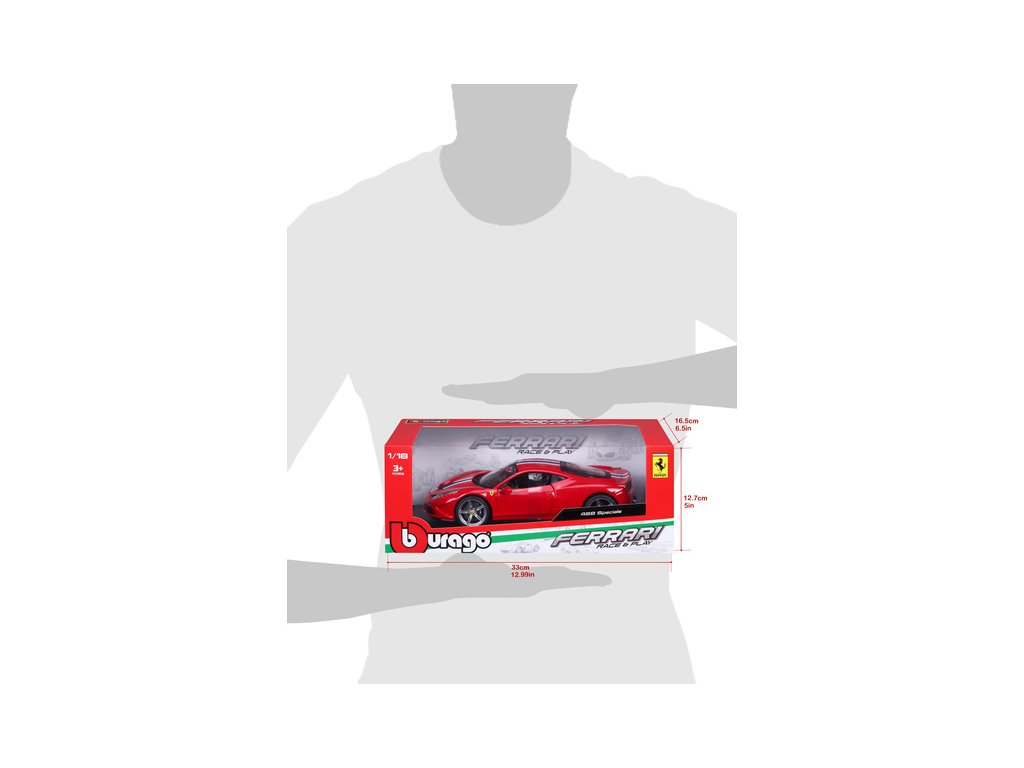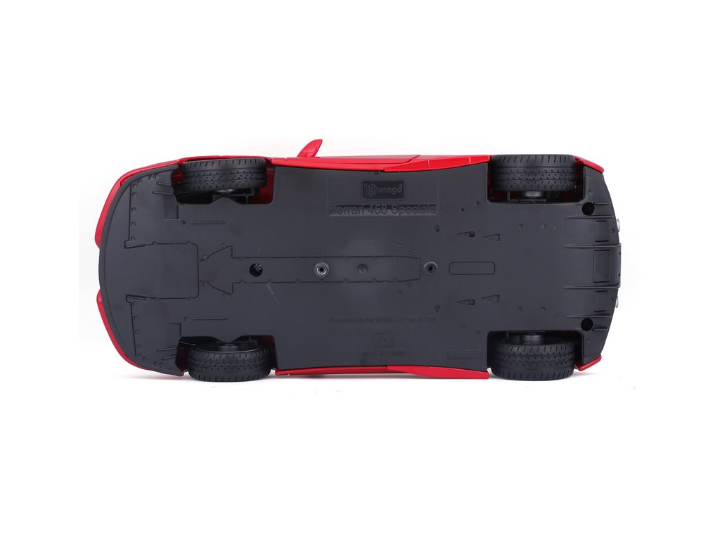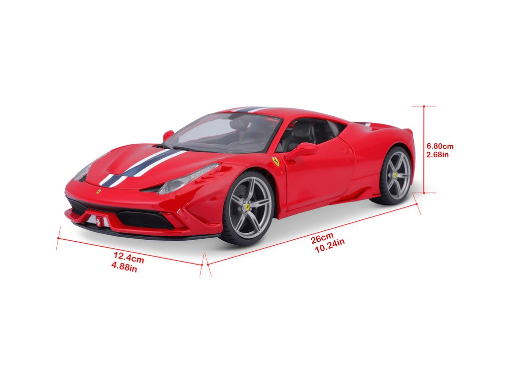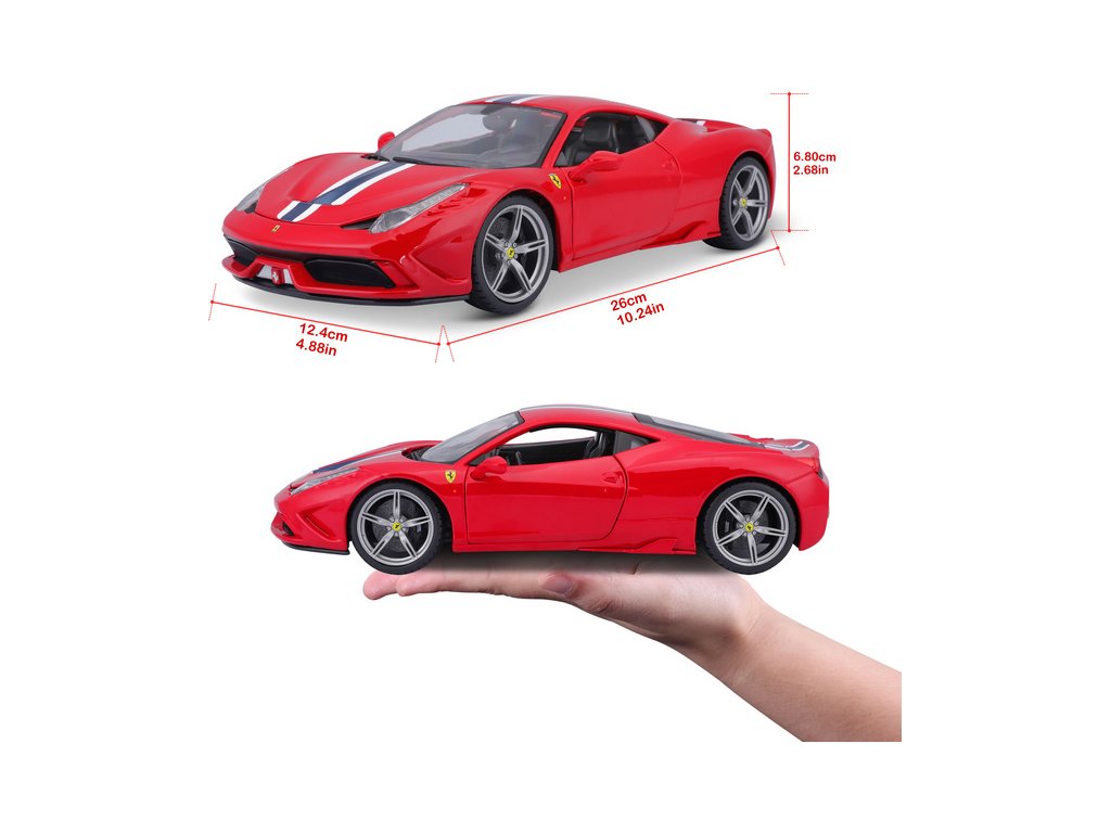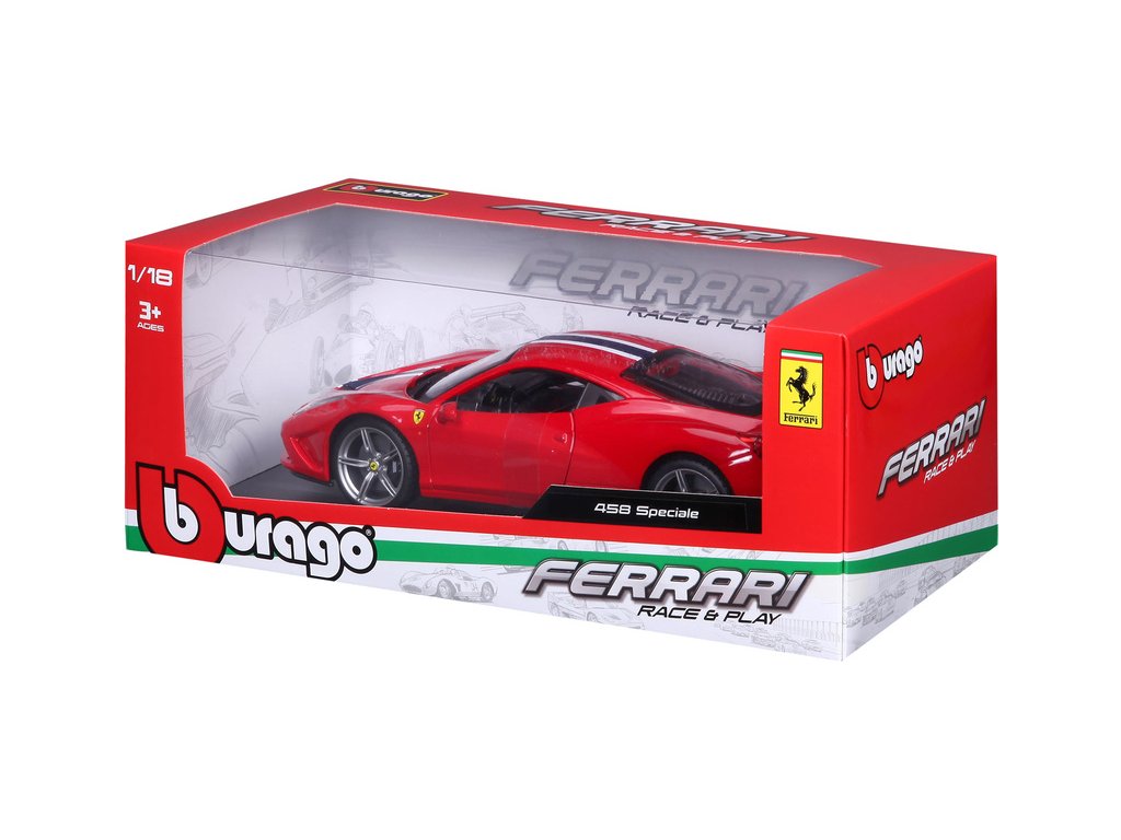 Kovový model auta Bburago 18-16002 Ferrari 458 Speciale 1:18 červená, nejen pro sběratele. Má otevírací dveře a kapotu, odpružené nápravy, natáčení kol volantem je plně funkční. Barva modelu je červená a je přibližně 24 cm velký.