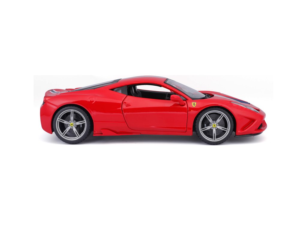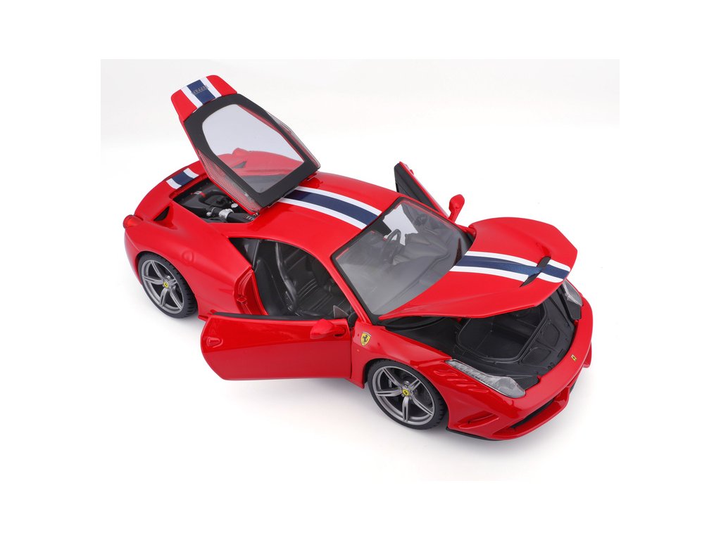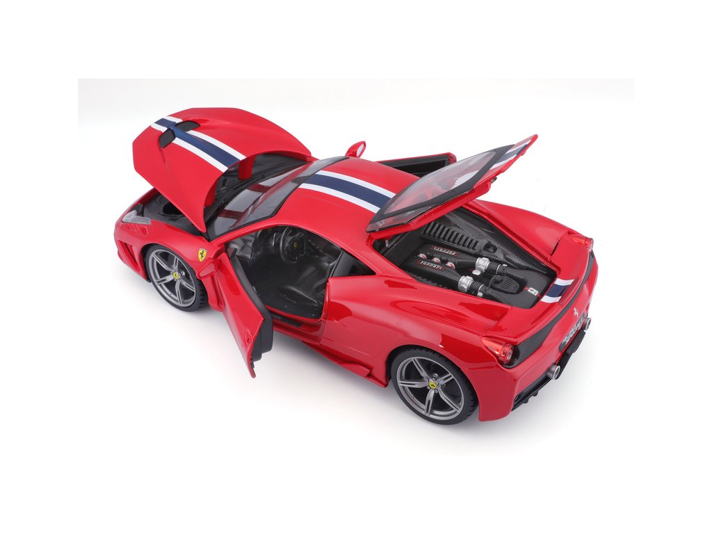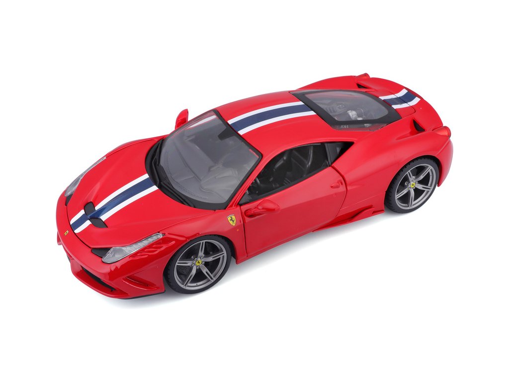 Kovový model auta Bburago 18-16002 Ferrari 458 Speciale 1:18 červená, nejen pro sběratele. Má otevírací dveře a kapotu, odpružené nápravy, natáčení kol volantem je plně funkční. Barva modelu je červená