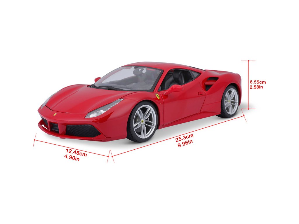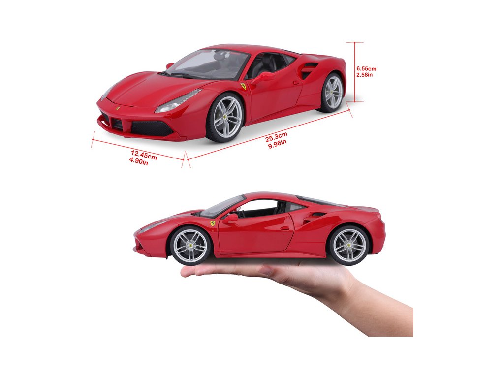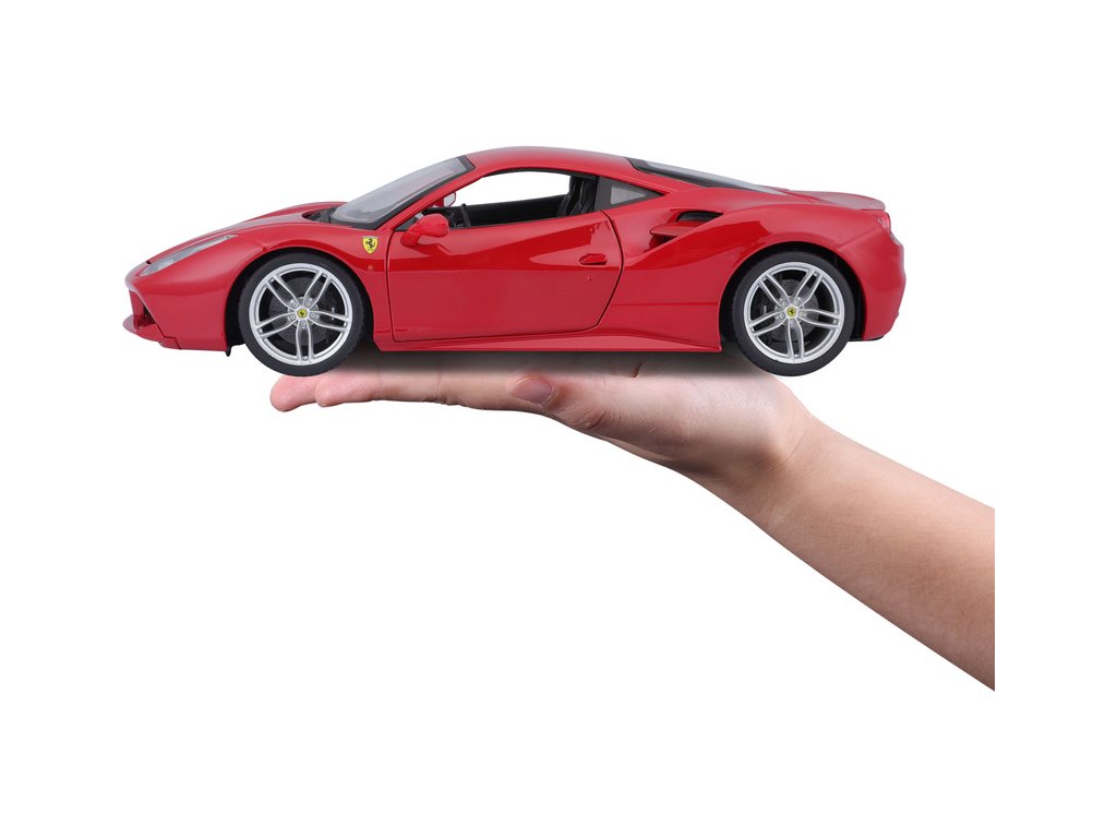 Kovový model auta 1:18 Bburago 18-16008 Ferrari 488 GTB nejen pro sběratele. Má otevírací dveře a kapotu, odpružené nápravy, natáčení kol volantem je plně funkční. Barva modelu je červená Ferrari a je přibližně 25 cm velký.