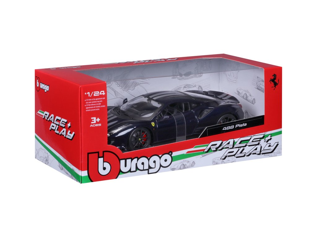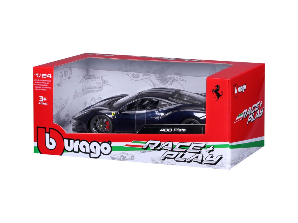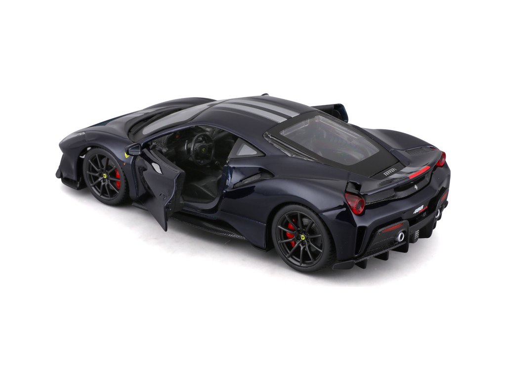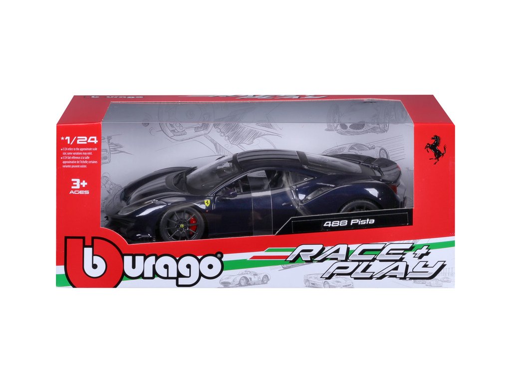 Kovový model auta Bburago BB18-26026 Ferrari 488 Pista v měřítku 1:24 v červené barvě. Model má otevírací dveře a je v detailním provedení. Barva modelu je tmavě modrá a je přibližně 19 cm velký.