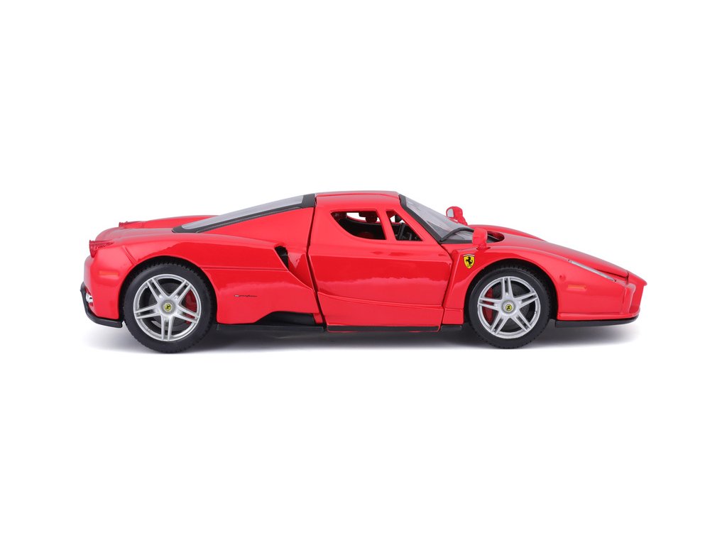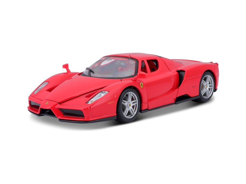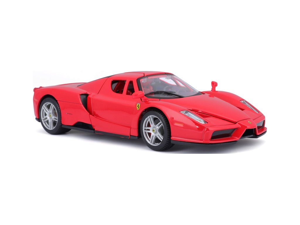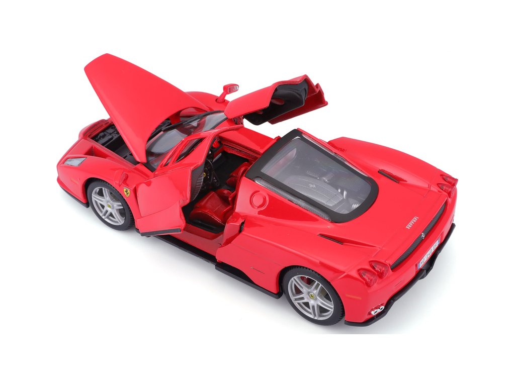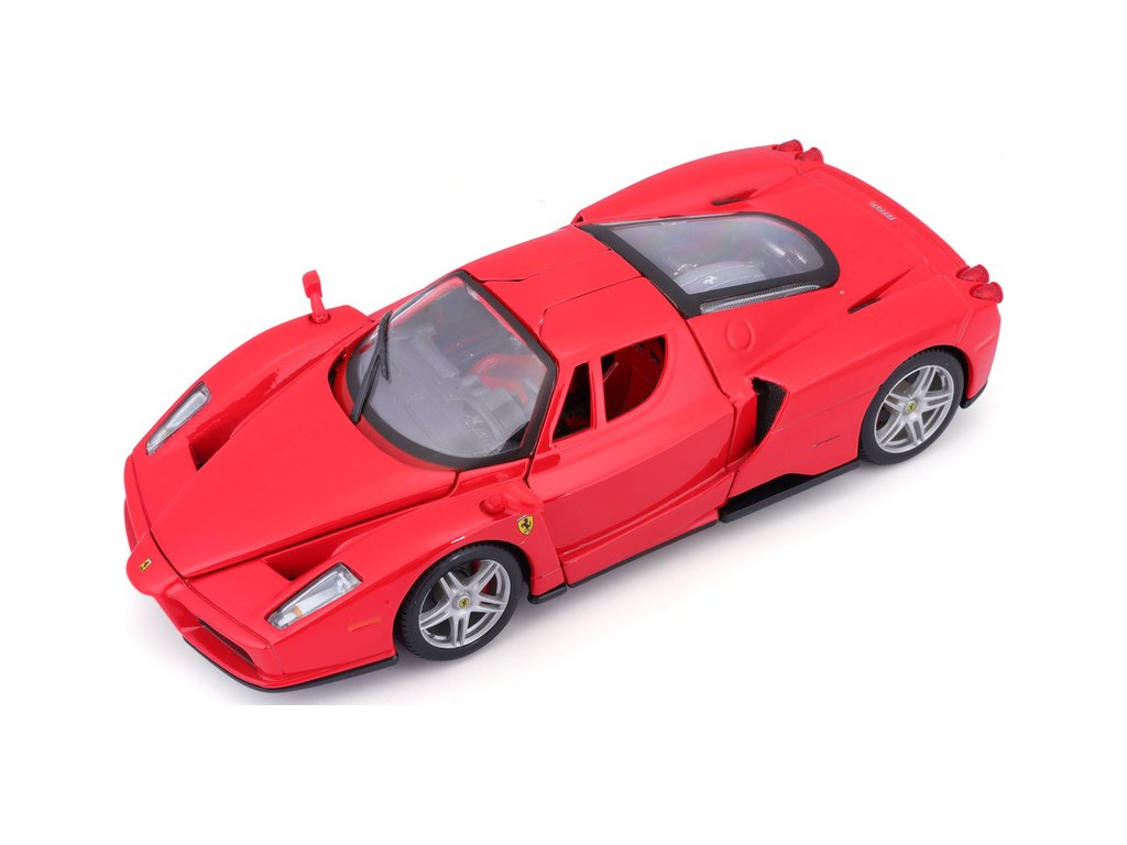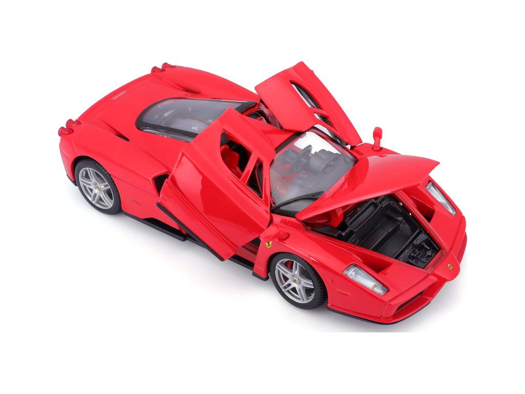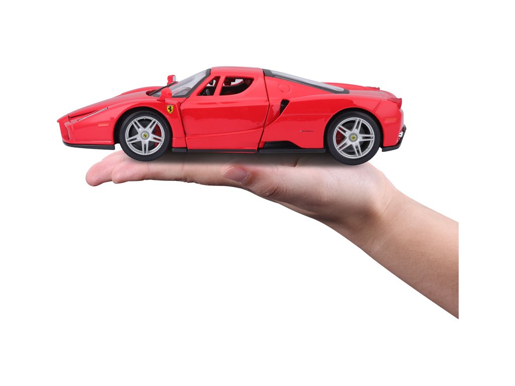 Kovový model auta 1:24 Bburago 18-26006 Enzo Ferrari nejen pro sběratele. Má otevírací dveře a kapotu. Barva modelu je červená a je přibližně 19 cm velký.