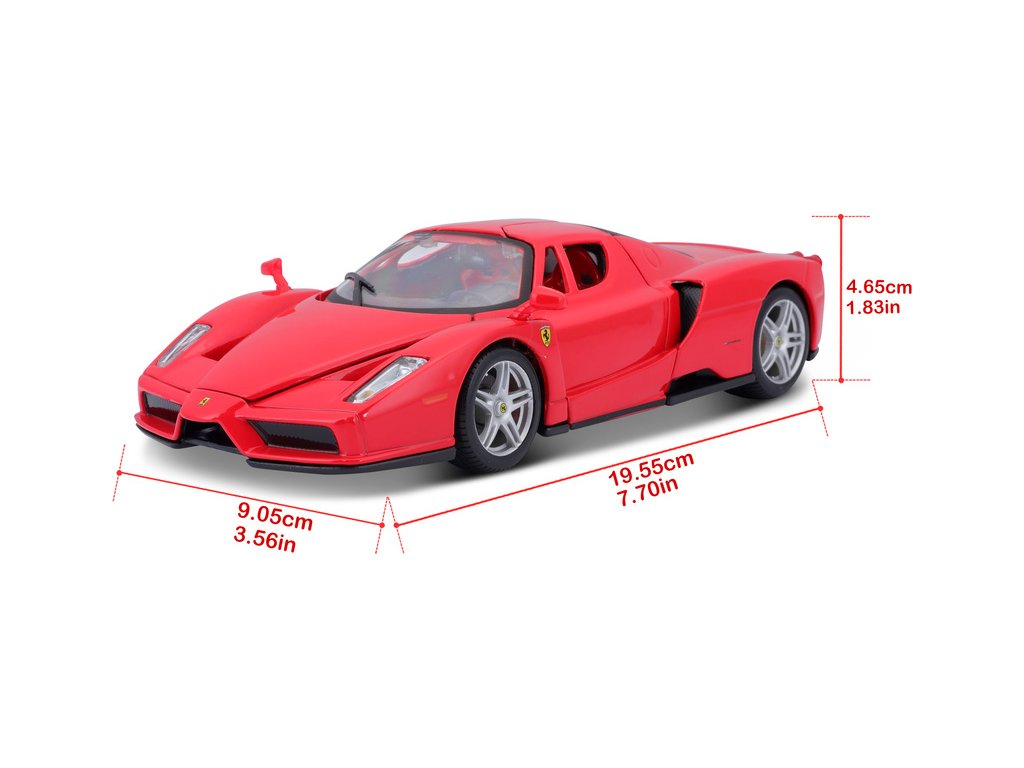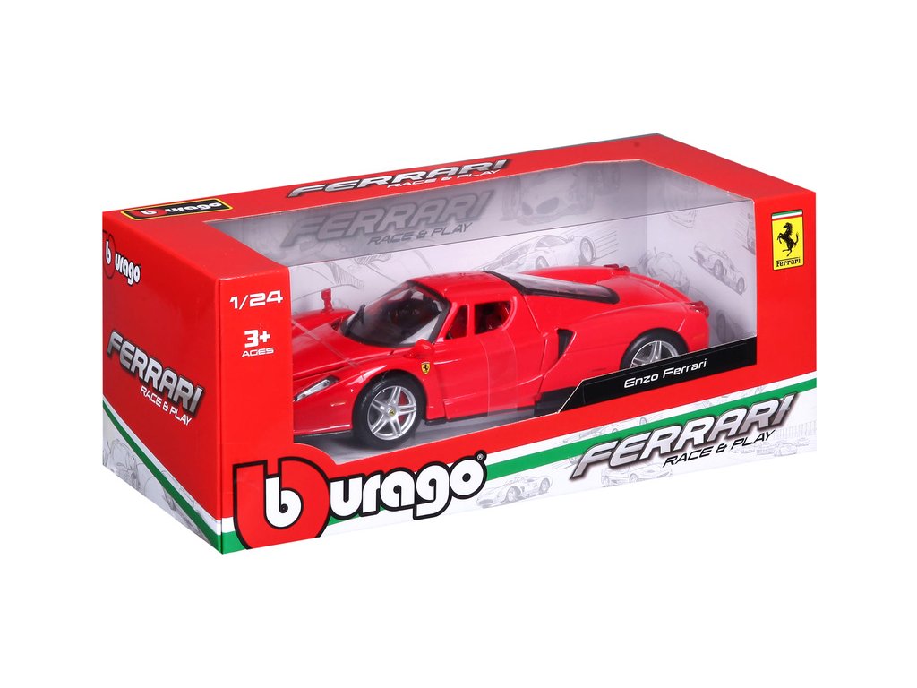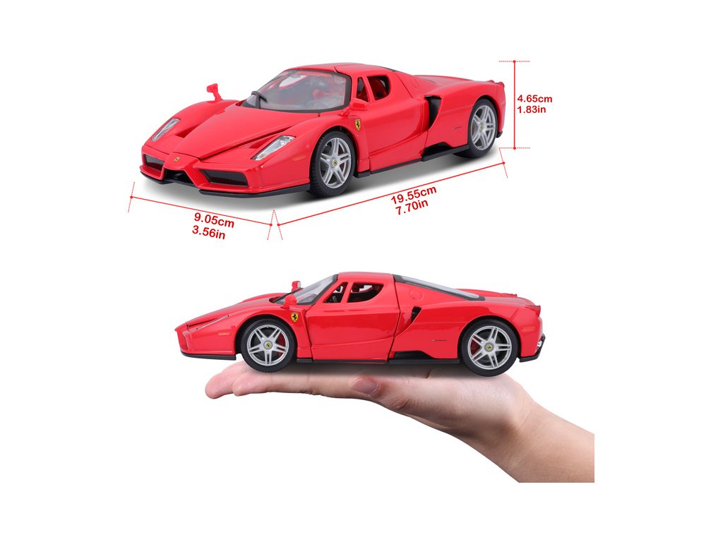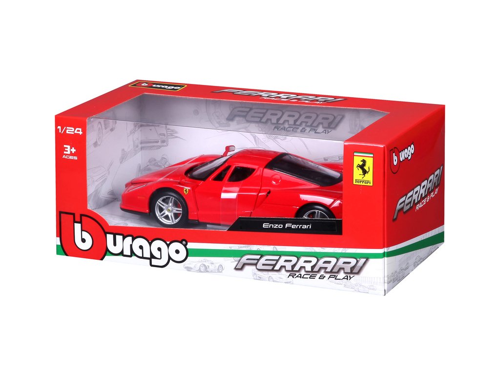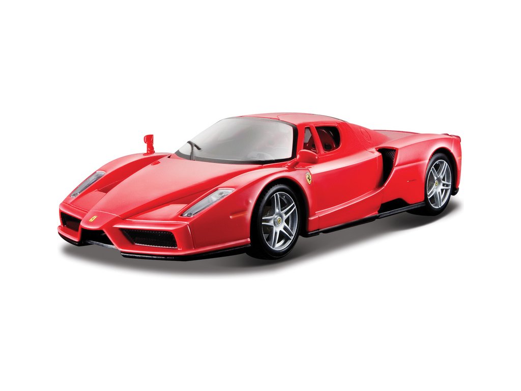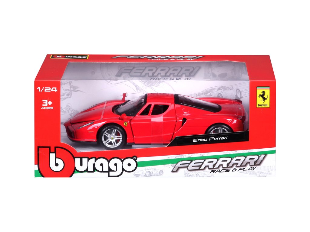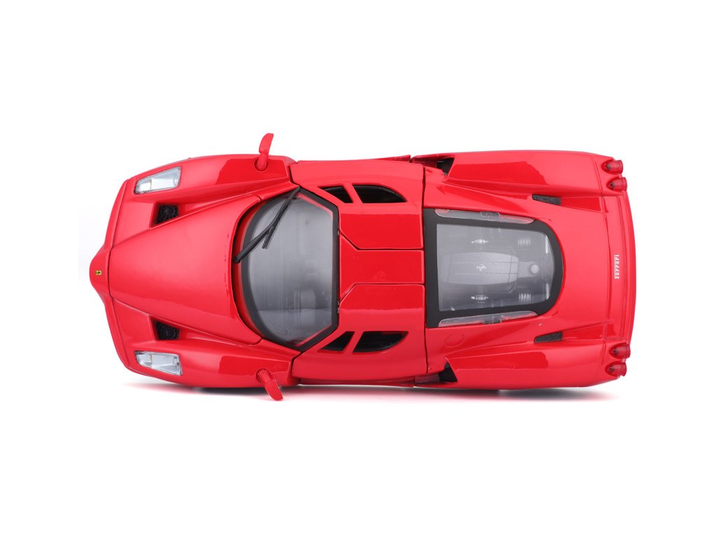 Kovový model auta 1:24 Bburago 18-26006 Enzo Ferrari nejen pro sběratele. Má otevírací dveře a kapotu. Barva modelu je červená a je přibližně 19 cm velký.