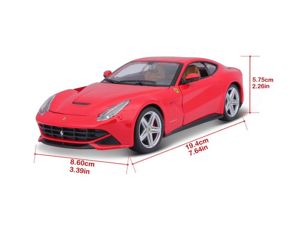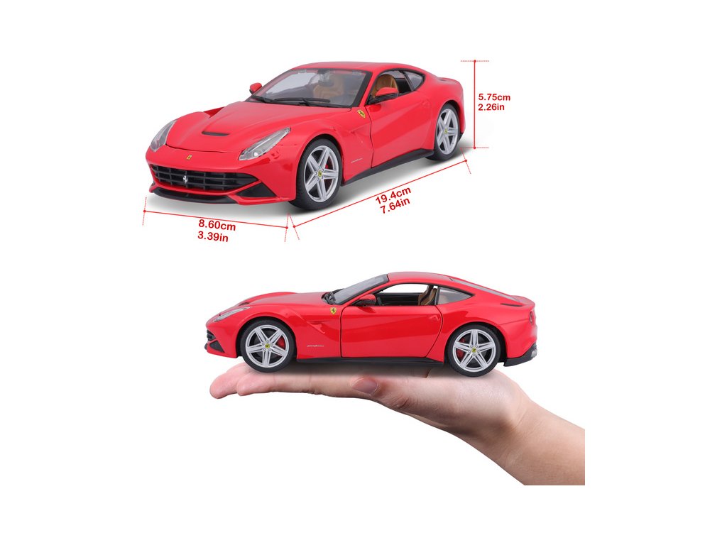 Kovový model auta 1:24 Bburago 18-26007 F12 Berlinetta nejen pro sběratele. Má otevírací dveře a kapotu. Barva modelu je červená. Délka je přibližně 19 cm.