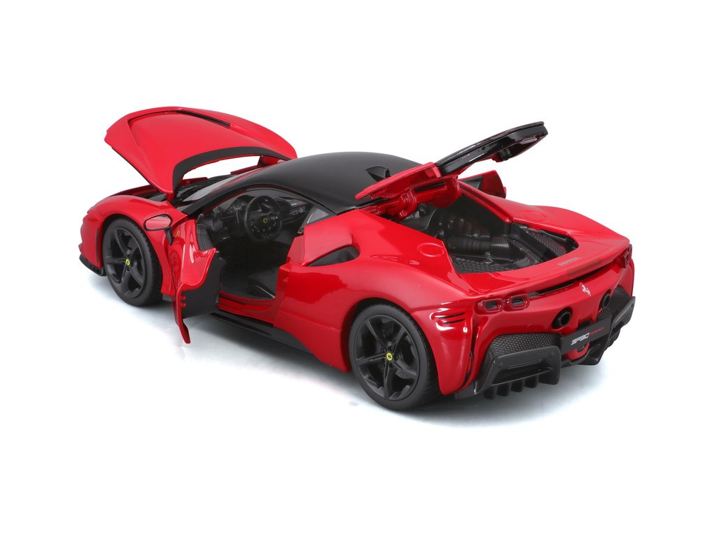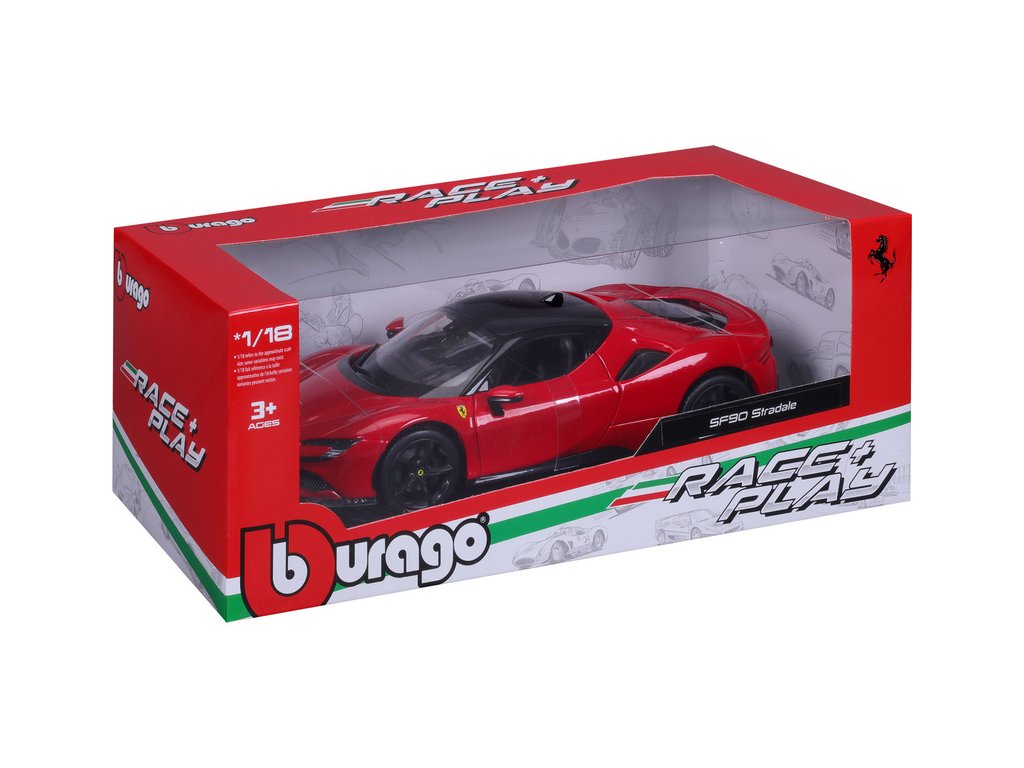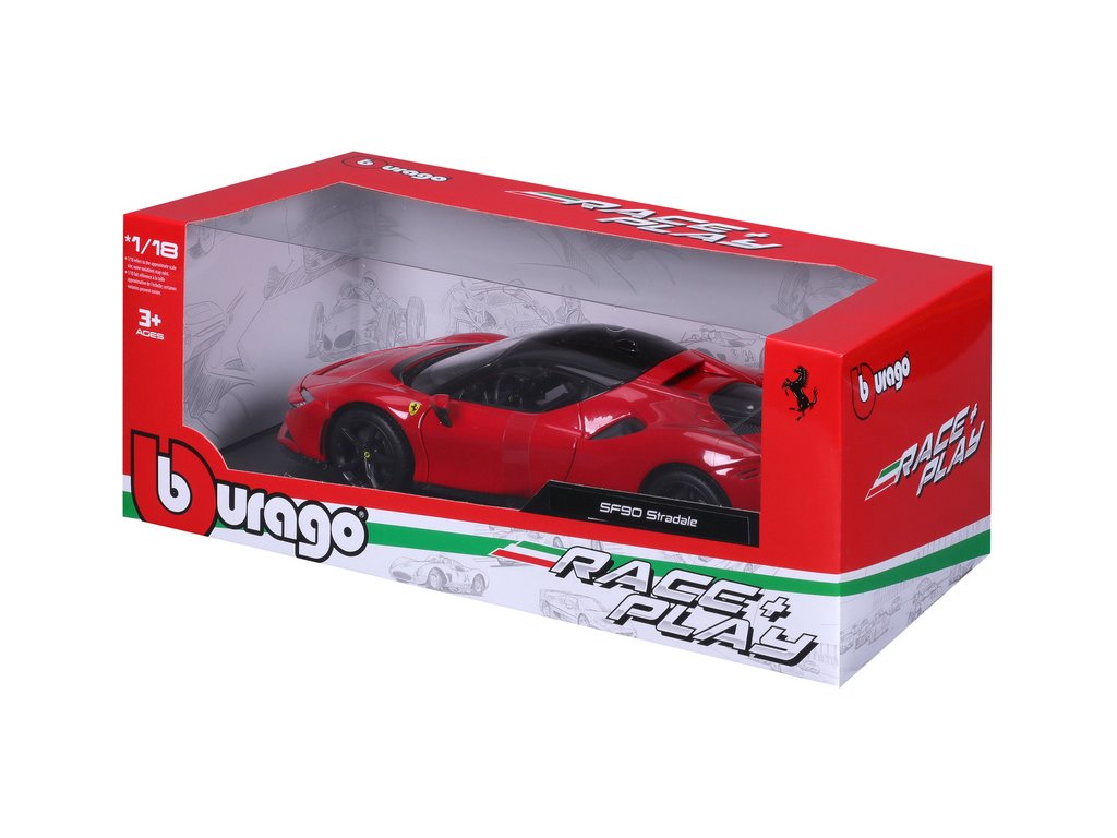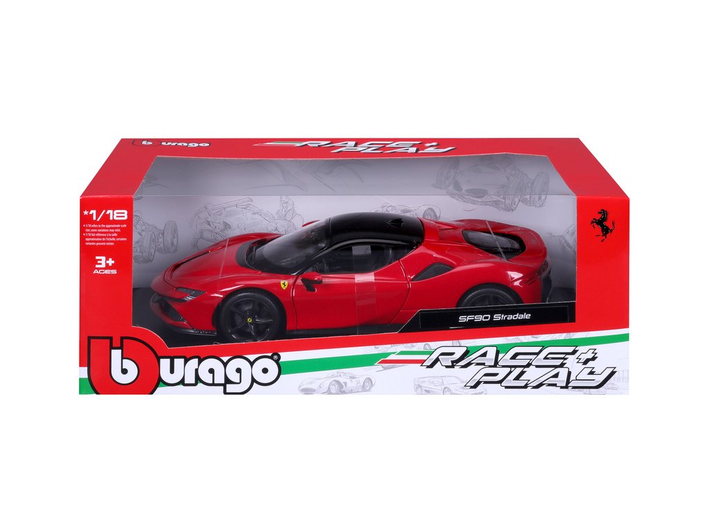Kovový model auta 1:18 Bburago 18-16015 Ferrari SF90 Stradale, nejen pro sběratele. Model je v detailním provedení. Barva modelu je červená a přibližně 24 cm velký.