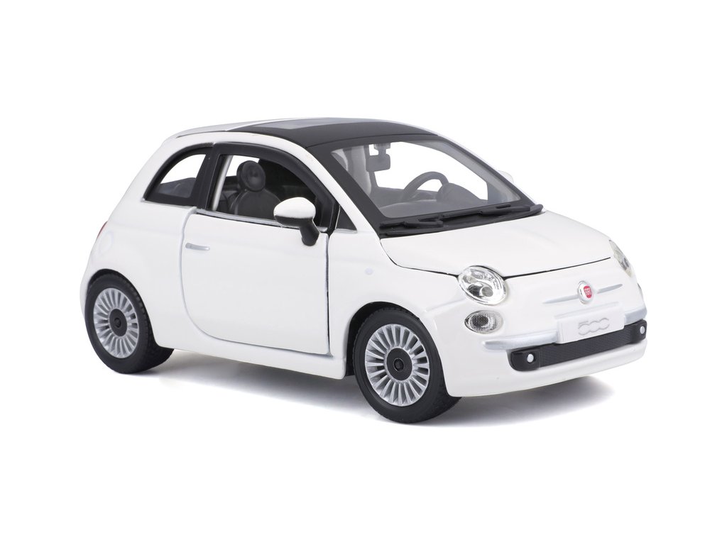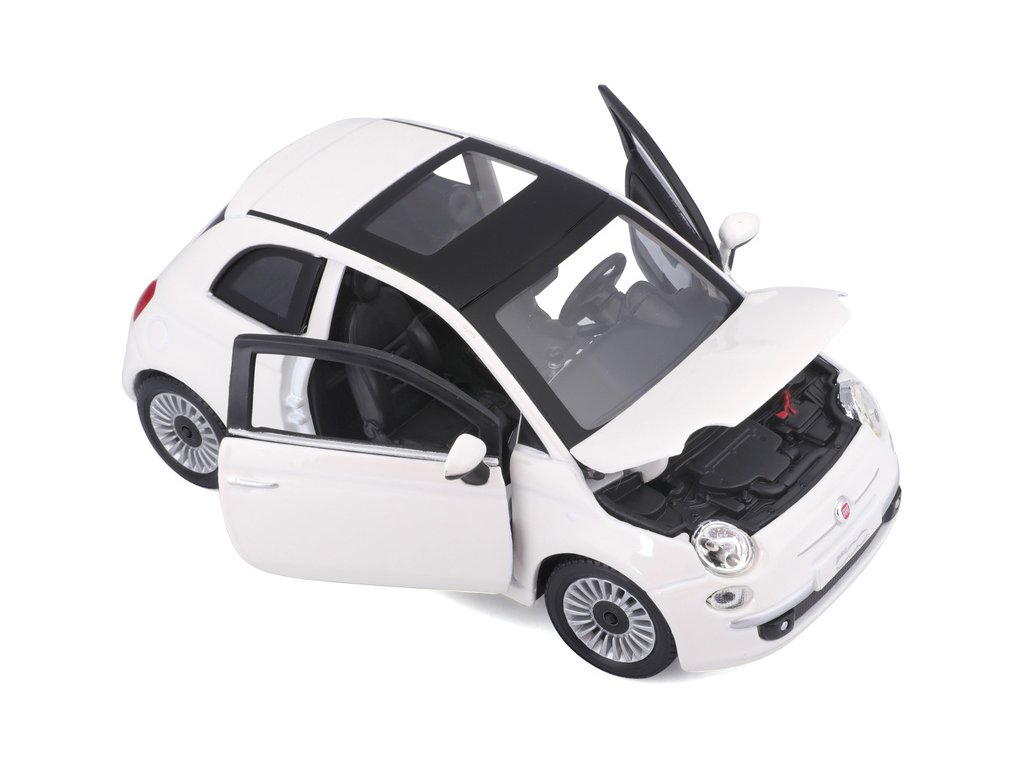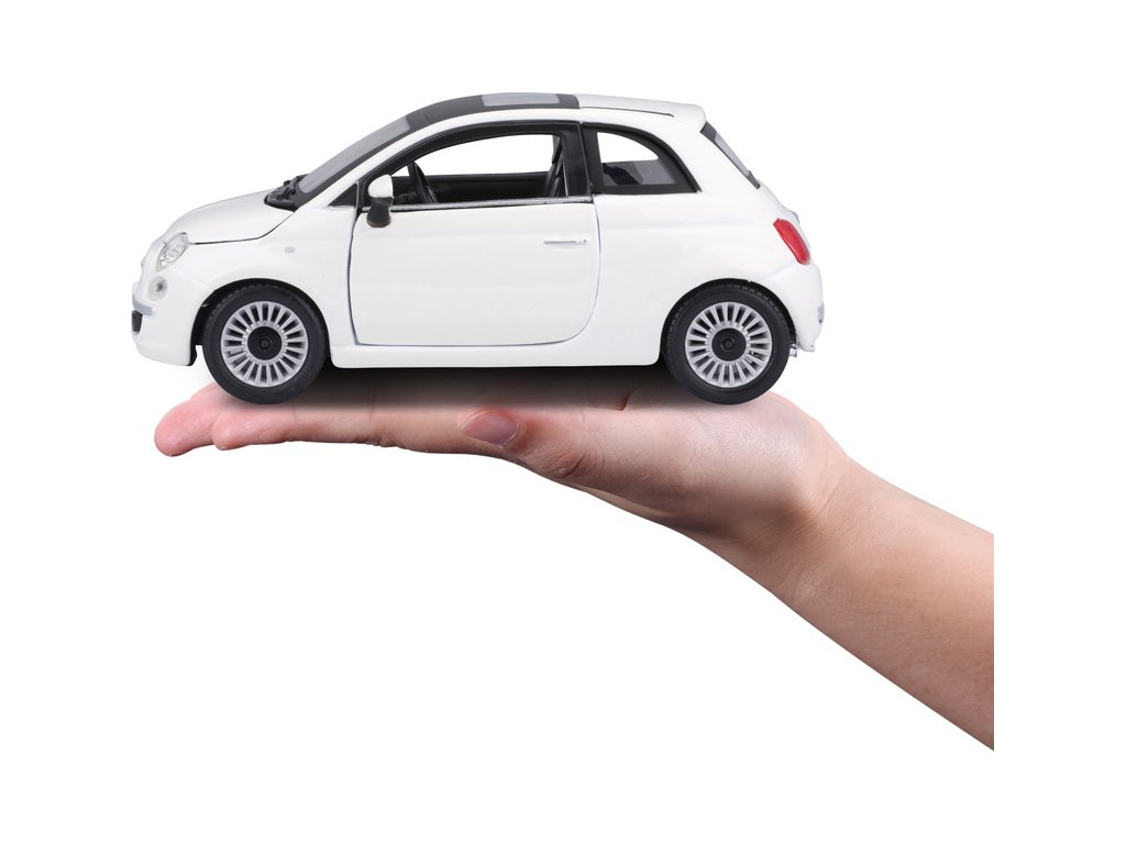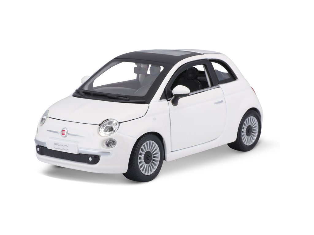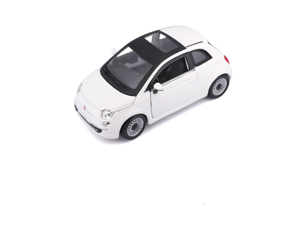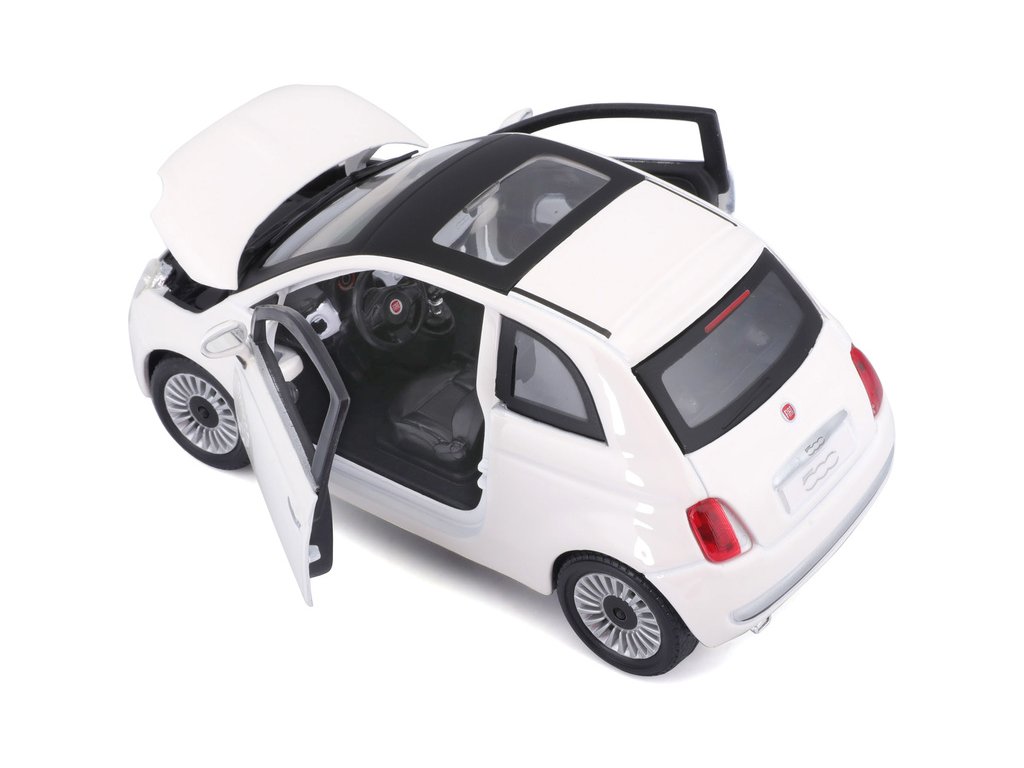 Kovový model auta 1:24 Bburago 18-22106 Fiat 500 (2007) nejen pro sběratele. Má otevírací dveře a kapotu, natáčení kol volantem je plně funkční. Barva modelu je bílá a je přibližně 18 cm velký.