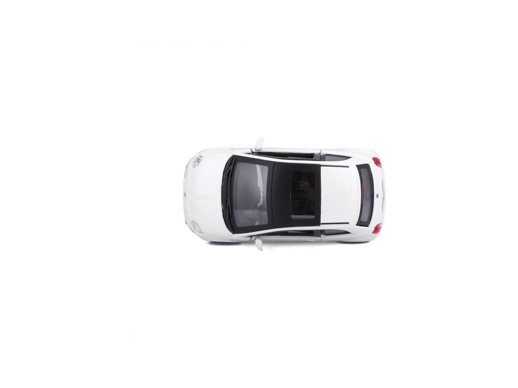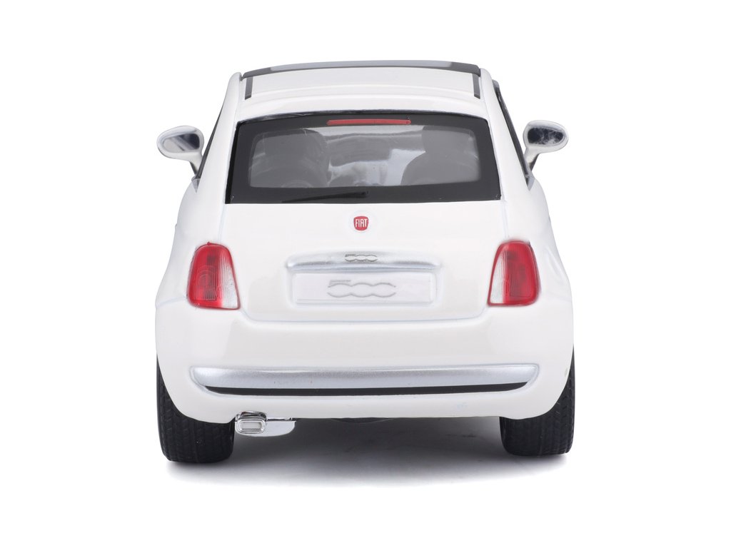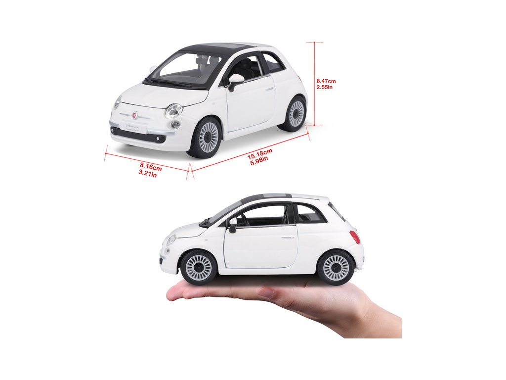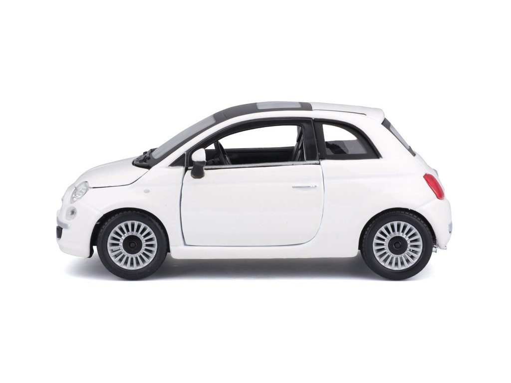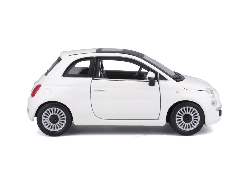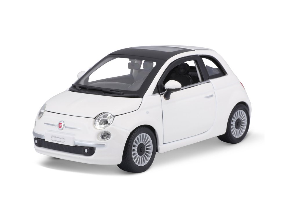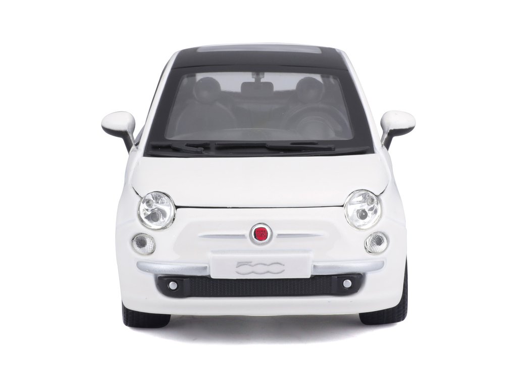 Kovový model auta 1:24 Bburago 18-22106 Fiat 500 (2007) nejen pro sběratele. Má otevírací dveře a kapotu, natáčení kol volantem je plně funkční. Barva modelu je bílá a je přibližně 18 cm velký.