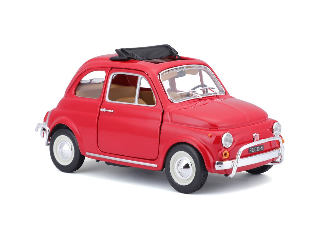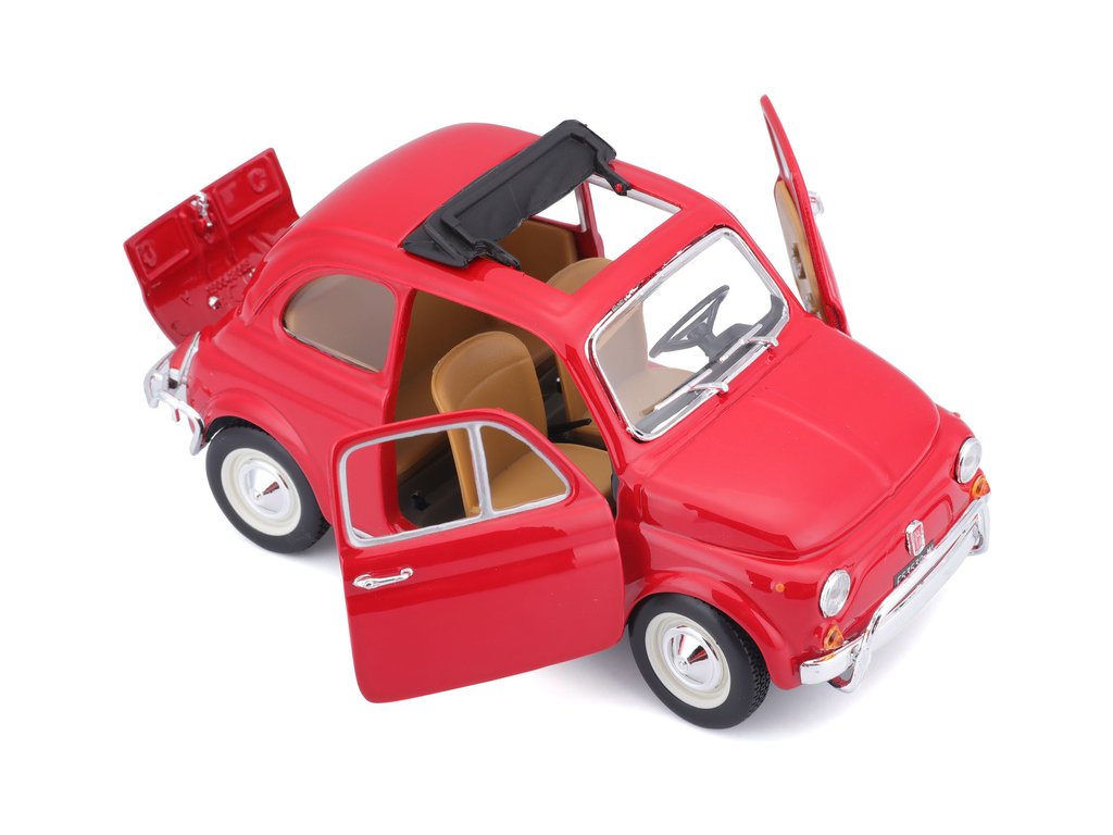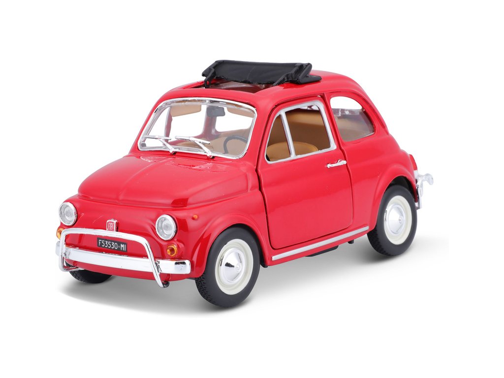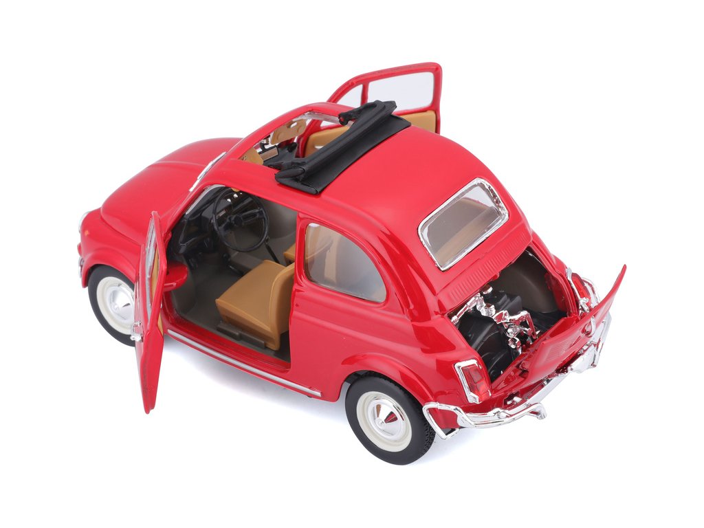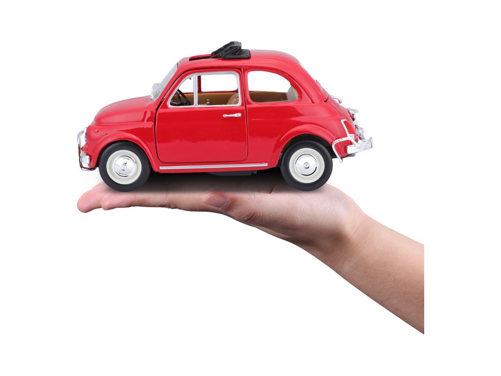 Kovový model auta 1:24 Bburago 18-22099 Fiat 500L z roku 1968 nejen pro sběratele. Má otevírací dveře a kapotu, natáčení kol volantem je plně funkční. Barva modelu je červená.