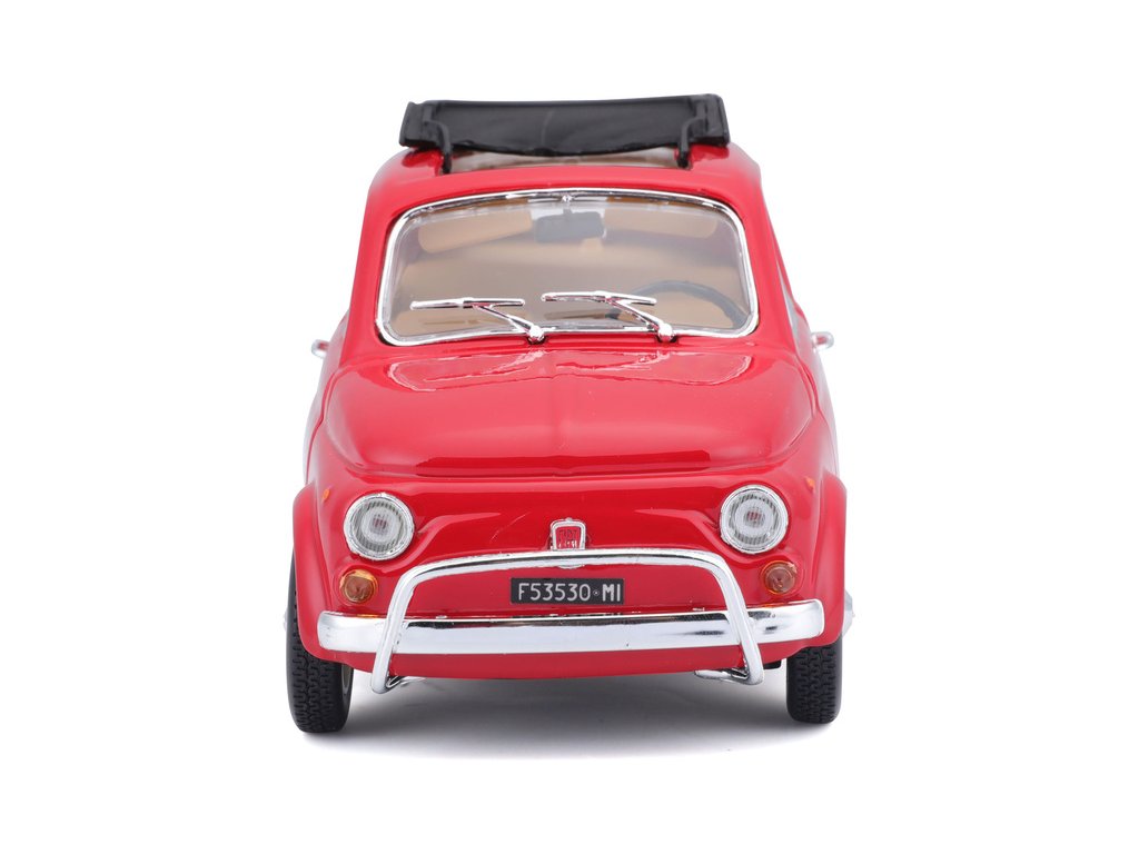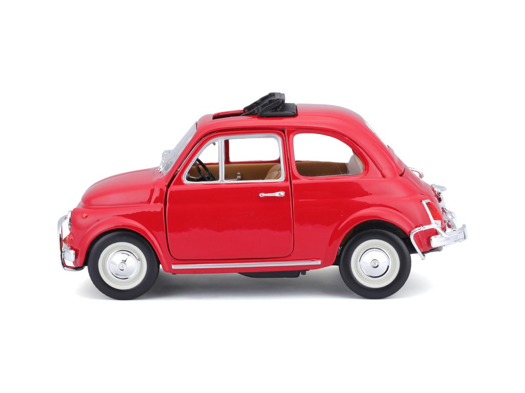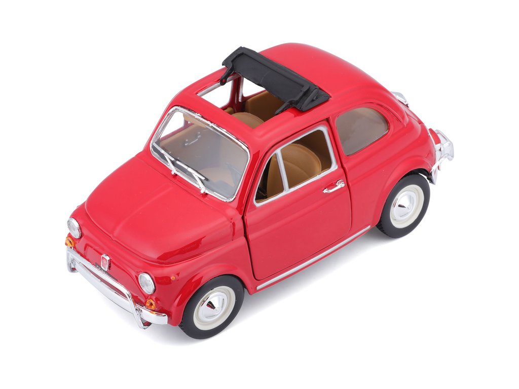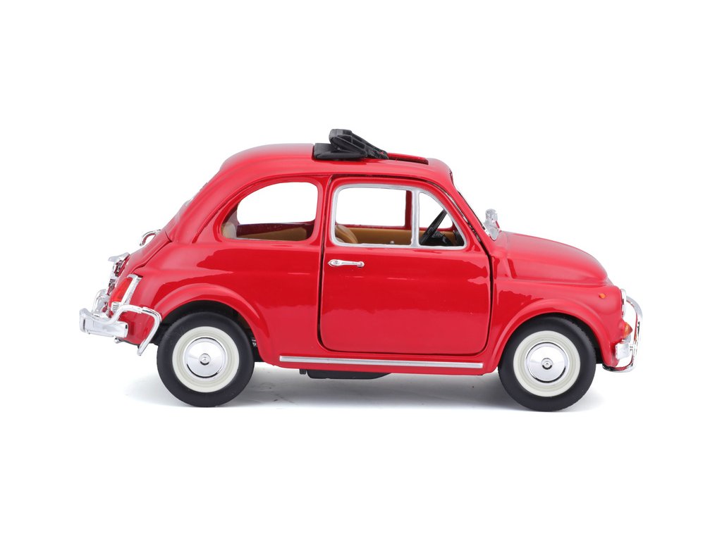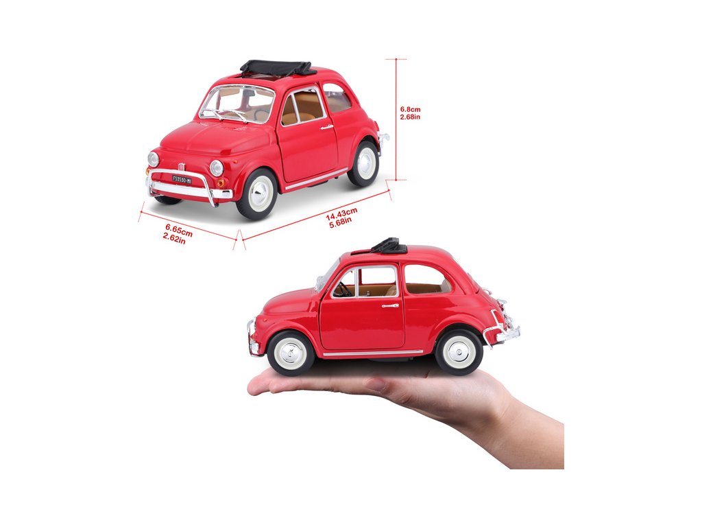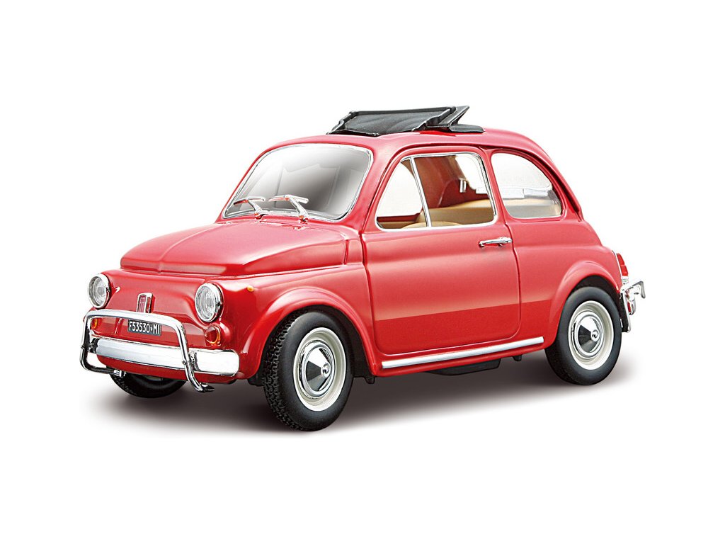 Kovový model auta 1:24 Bburago 18-22099 Fiat 500L z roku 1968 nejen pro sběratele. Má otevírací dveře a kapotu, natáčení kol volantem je plně funkční. Barva modelu je červená.
