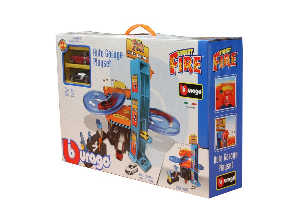 Herní set pro malé závodníky Bburago 18-30361 Street Fire Downhill je snem každého malého řidiče! S třípatrovou garáž s mnoha barevnými doplňky, mechanickým výtahem, čerpací stanicí, automyčkou a dvojici autíček v měřítku 1:43 ( přibližně 10 cm velké ) si užijí spoustu zábavy sami i se svým kamarádem.