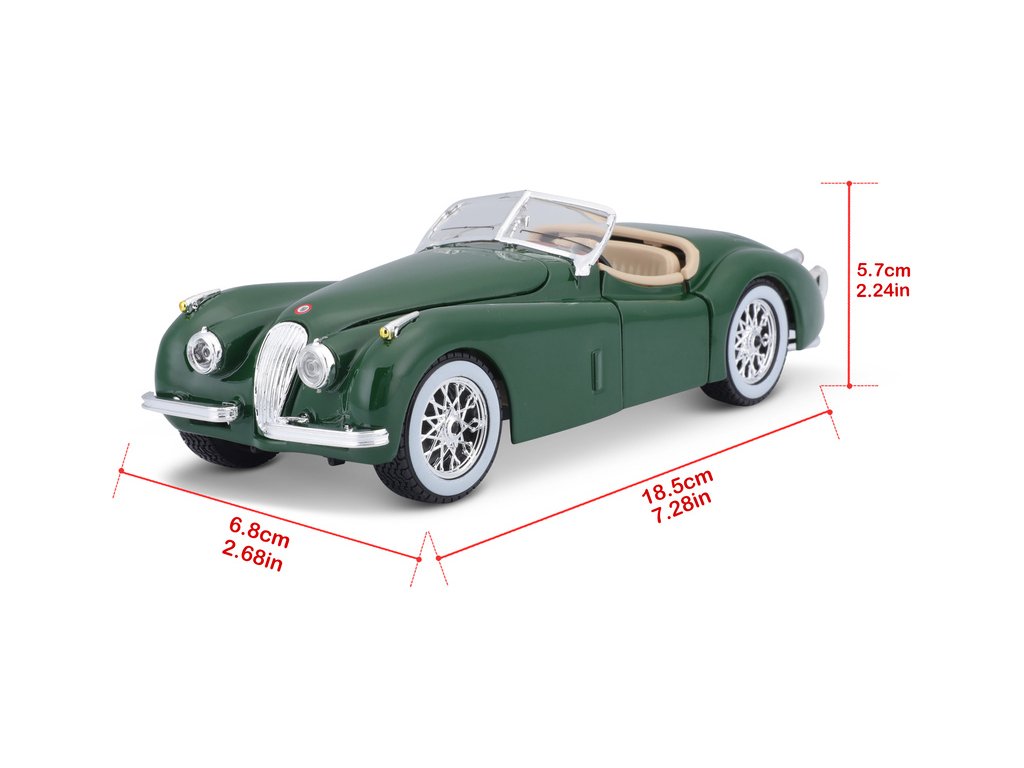 Kovový model auta 1:24 Bburago 18-22018 Jaguar XK 120 Roadster (1951) nejen pro sběratele. Má otevírací dveře a kapotu, natáčení kol volantem je plně funkční. Barva modelu je zelená a je přibližně 18 cm velký.