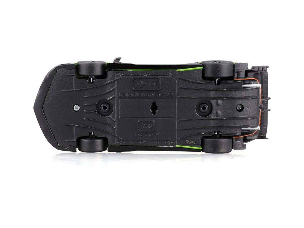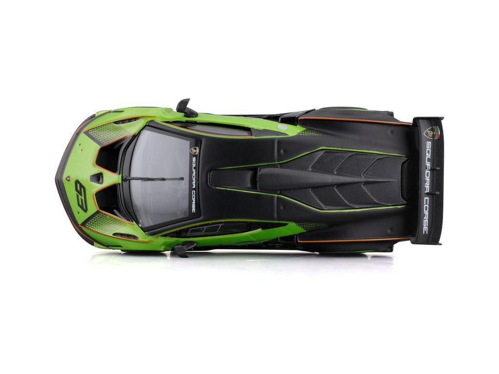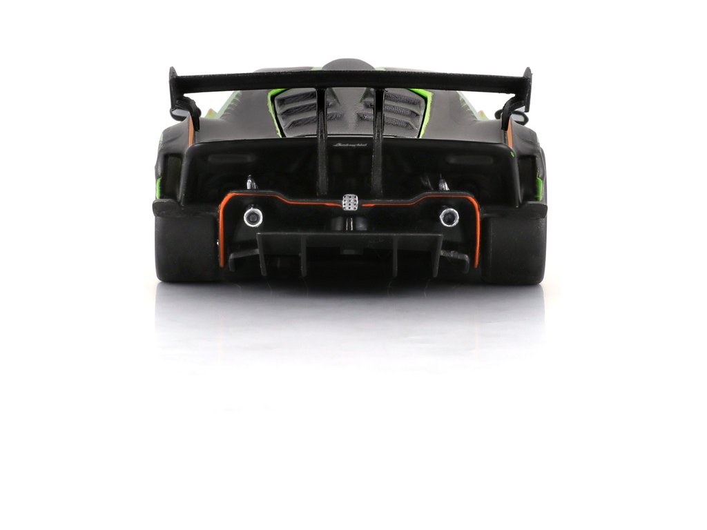 Kovový model auta 1:32 Bburago 18-41161 Lamborghini Essenza SCV12 nejen pro sběratele. Model je asi 13 cm velký a má černou a zelenou barvu se závodním číslem. Model je v detailním provedení, skvělá úroveň zpracování.