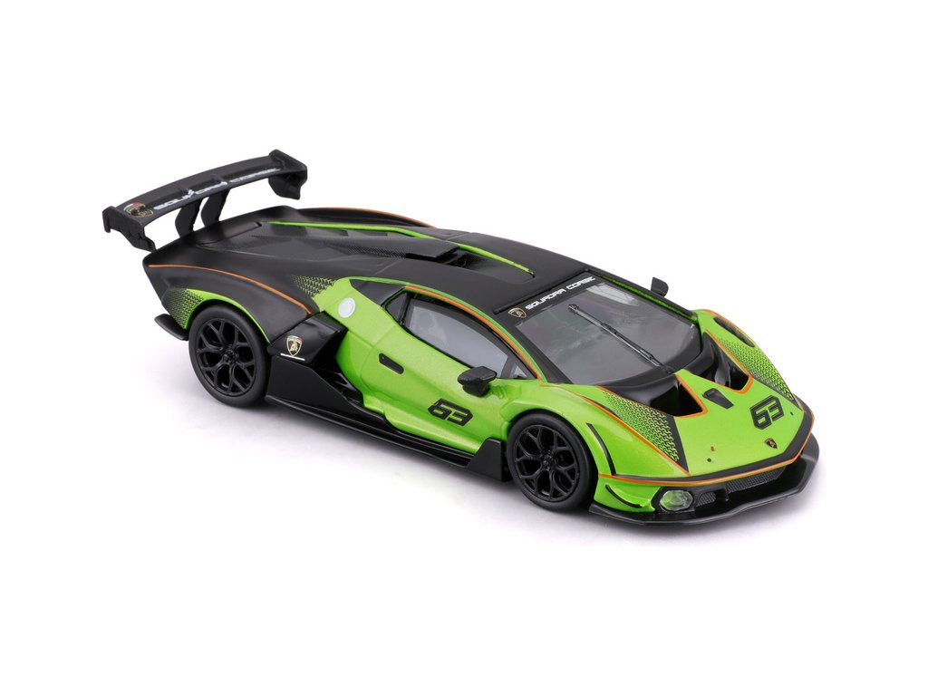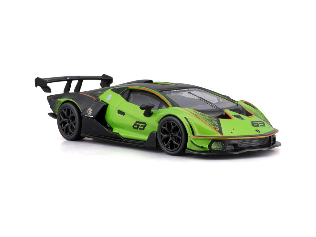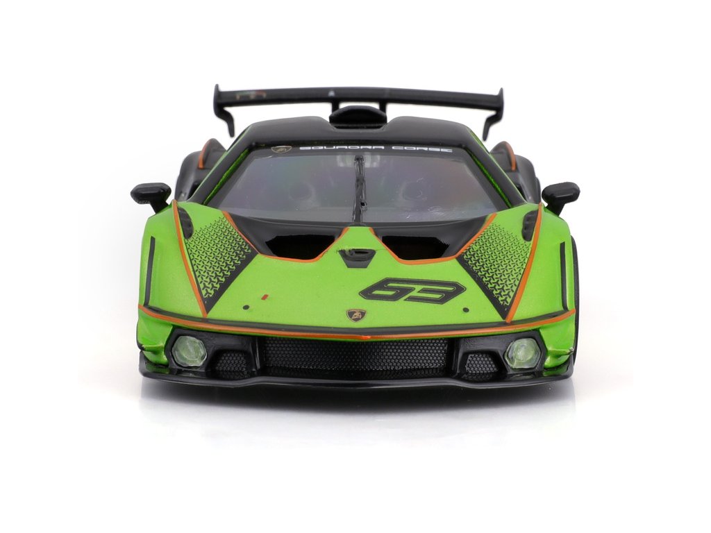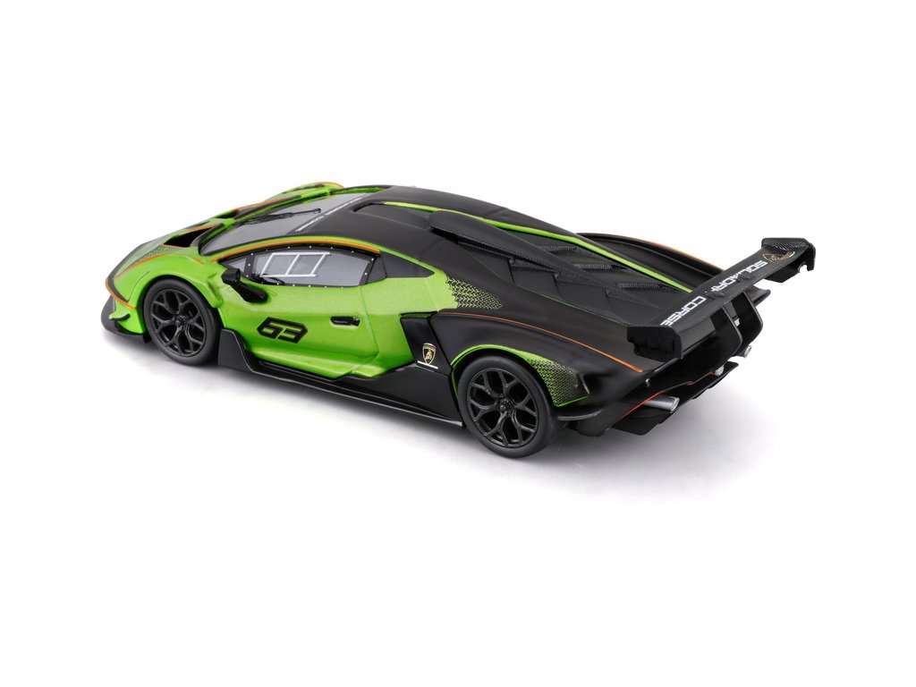 Kovový model auta 1:32 Bburago 18-41161 Lamborghini Essenza SCV12 nejen pro sběratele. Model je v černé a zelené barvě se závodním číslem.