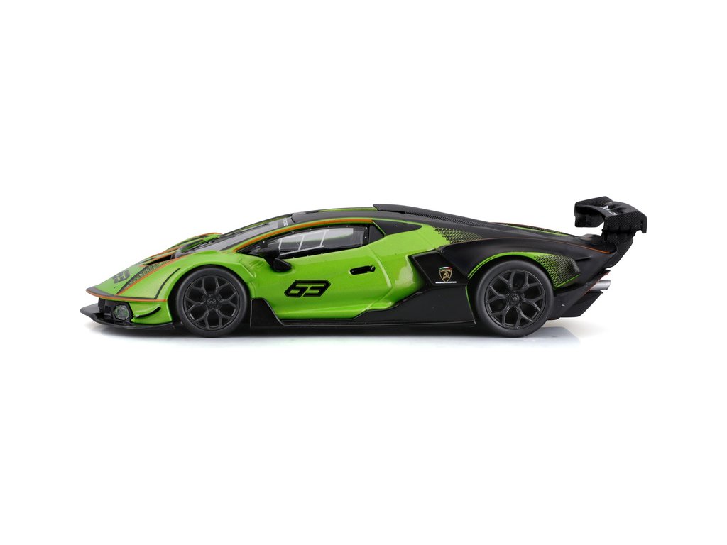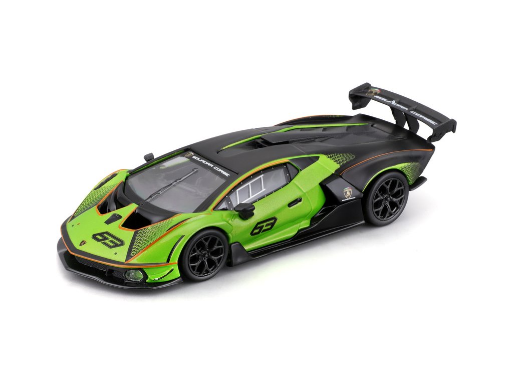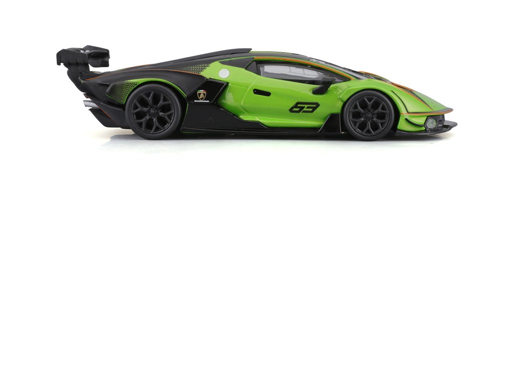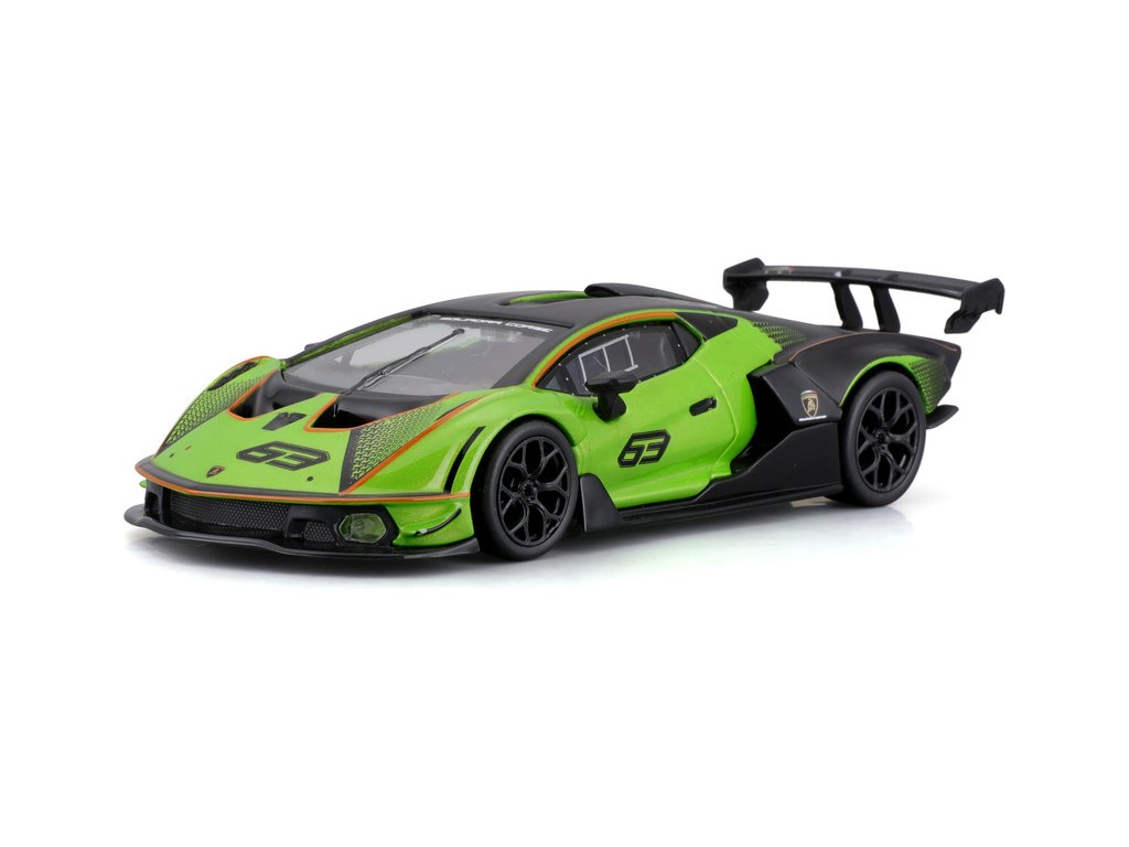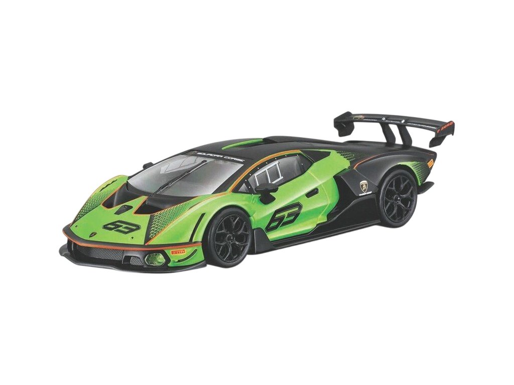 Kovový model auta 1:32 Bburago 18-41161 Lamborghini Essenza SCV12 nejen pro sběratele. Model je v černé a zelené barvě se závodním číslem.