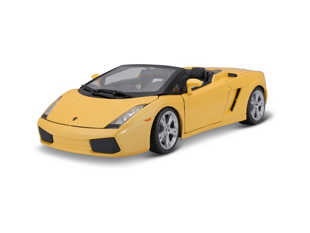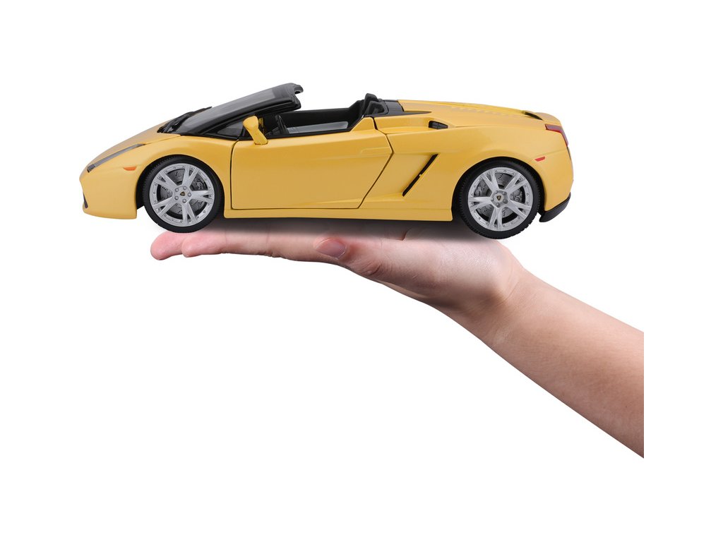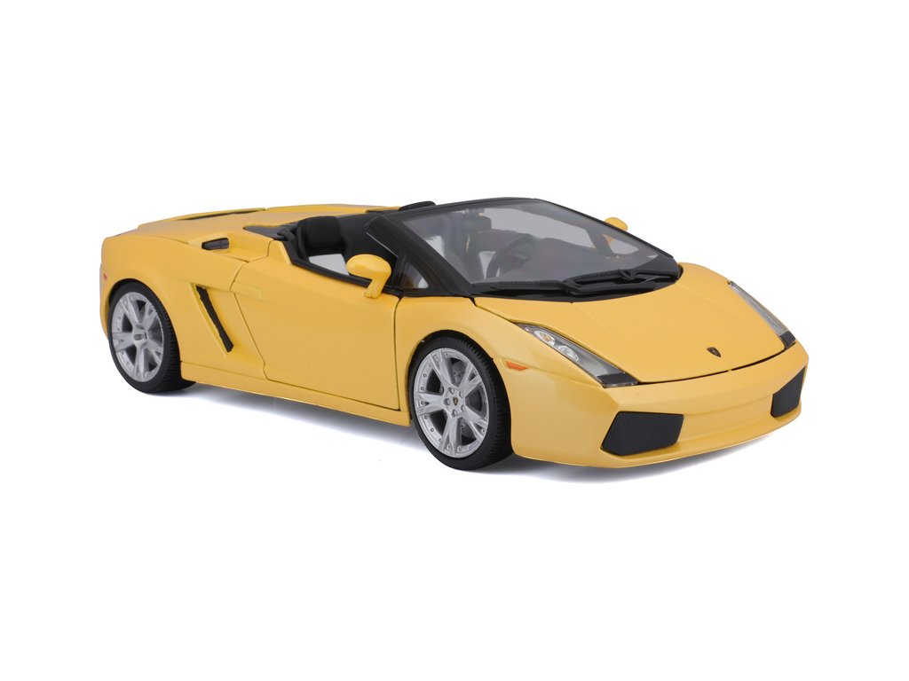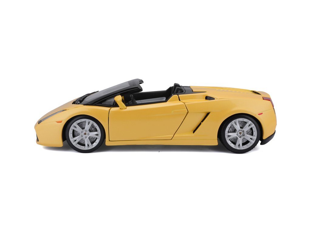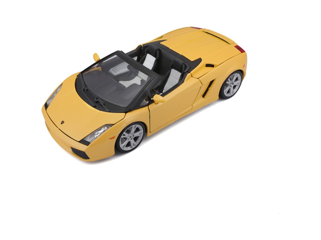Kovový model auta 1:18 Bburago 18-12016 Lamborghini Gallardo Spyder nejen pro sběratele. Má otevírací dveře a kapotu, natáčení kol volantem je plně funkční. Barva modelu je žlutá metalíza a je velký přibližně 24 cm .