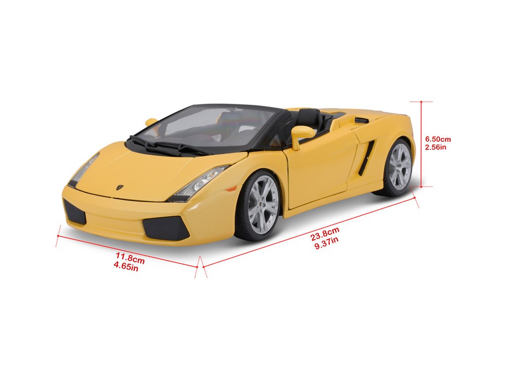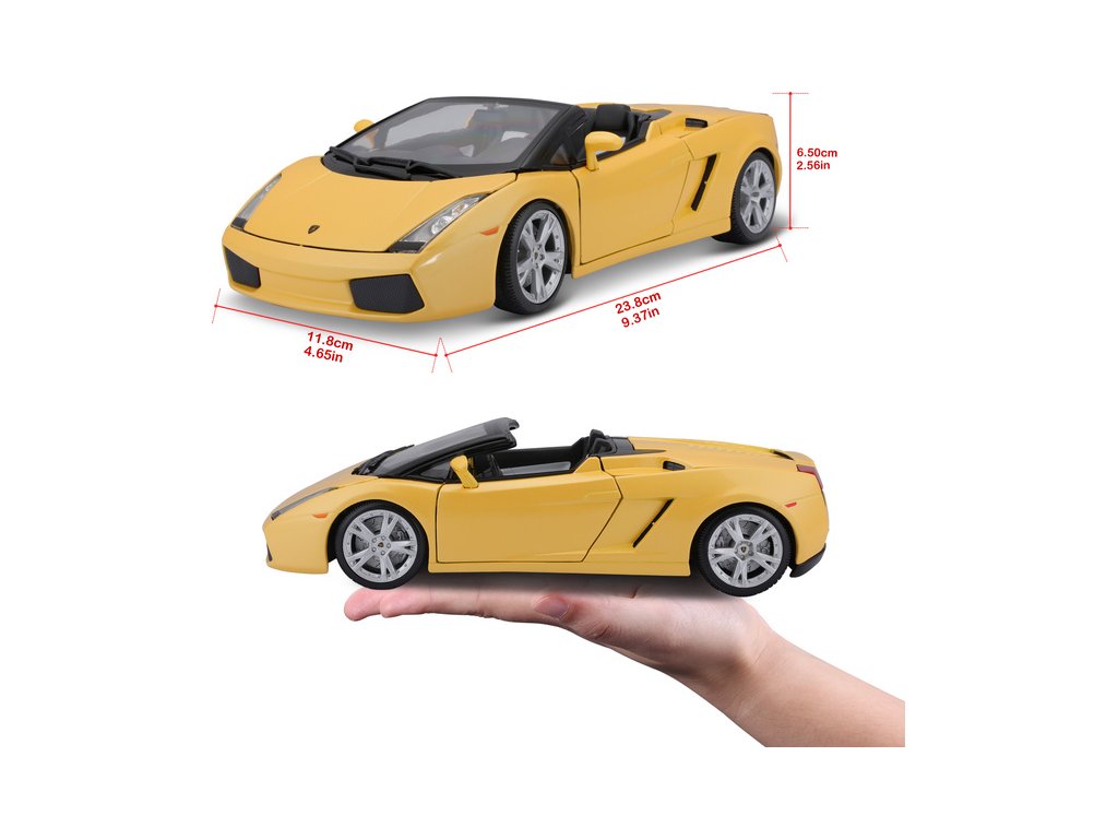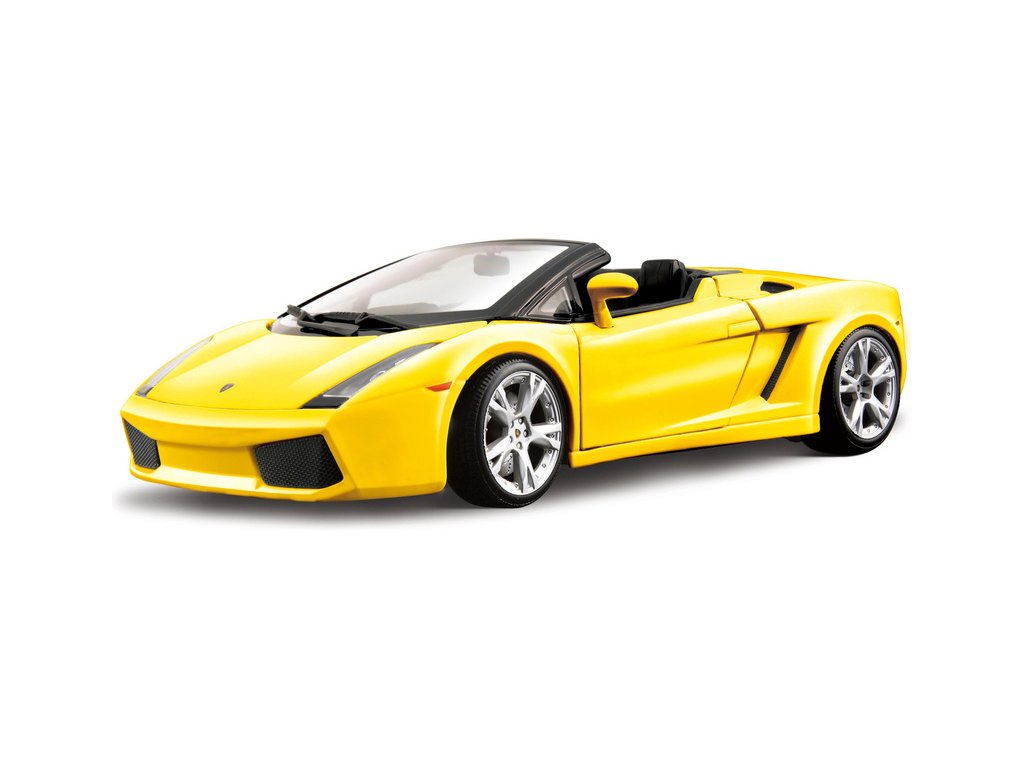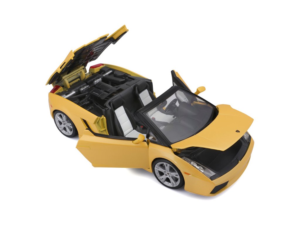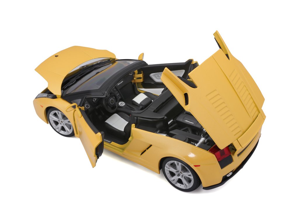 Kovový model auta 1:18 Bburago 18-12016 Lamborghini Gallardo Spyder nejen pro sběratele. Má otevírací dveře a kapotu, natáčení kol volantem je plně funkční. Barva modelu je žlutá metalíza a je velký přibližně 24 cm .