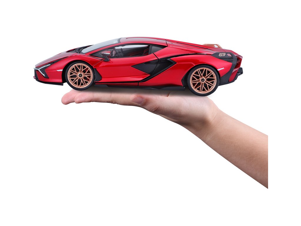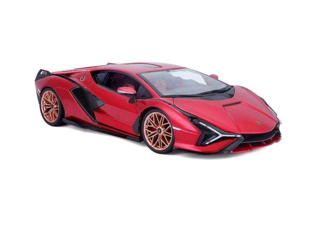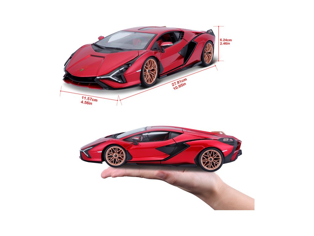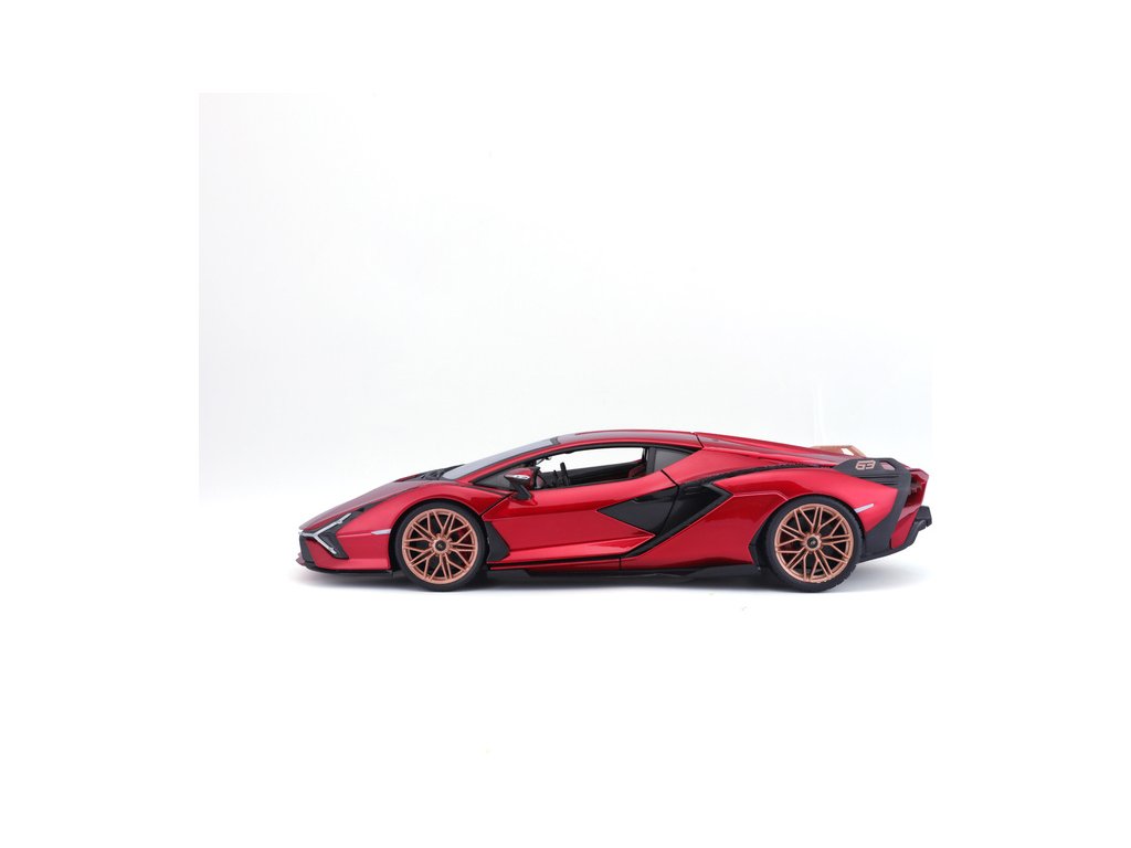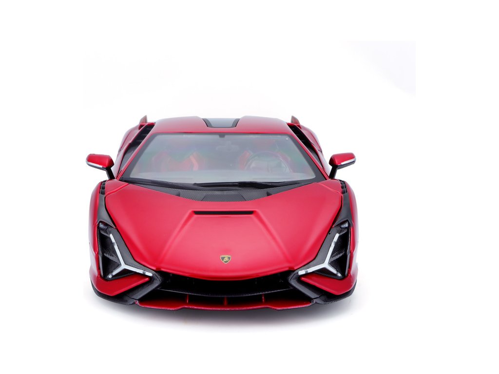 Kovový model auta 1:18 Bburago 18-11046 Lamborghini Sián FKP 37 nejen pro sběratele. Má otevírací dveře a kapotu, natáčení kol volantem je plně funkční. Barva modelu je červená a je přibližně 24 cm velký.