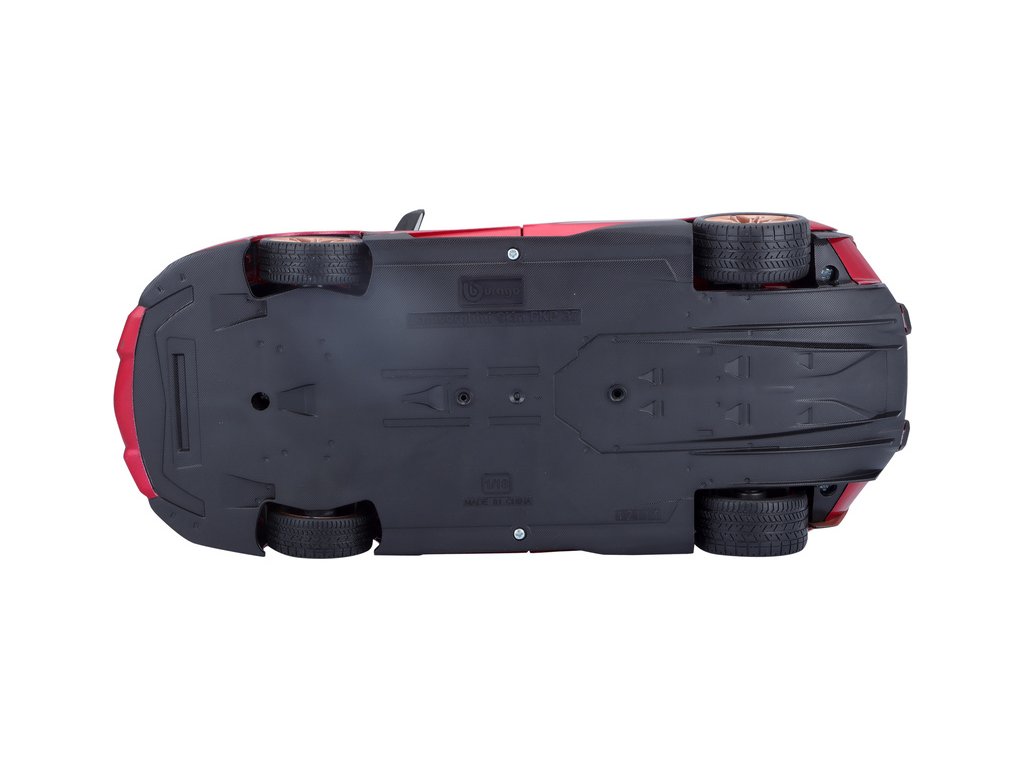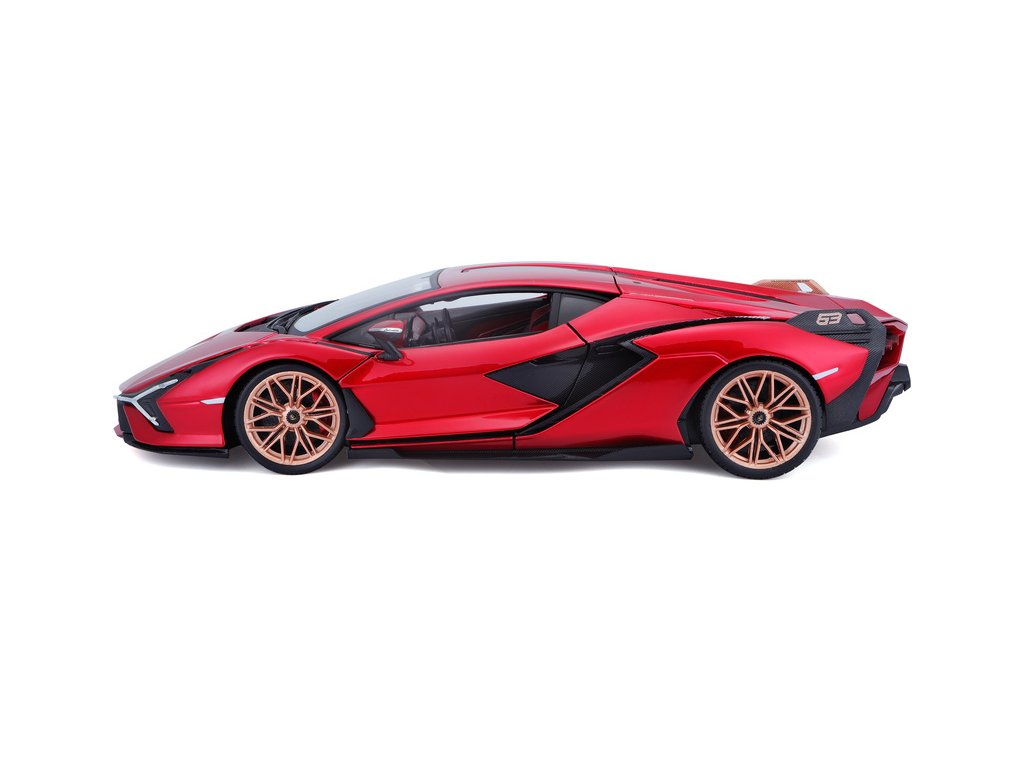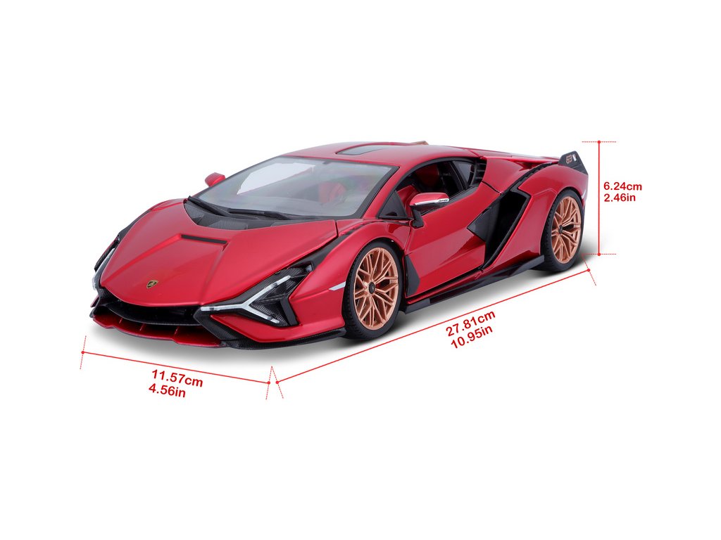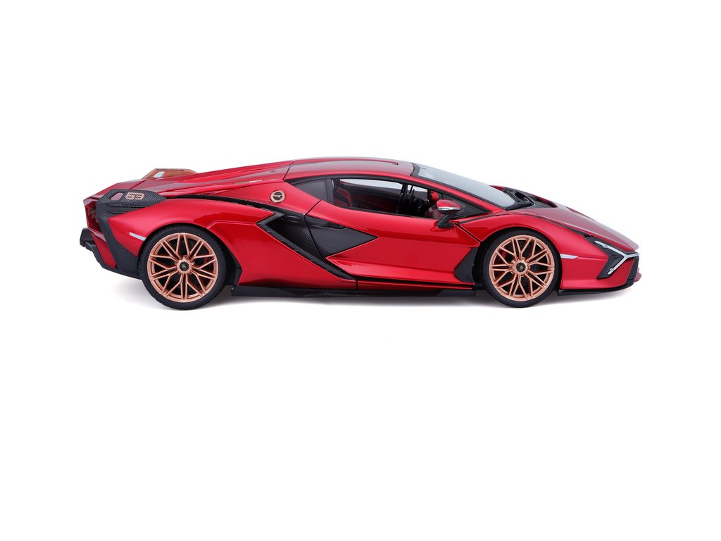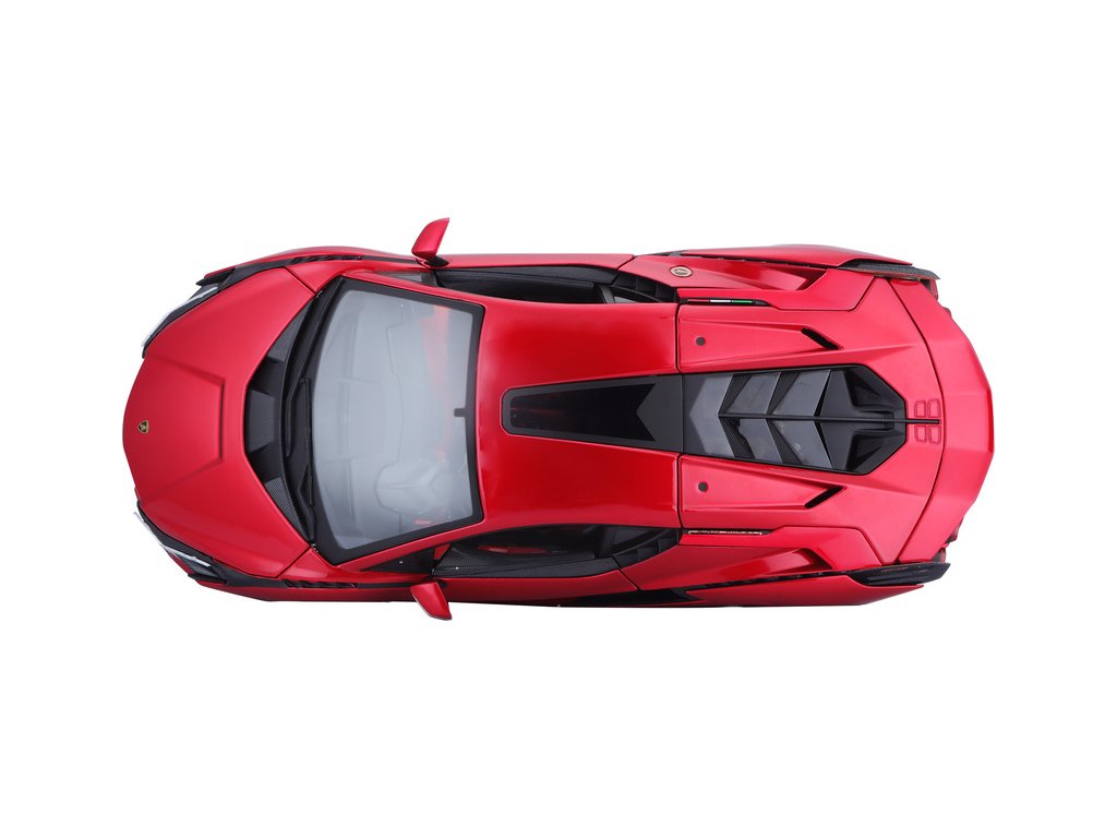 Kovový model auta 1:18 Bburago 18-11046 Lamborghini Sián FKP 37 nejen pro sběratele. Má otevírací dveře a kapotu, natáčení kol volantem je plně funkční. Barva modelu je červená a je přibližně 24 cm velký.