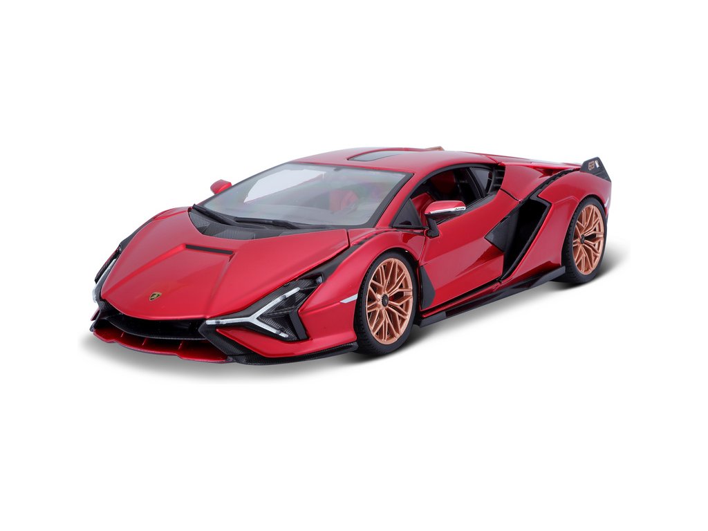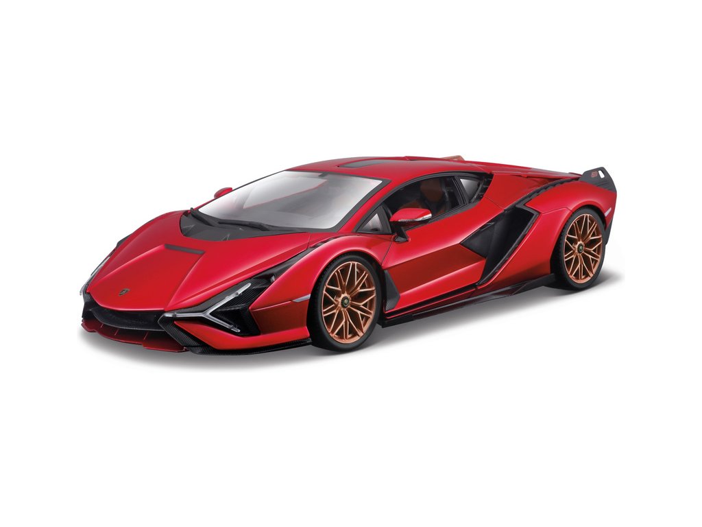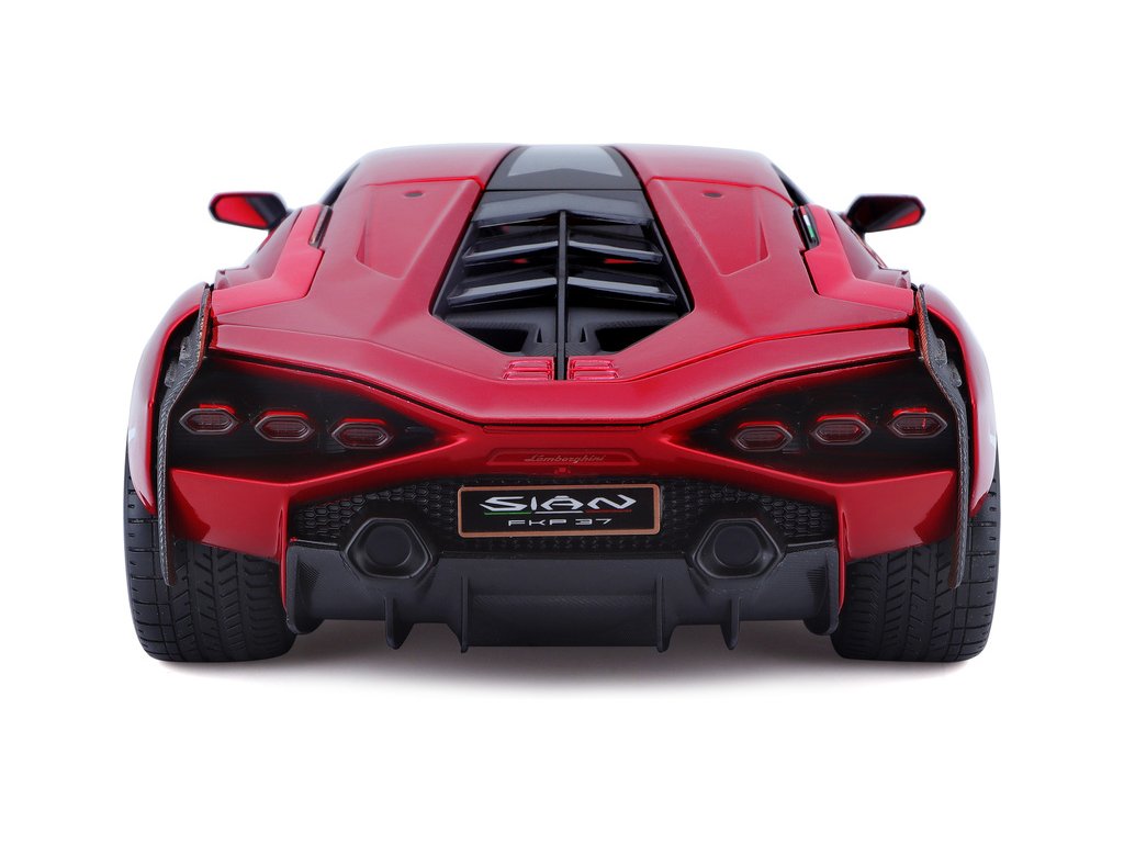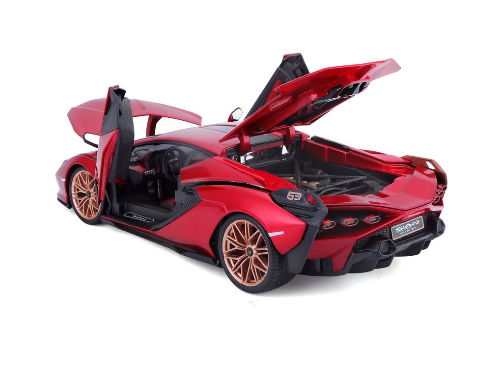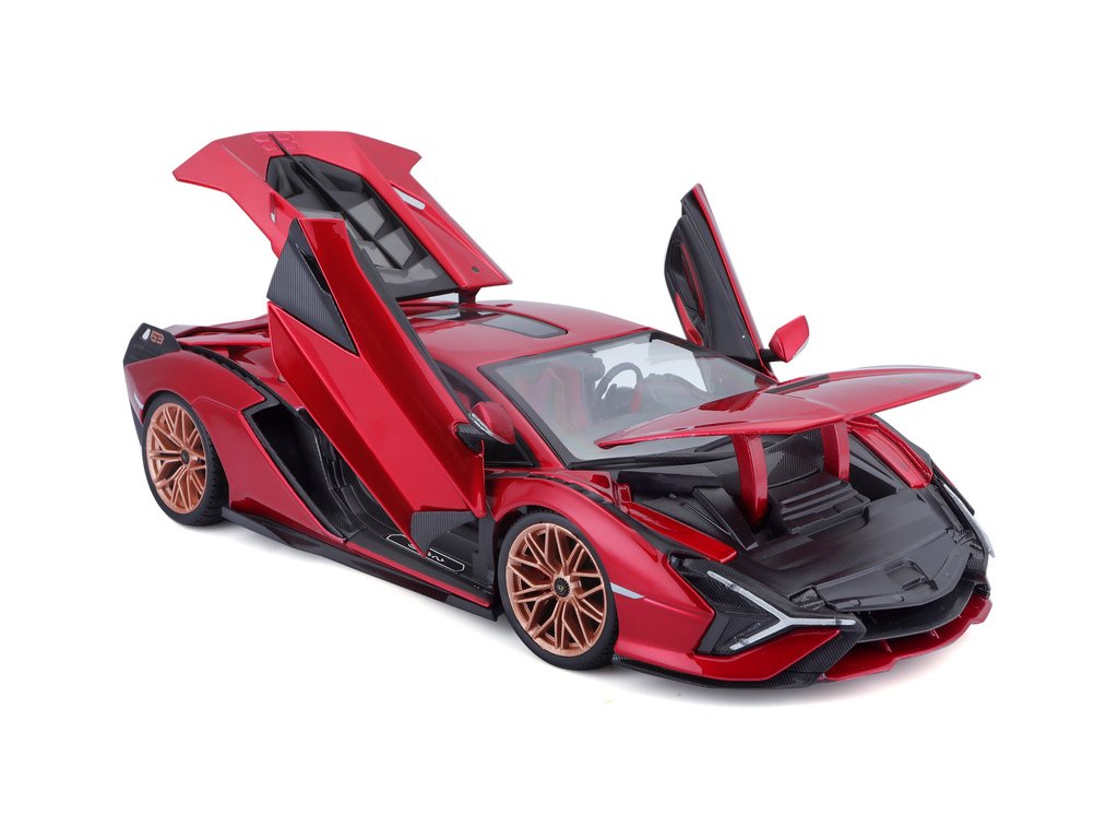 Kovový model auta 1:18 Bburago 18-11046 Lamborghini Sián FKP 37 nejen pro sběratele. Má otevírací dveře a kapotu, natáčení kol volantem je plně funkční. Barva modelu je červená.