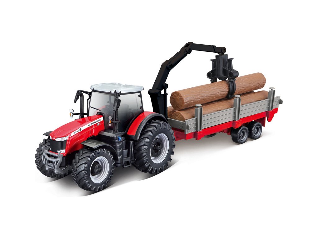 Model zemědělského traktoru Bburago 18-31659 - Massey Ferguson 8740S s vlečkou a dřevem. Je vyroben z kovových a plastových dílů. Model má pryžové kolečka na setrvačník, odjímatelnou kabinu. Traktor s vlečkou je přibližně 30 cm velký.