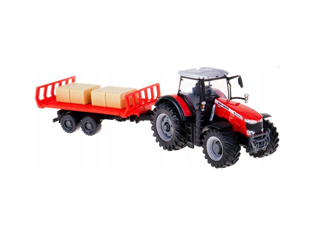 Model zemědělského traktoru Bburago 18-31675 - Massey Ferguson 8740S s vlečkou a balíky sena. Je vyroben z kovových a plastových dílů. Model má pryžové kolečka a detailní zpracování. Model v červené barvě je přibližně 10 cm velký.