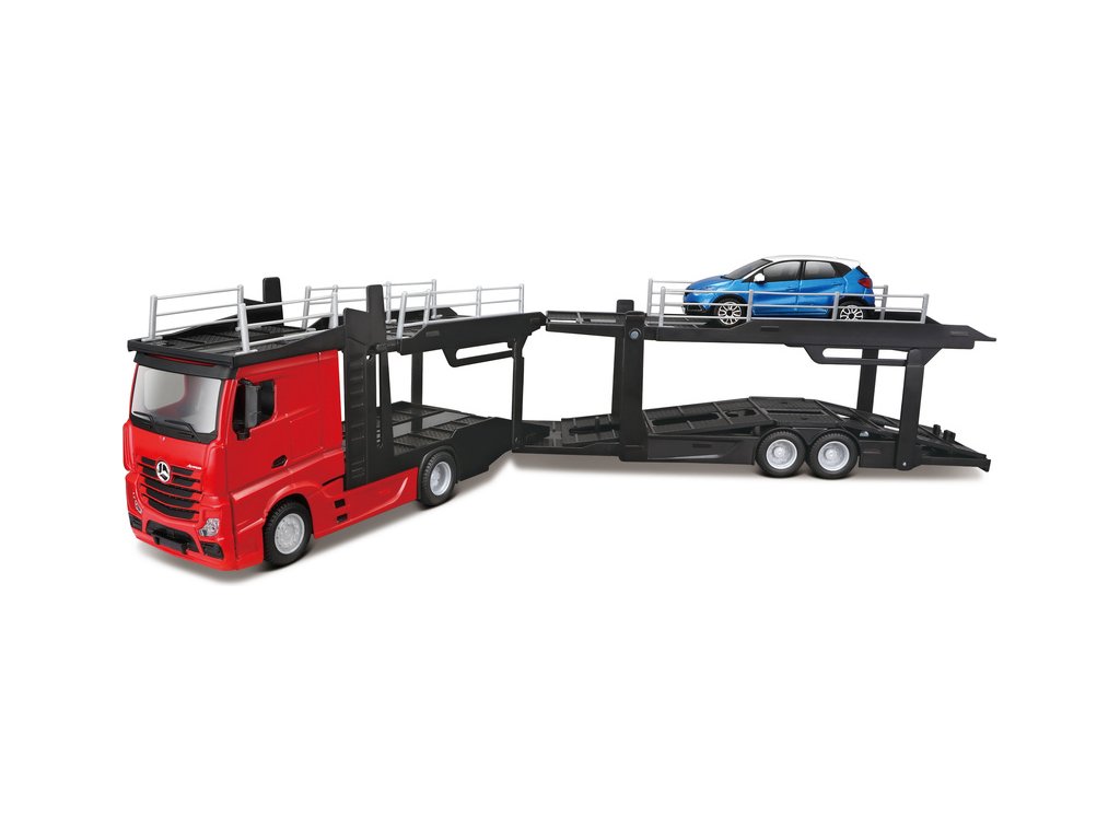 Kovový model Bburago 18-31457 - Mercedes-Benz Actros s Renault Captur v měřítku 1:43. Jsou vyroben z kovových a plastových dílů v detailním zpracování. Actros má patrové pohyblivé nákladové plochy, které se dají rozdělit na dvě části. Sestavený je přibližně 47 cm velký a je červené barvy. Autíčko Captur má modrou barvu a je přibližně 10 cm velké.