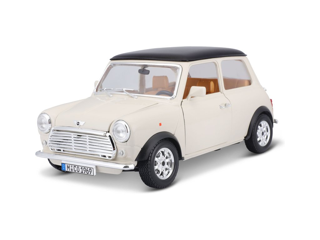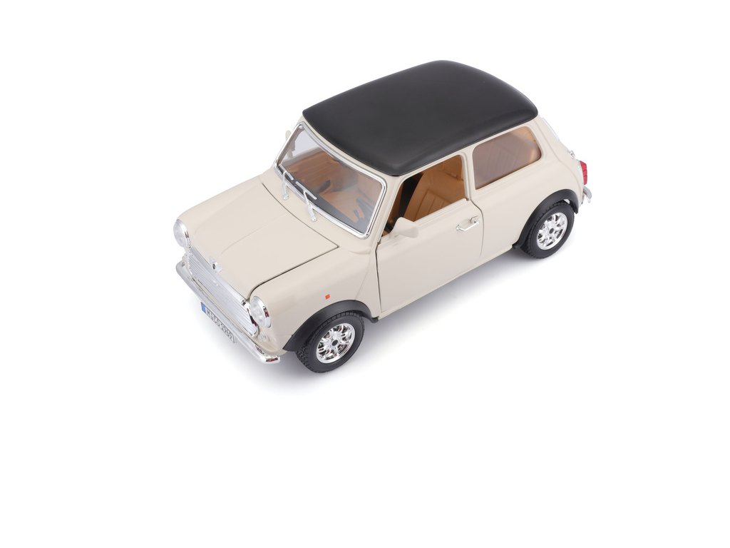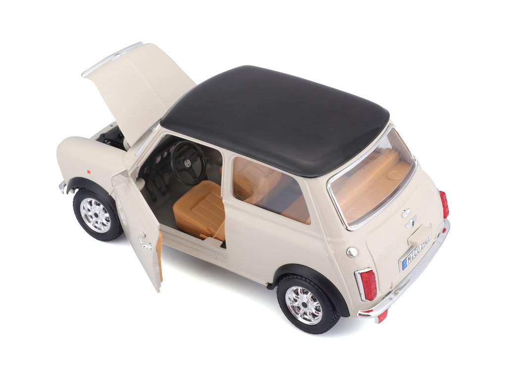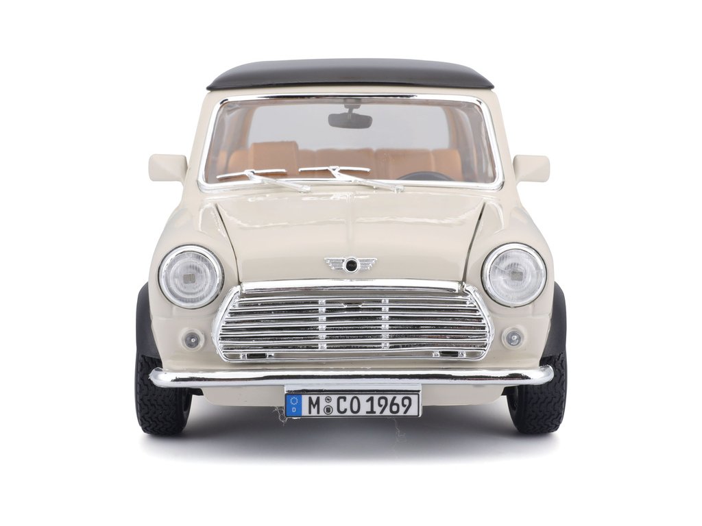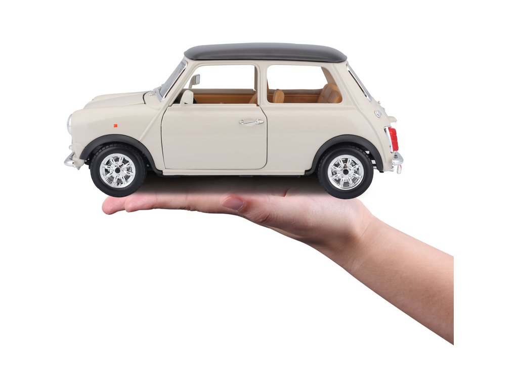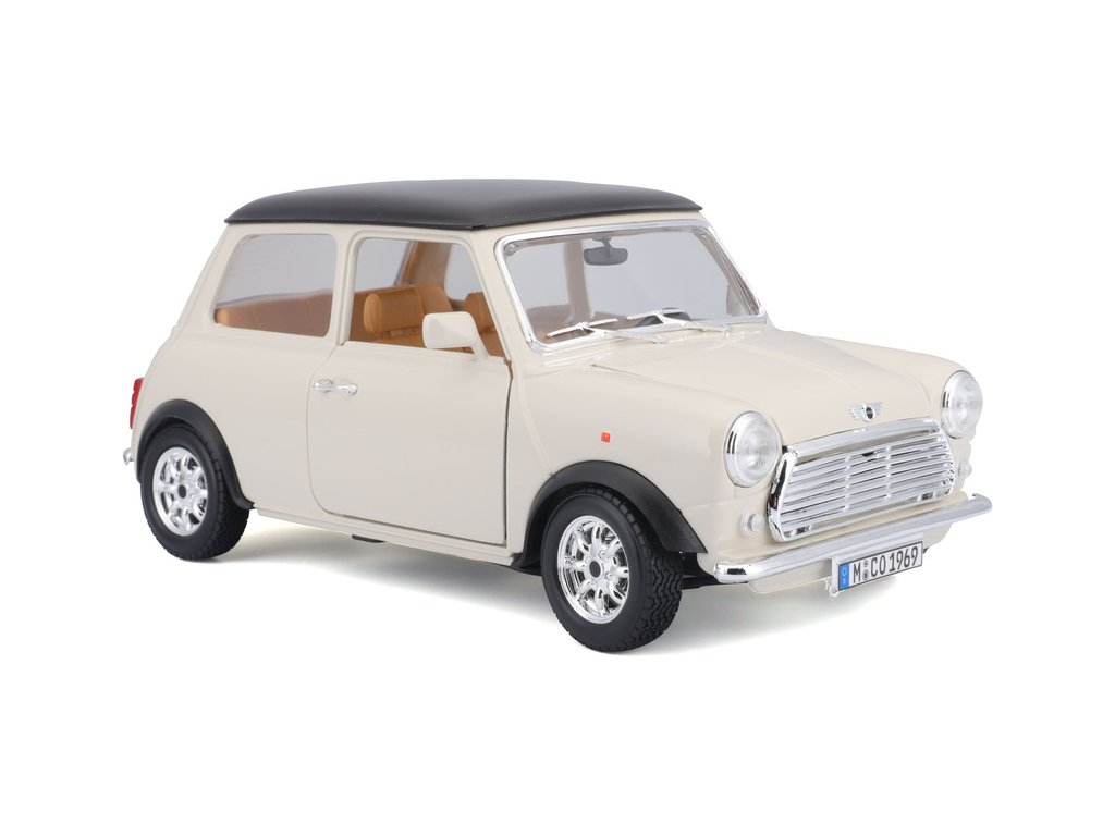 Kovový model auta 1:18 Bburago 18-12036 Mini Cooper z roku 1969 nejen pro sběratele. Má otevírací dveře a kapotu, natáčení kol volantem je plně funkční. Barva modelu je krémová a je přibližně 20 cm velký.