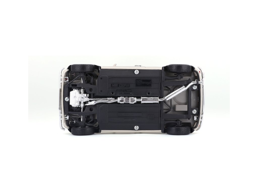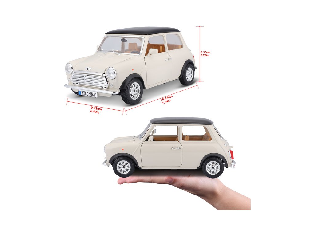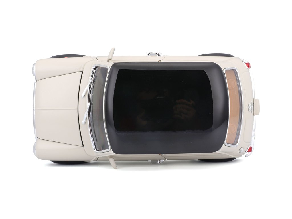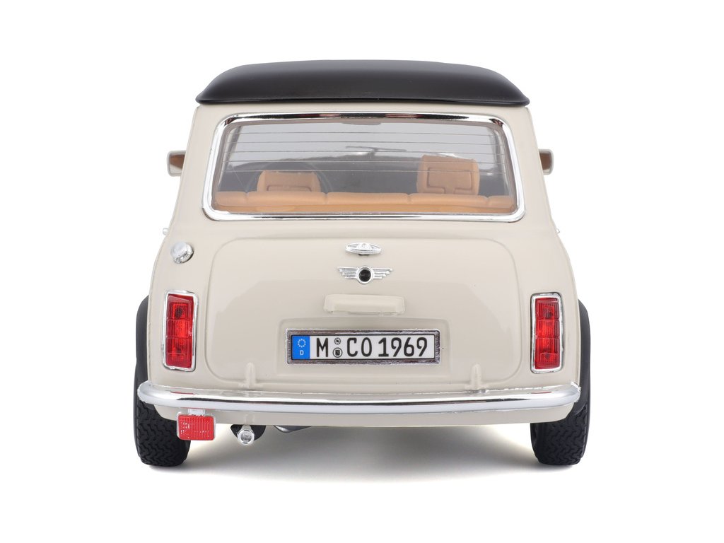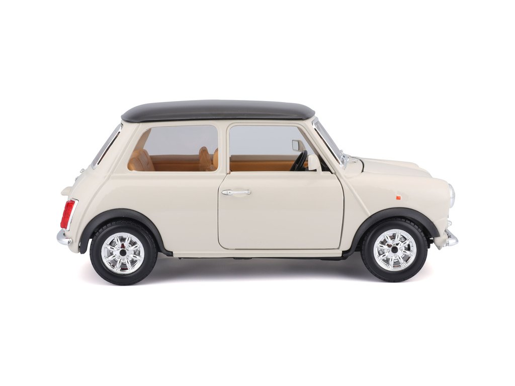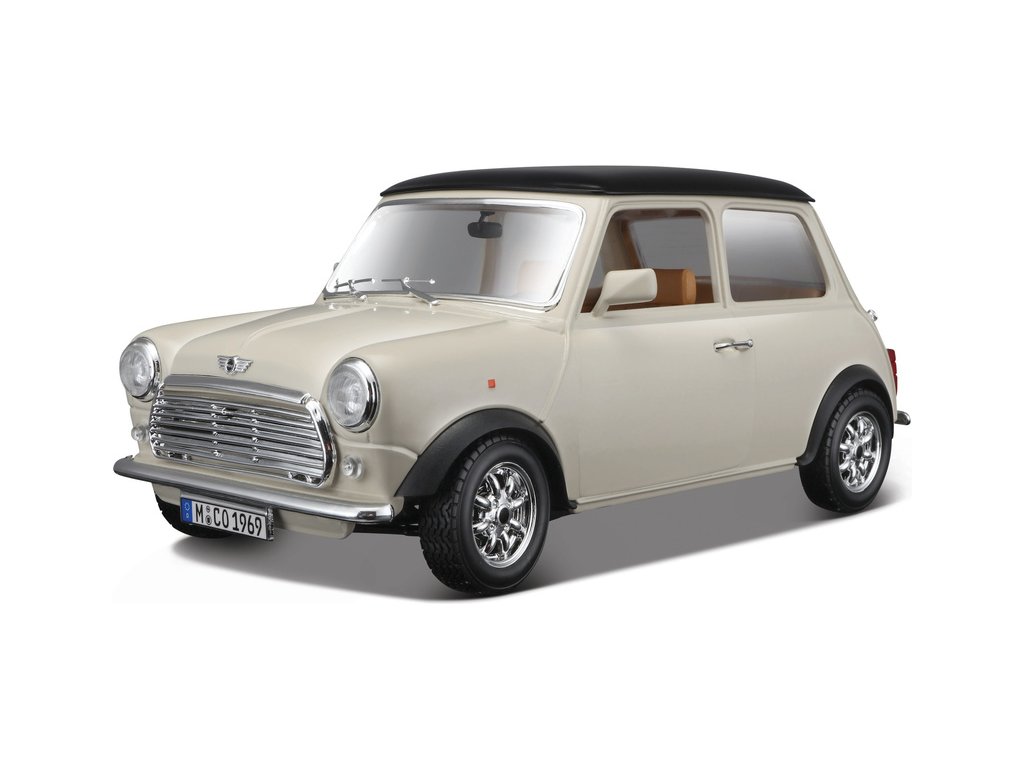 Kovový model auta 1:18 Bburago 18-12036 Mini Cooper z roku 1969 nejen pro sběratele. Má otevírací dveře a kapotu, natáčení kol volantem je plně funkční. Barva modelu je krémová a je přibližně 20 cm velký.