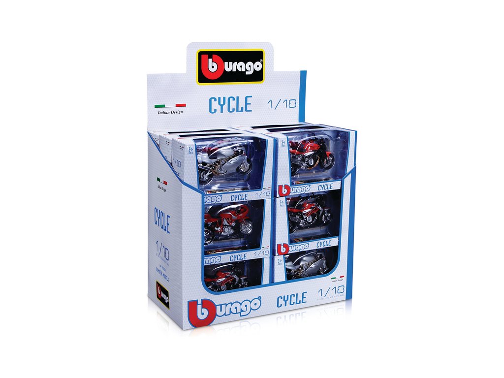 Modely motorek Bburago jsou uloženy a prodávány v prodejním displeji. Display obsahuje celkem 18 modelů motorek - náhodný výběr z níže uvedeného seznamu.