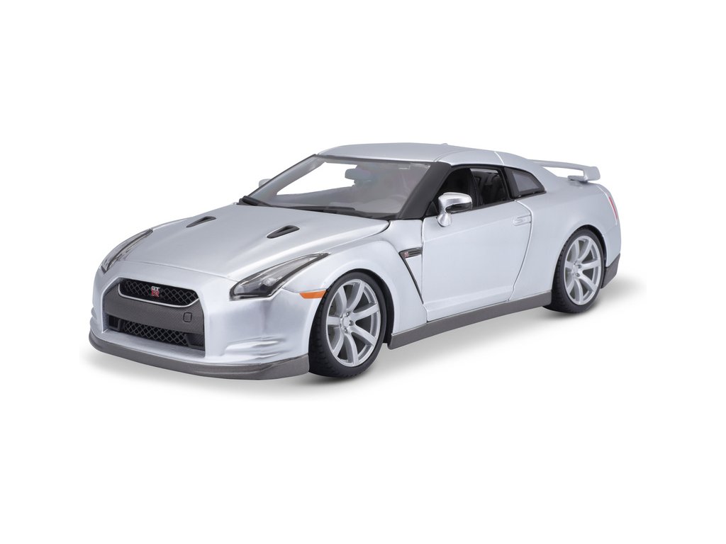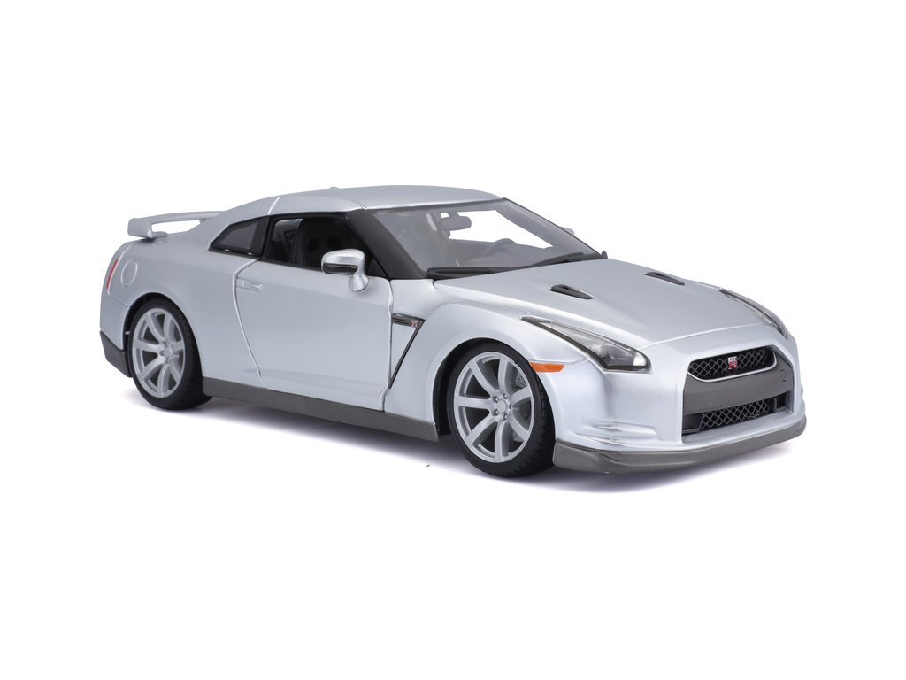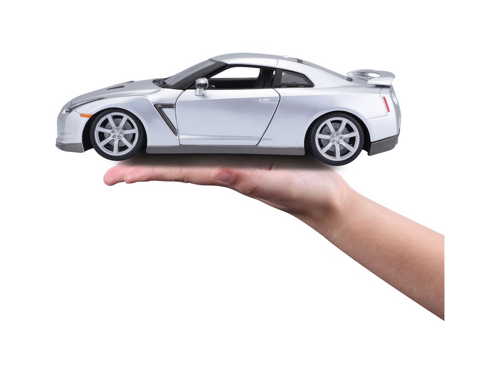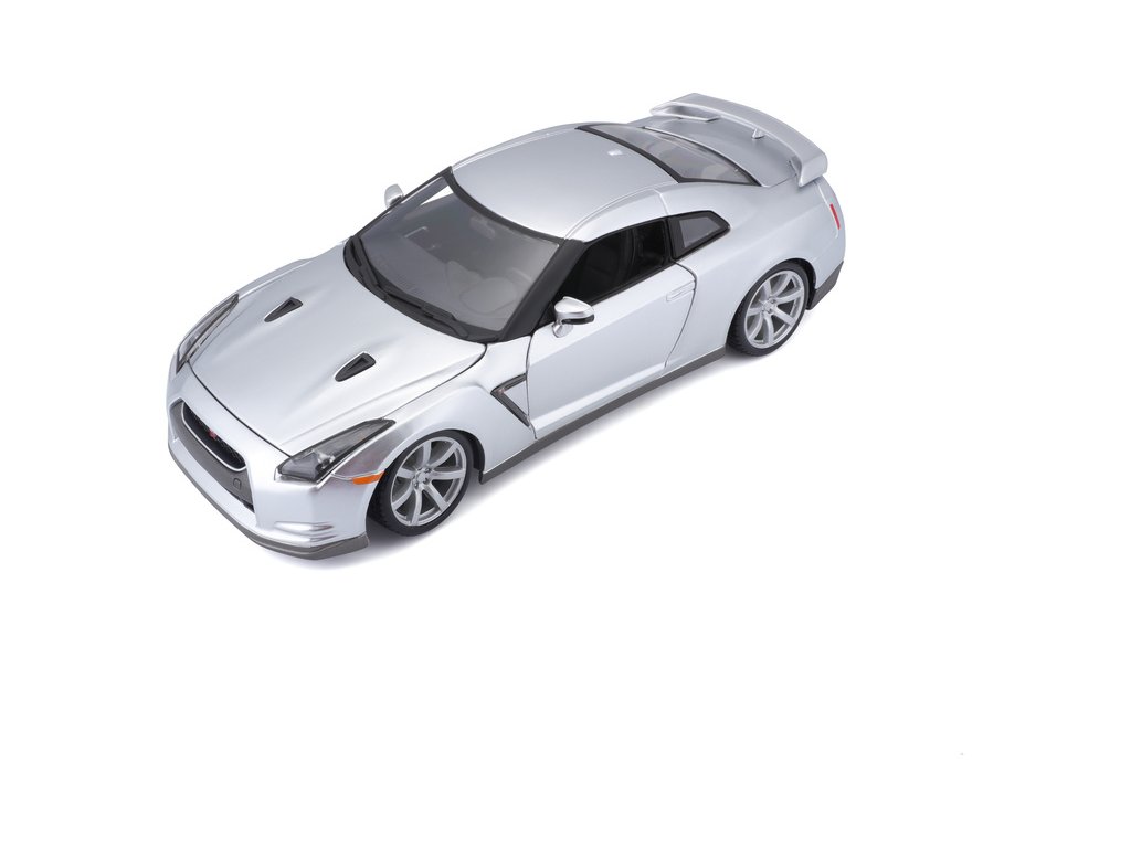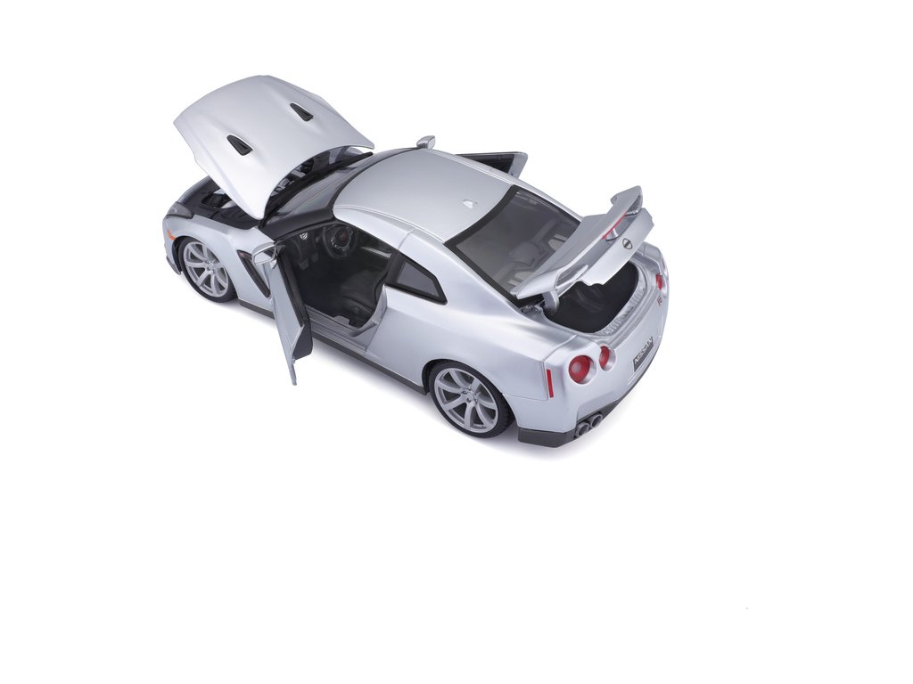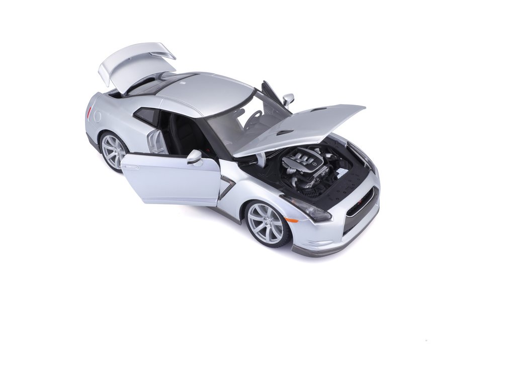 Kovový model auta 1:18 Bburago 18-12079 2009 Nissan GT-R nejen pro sběratele. Má otevírací dveře a kapotu, natáčení kol volantem je plně funkční. Barva modelu je stříbrná a je přibližně 23 cm velký