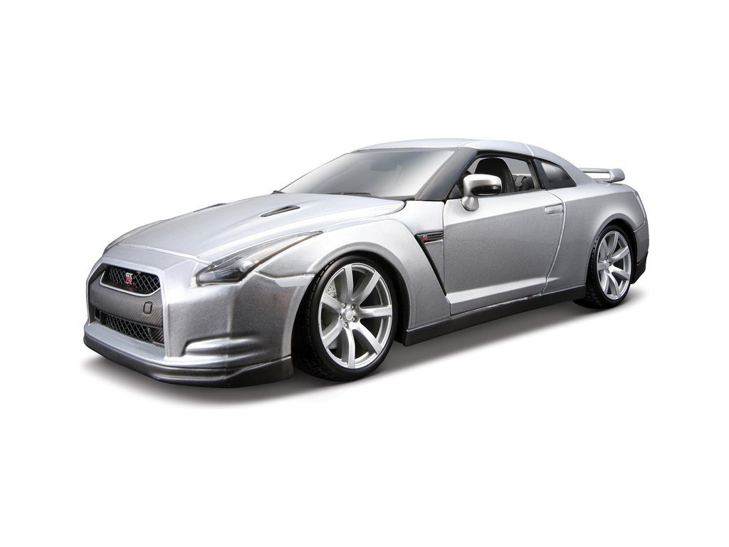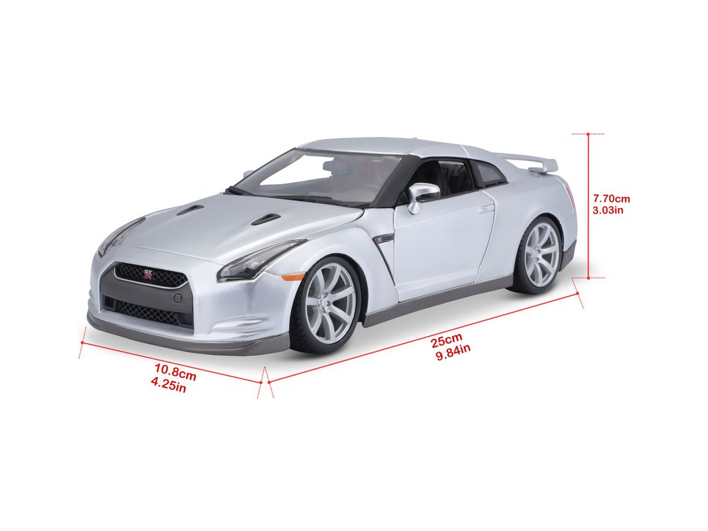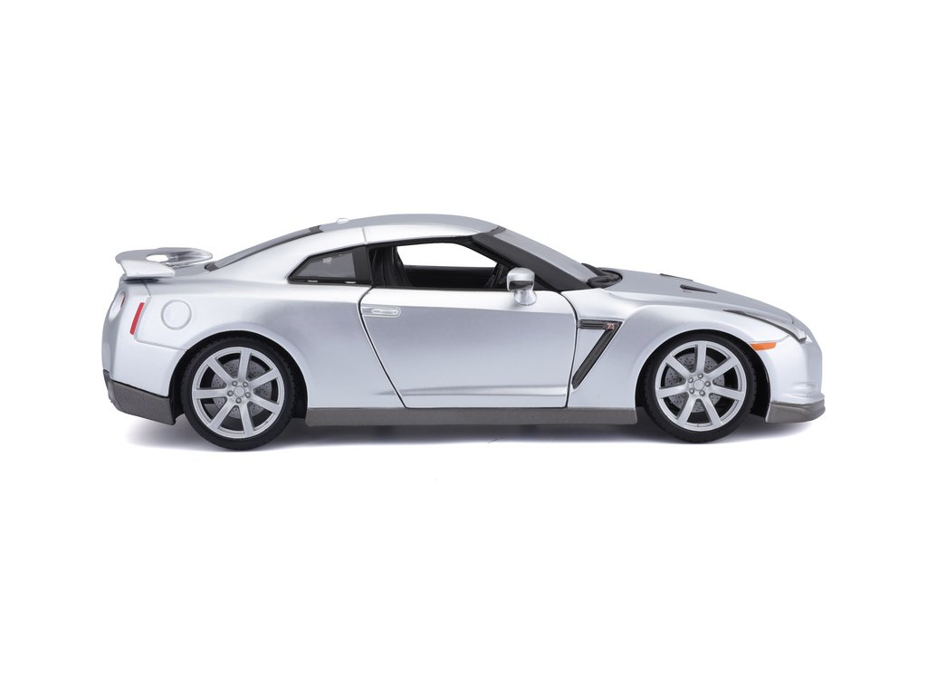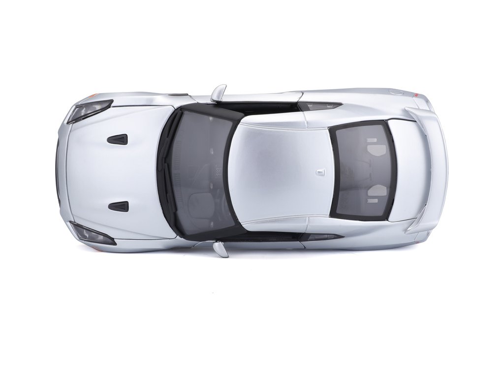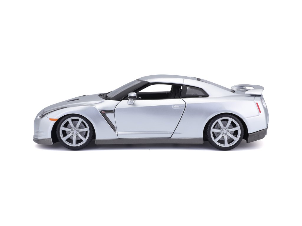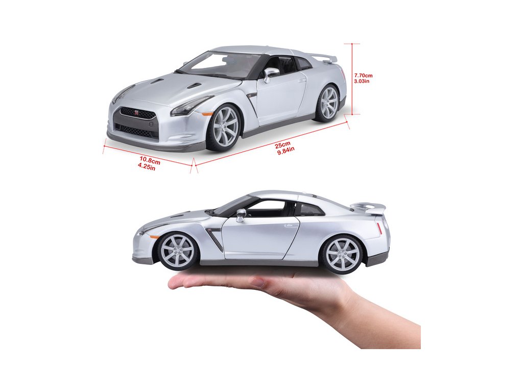 Kovový model auta 1:18 Bburago 18-12079 2009 Nissan GT-R nejen pro sběratele. Má otevírací dveře a kapotu, natáčení kol volantem je plně funkční. Barva modelu je stříbrná a je přibližně 23 cm velký